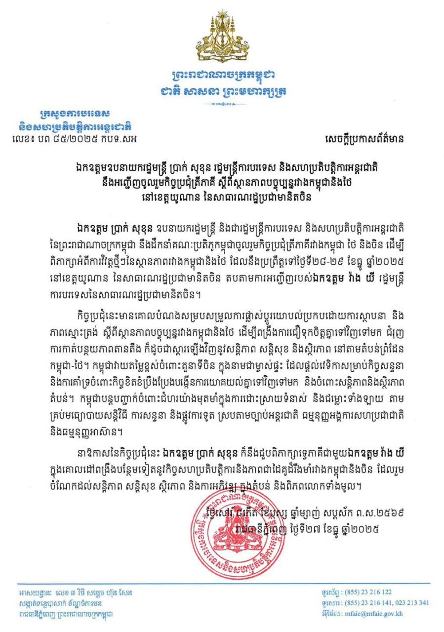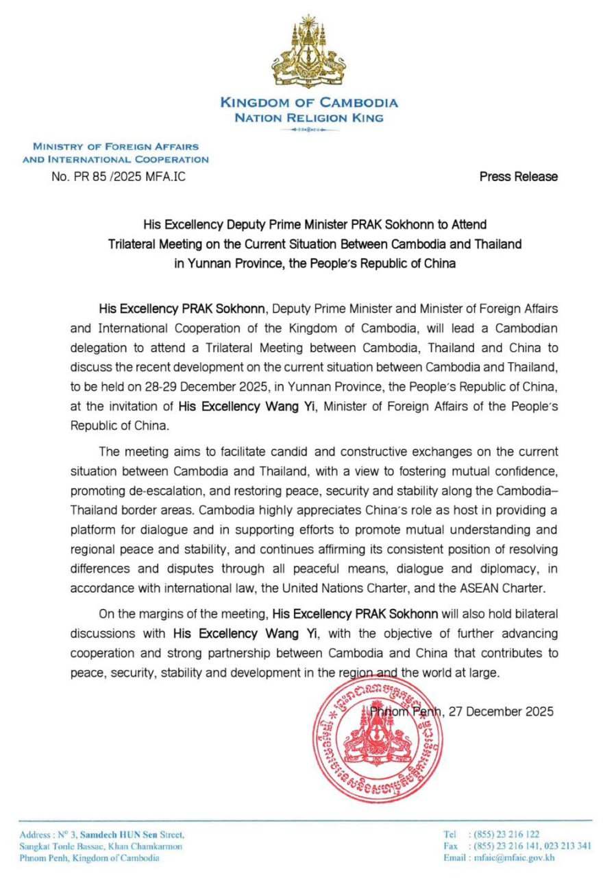 ប្រមុខការទូតកម្ពុជា នឹងអញ្ជើញចូលរួមកិច្ចប្រជុំត្រីភាគីជាមួយចិន និងថៃ ស្តីពីស្ថានភាពបច្ចុប្បន្នរវាងកម្ពុជា-ថៃ នៅខេត្តយូណាន នៃសាធារណរដ្ឋប្រជាមានិតចិន នៅថ្ងៃស្អែក