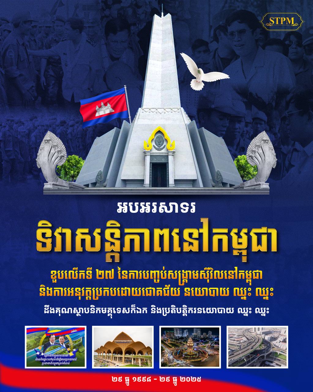 សម្តេចមហាបវរធិបតី ហ៊ុន ម៉ាណែត នាយករដ្ឋមន្ត្រីនៃព្រះរាជាណាចក្រកម្ពុជា អបអរសាទរ ទិវាសន្តិភាពនៅកម្ពុជា និងខួបលើកទី២៧ នៃការបញ្ចប់សង្គ្រាមស៊ីវិលនៅកម្ពុជា និងការអនុវត្តប្រកបដោយជោគជ័យ នយោបាយ ឈ្នះ ឈ្នះ