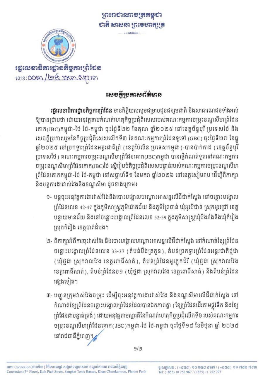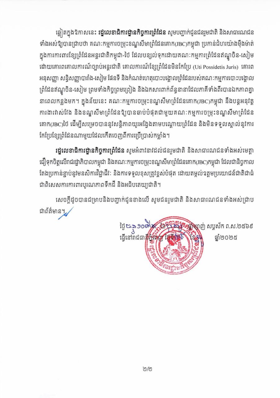 សេចក្តីប្រកាសរបស់ រដ្ឋលេខាធិការដ្ឋានកិច្ចការព្រំដែន បានបញ្ជាក់ថា គណៈកម្មការចម្រុះខណ្ឌសីមាព្រំដែនគោក (JBC) កម្ពុជា ប្រកាន់ជំហរយ៉ាងម៉ឺងម៉ាត់ ក្នុងការការពារខ្សែព្រំដែនអន្តរជាតិកម្ពុជា-ថៃ ដែលបន្សល់ទុកដោយគណៈកម្មការព្រំដែនឥណ្ឌូចិន-សៀម ដោយគោរពគោលការណ៍ច្បាប់អន្តរជាតិ គោលការណ៍ខ្សែព្រំដែនមិនកែប្រែ (Uti Possidetis Juris) គោរព អនុសញ្ញា សន្ធិសញ្ញាបារាំង-សៀម ផែនទី និងកំណត់ហេតុបោះបង្គោលព្រំដែនរបស់គណៈកម្មការបោះបង្គោល ព្រំដែនឥណ្ឌូចិន-សៀម ព្រមទាំងកិច្ចព្រមព្រៀង និងឯកសារពាក់ព័ន្ធនានាដែលភាគីទាំងពីរបានឯកភាពគ្នា នាពេលកន្លងមក។ ក្នុងន័យនេះ គណៈកម្មការចម្រុះខណ្ឌសីមាព្រំដែនគោក (JBC) កម្ពុជា នឹងបន្តអនុវត្ត ការងារវាស់វែង និងខណ្ឌសីមាព្រំដែនឱ្យបានឆាប់បំផុតជាមួយគណៈកម្មការចម្រុះខណ្ឌសីមាព្រំដែន គោក (JBC) ថៃ ដើម្បីសម្រេចបាននូវសន្តិភាពយូរអង្វែងតាមបណ្តោយព្រំដែន និងមិនទទួលស្គាល់នូវការ កែប្រែខ្សែព្រំដែនណាមួយដែលកើតចេញពីការប្រើប្រាស់កម្លាំង។