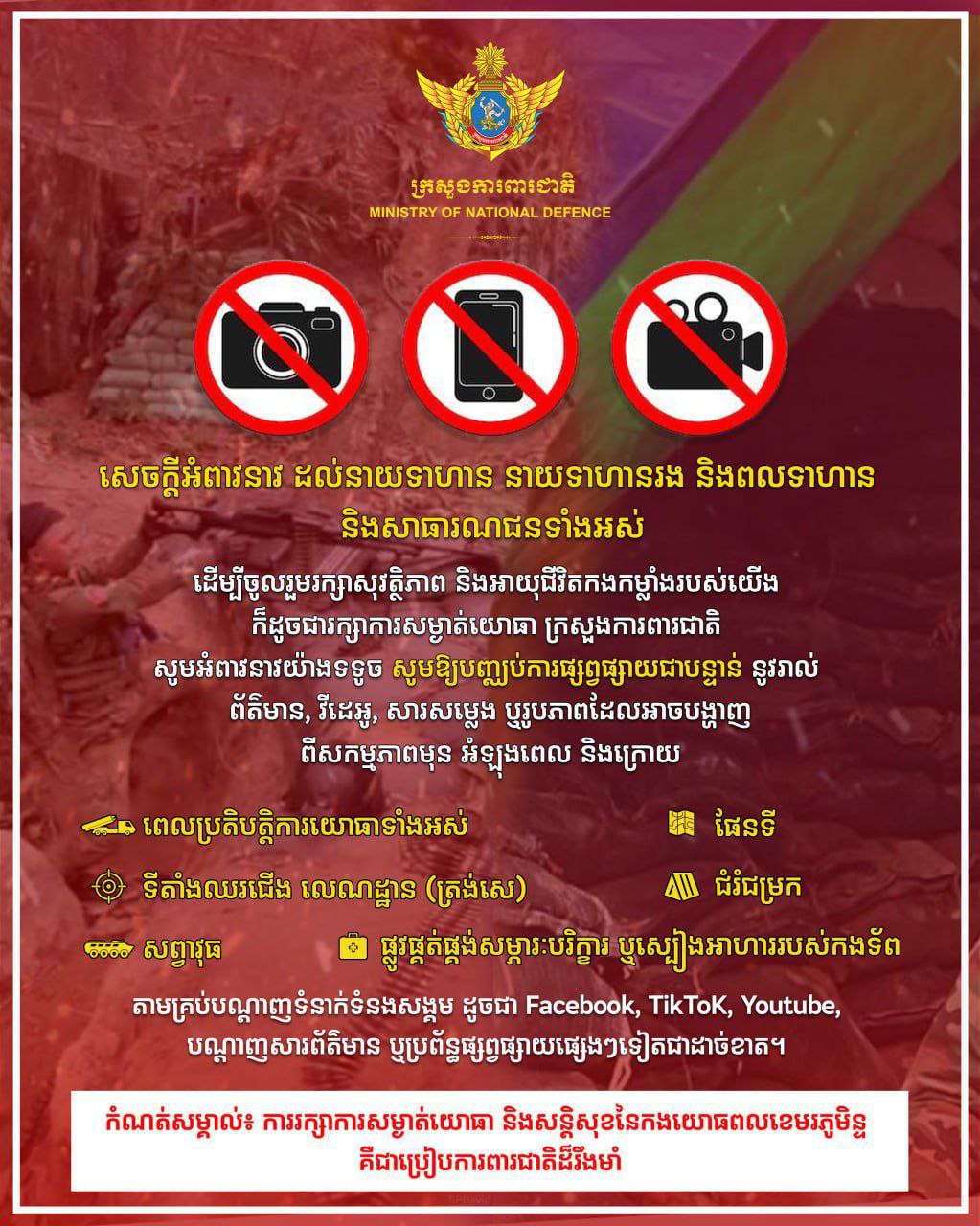 ដើម្បីចូលរួមរក្សាសុវត្ថិភាព និងអាយុជីវិតកងកម្លាំងរបស់យើង ក៏ដូចជារក្សាការសម្ងាត់យោធា ក្រសួងការពារជាតិ សូមអំពាវនាវយ៉ាងទទូច សូមឱ្យបញ្ឈប់ការផ្សព្វផ្សាយជាបន្ទាន់នូវរាល់ព័ត៌មាន, វីដេអូ, សារសម្លេង ឬរូបភាពដែលអាចបង្ហាញពីសកម្មភាពមុន អំឡុងពេល និងក្រោយពេលប្រតិបត្តិការយោធាទាំងអស់, ផែនទី, ទីតាំងឈរជើង, លេណដ្ឋាន (ត្រង់សេ), ជំរំជម្រក, សព្វាវុធ, ផ្លូវផ្គត់ផ្គង់សម្ភារបរិក្ខារ ឬស្បៀងអាហាររបស់កងទ័ព តាមគ្រប់បណ្តាញទំនាក់ទំនងសង្គមដូចជា Facebook, TikToK, Youtube, បណ្តាញសារព័ត៌មាន ឬប្រព័ន្ធផ្សព្វផ្សាយផ្សេងៗទៀតជាដាច់ខាត។