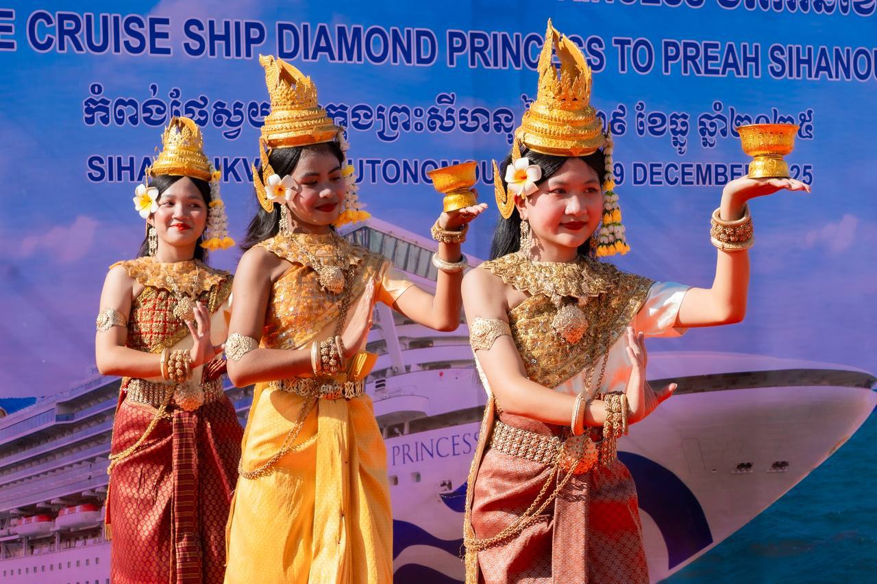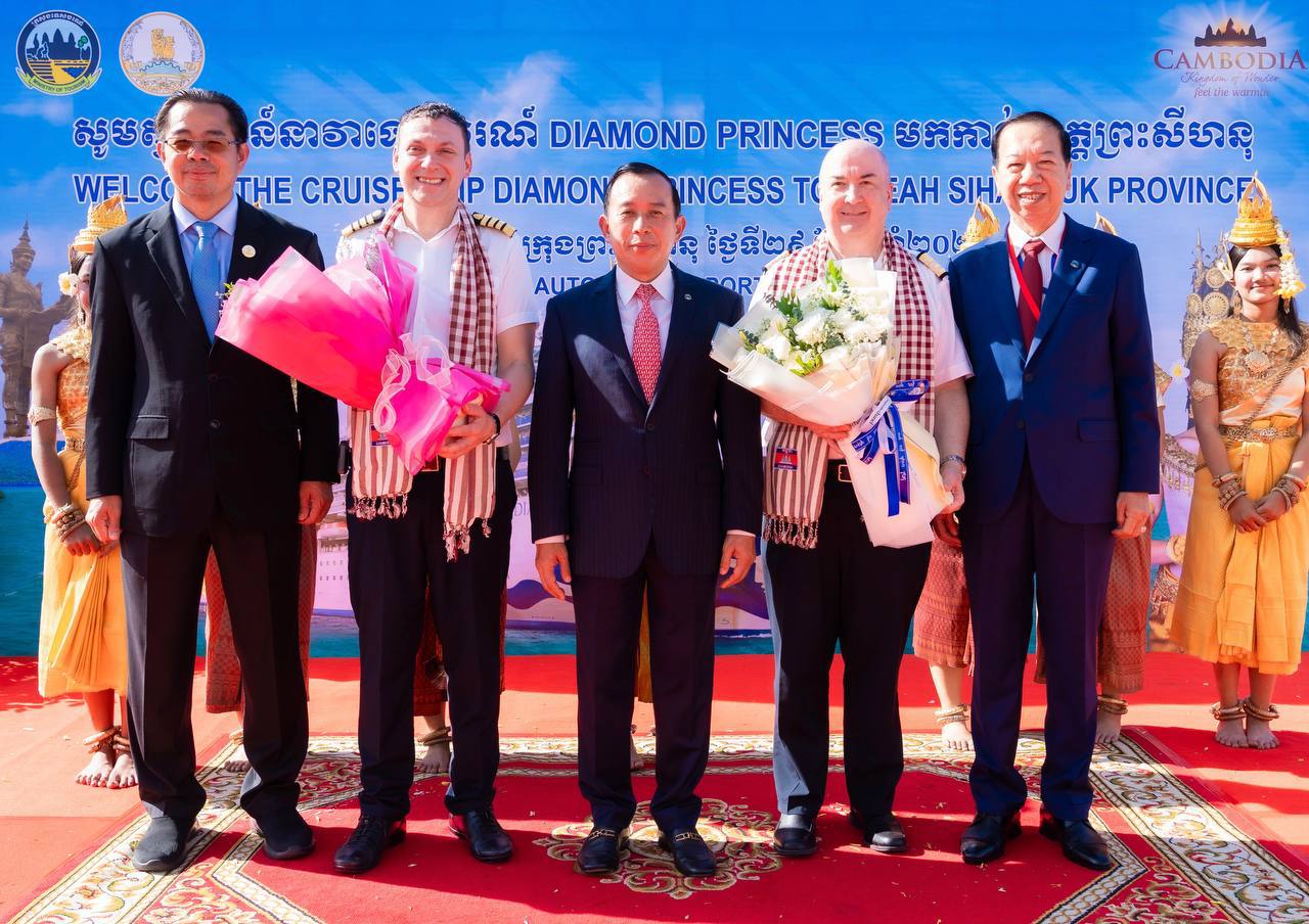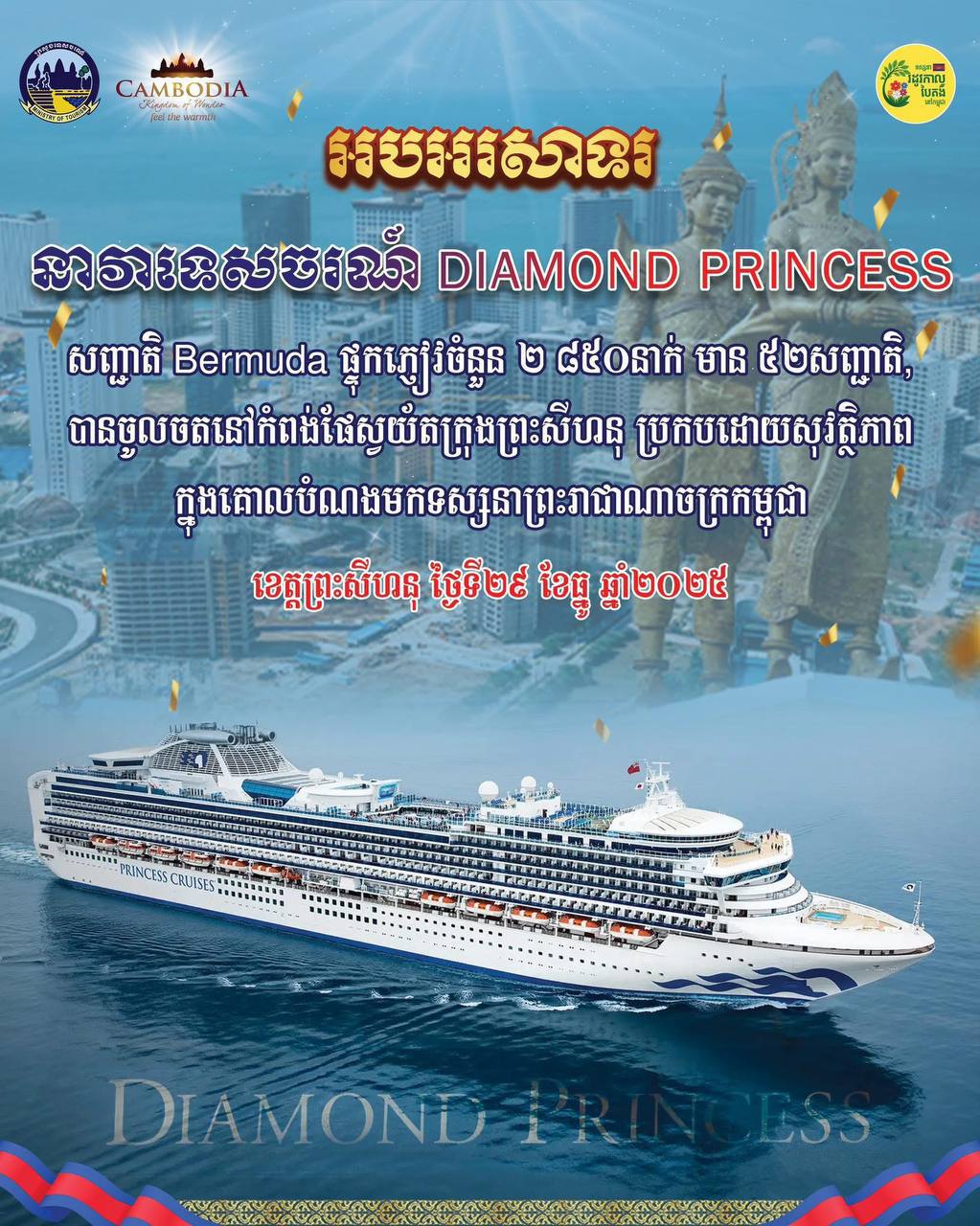 នាវាទេសចរណ៍ DIAMOND PRINCESS សញ្ជាតិ Bermuda មានបណ្ដោយប្រវែង២៨៨.៣៣ម៉ែត្រ និងទទឹងប្រវែង៣៧.៥០ម៉ែត្រ ជម្រៅ៨.៥០ម៉ែត្រ បានចូលចតនៅកំពង់ផែស្វយ័តក្រុងព្រះសីហនុ ប្រកបដោយសុវត្ថិភាព និងបាននាំភ្ញៀវទេសចរអន្តរជាតិចំនួន ២ ៨៥០នាក់ មាន៥២សញ្ជាតិ អញ្ជើញមកទស្សនាសក្តានុពលទេសចរណ៍នៅកម្ពុជារួមមាន៖ រមណីយដ្ឋានឆ្នេរក្នុងក្រុង វត្តអារាម និងផ្សារលើជាដេីម។