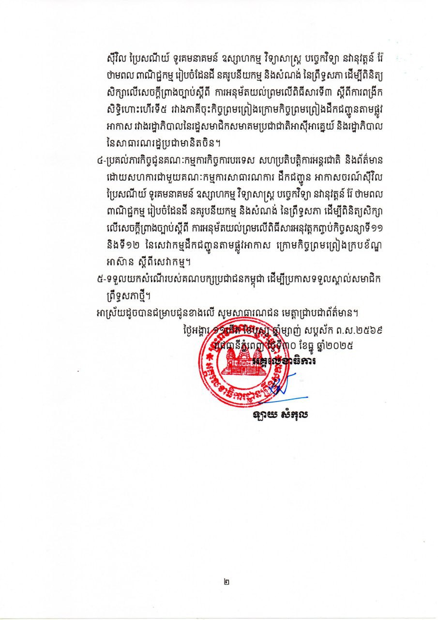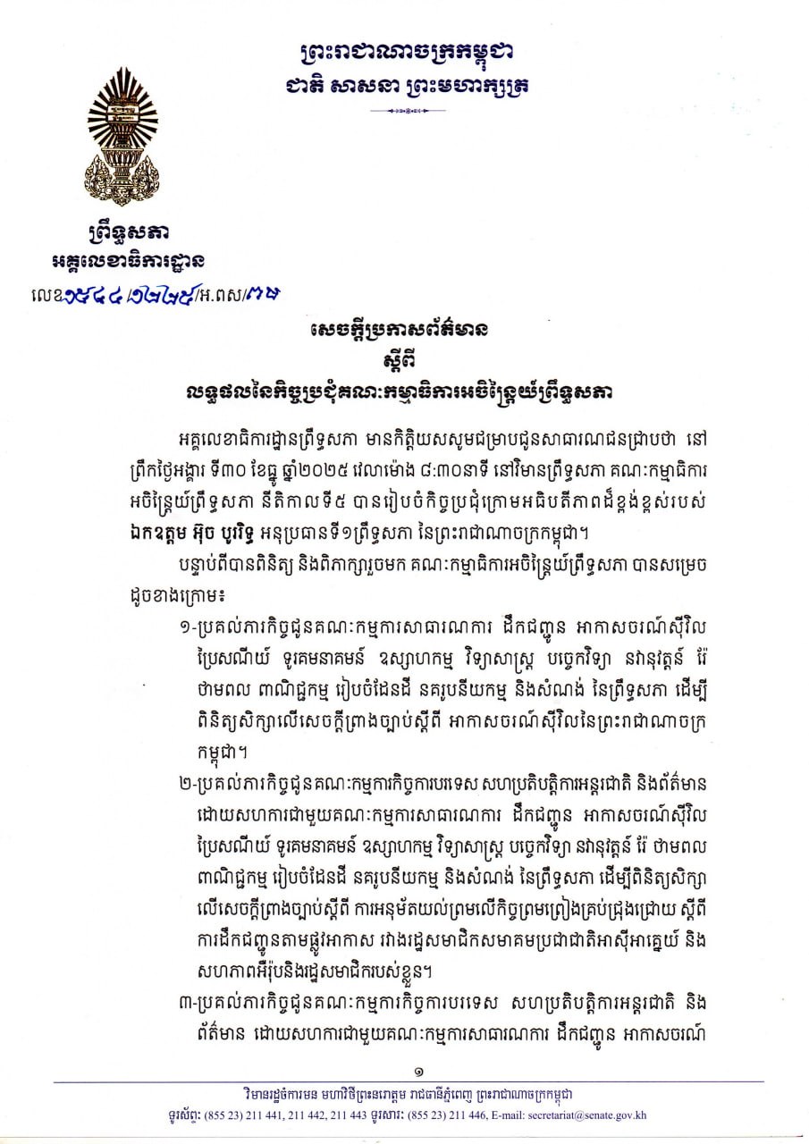 សេចក្តីប្រកាសព័ត៌មានស្តីពី លទ្ធផលនៃកិច្ចប្រជុំគណៈកម្មាធិការអចិន្ត្រៃយ៍ព្រឹទ្ធសភា នាព្រឹកថ្ងៃទី៣០ ខែធ្នូ ឆ្នាំ២០២៥