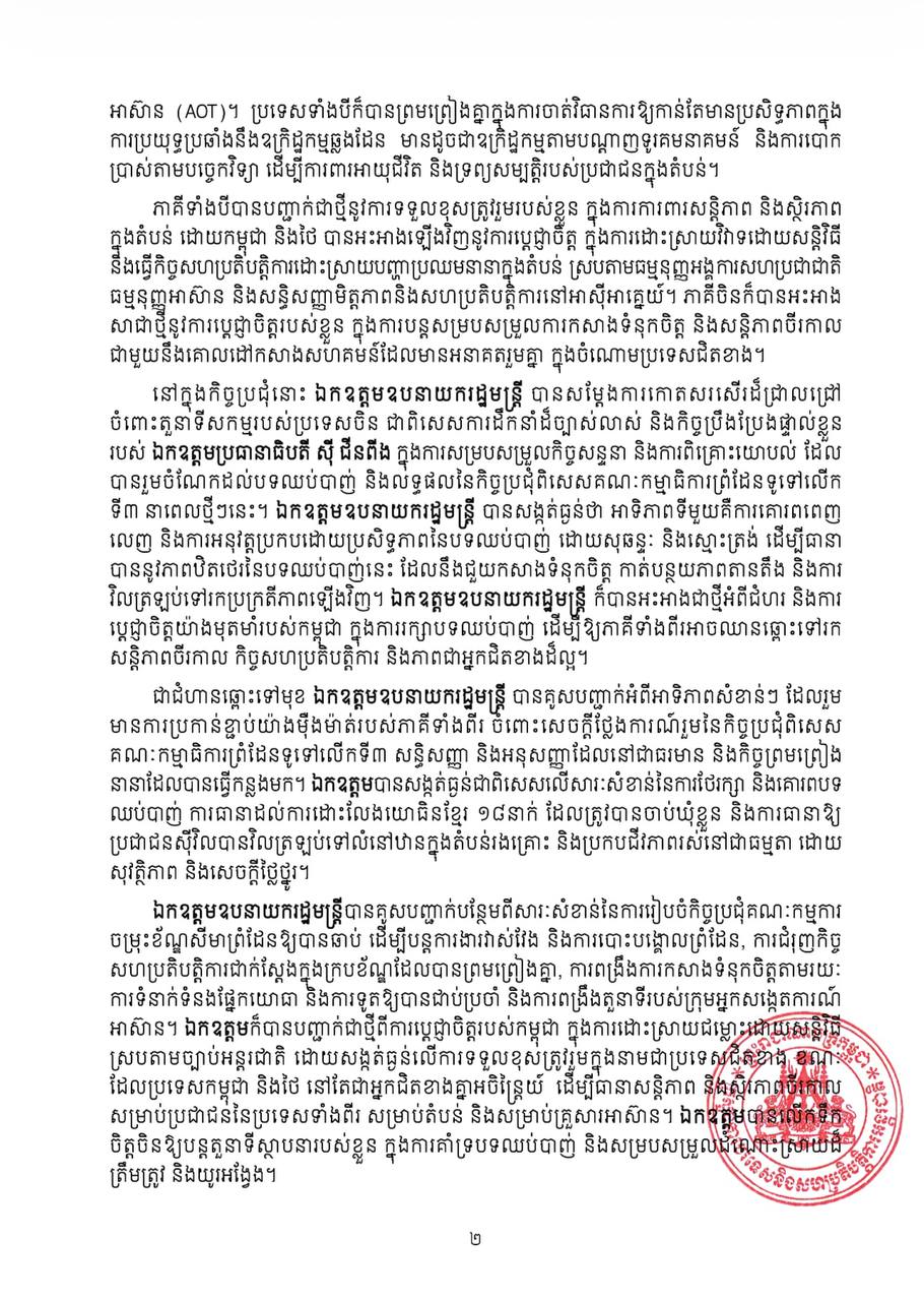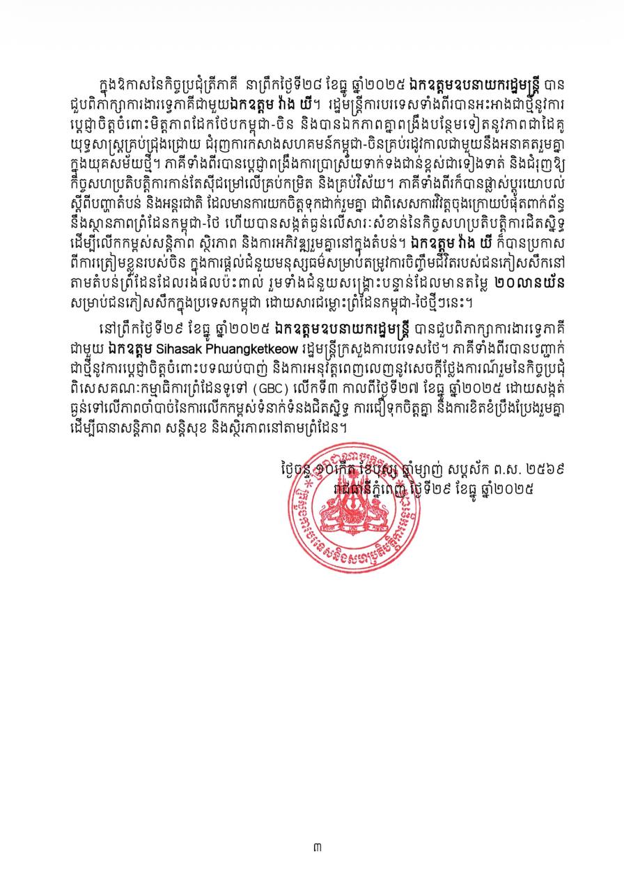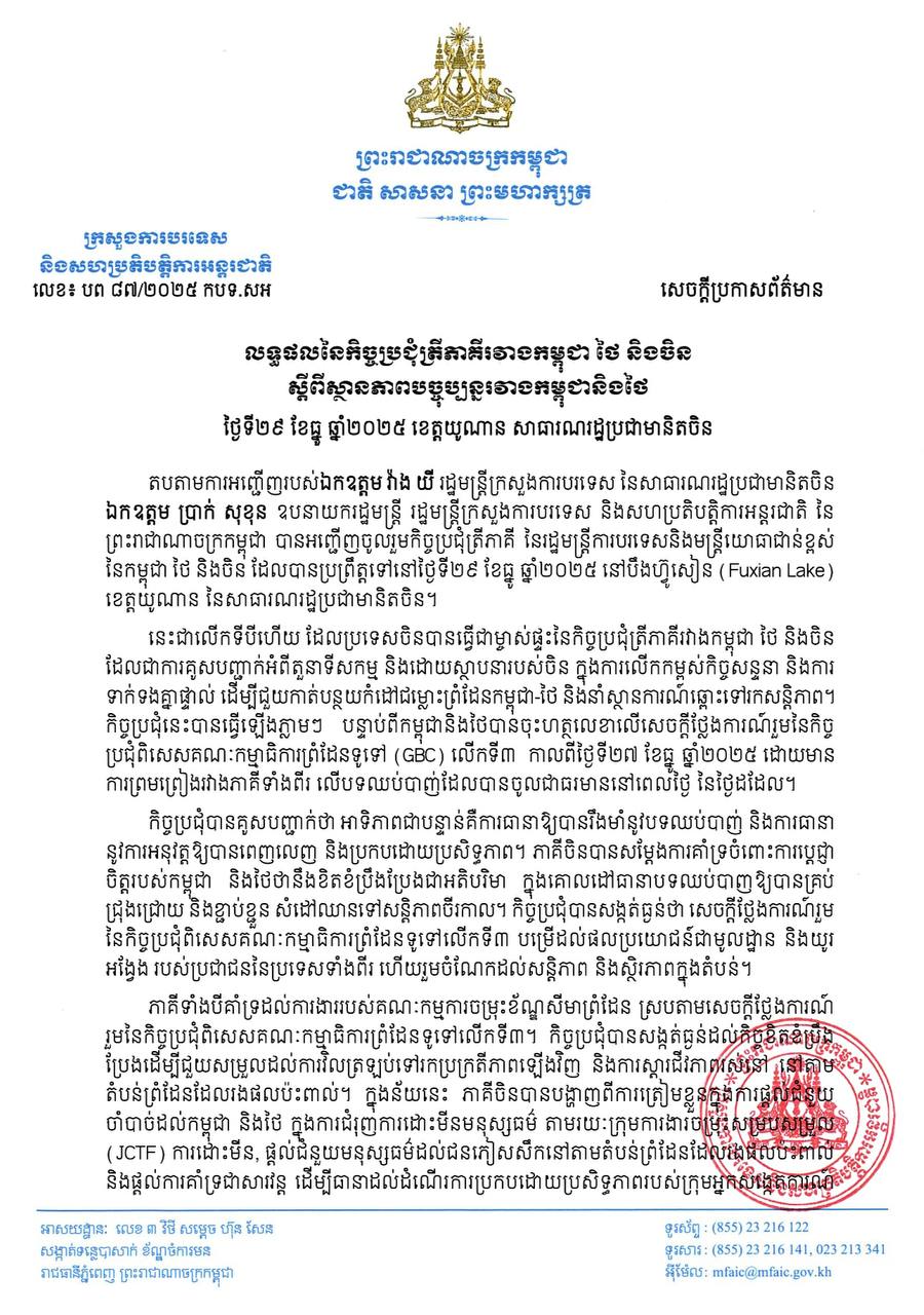 លទ្ធផលនៃកិច្ចប្រជុំត្រីភាគីរវាងកម្ពុជា ថៃ និងចិន ស្តីពីស្ថានភាពបច្ចុប្បន្នរវាងកម្ពុជានិងថៃ
