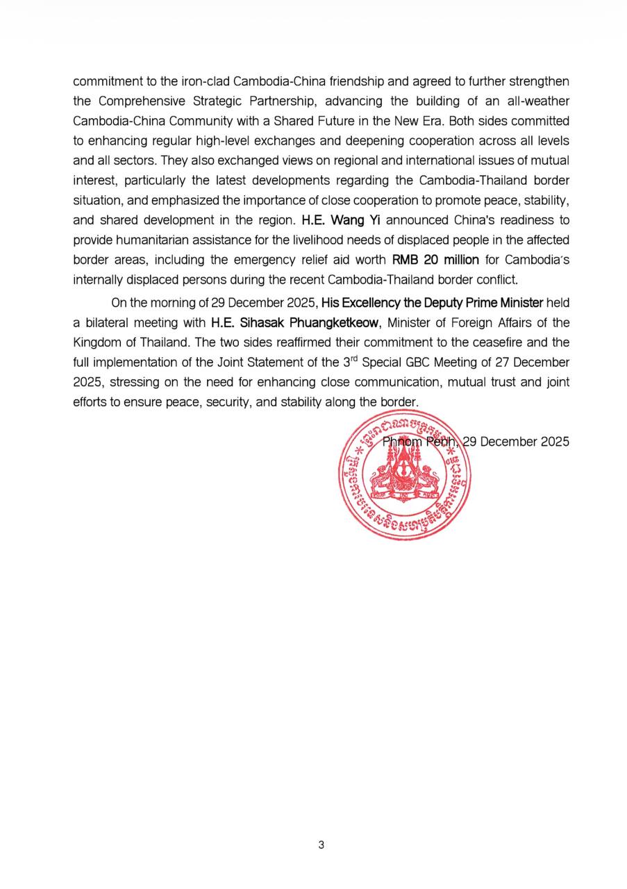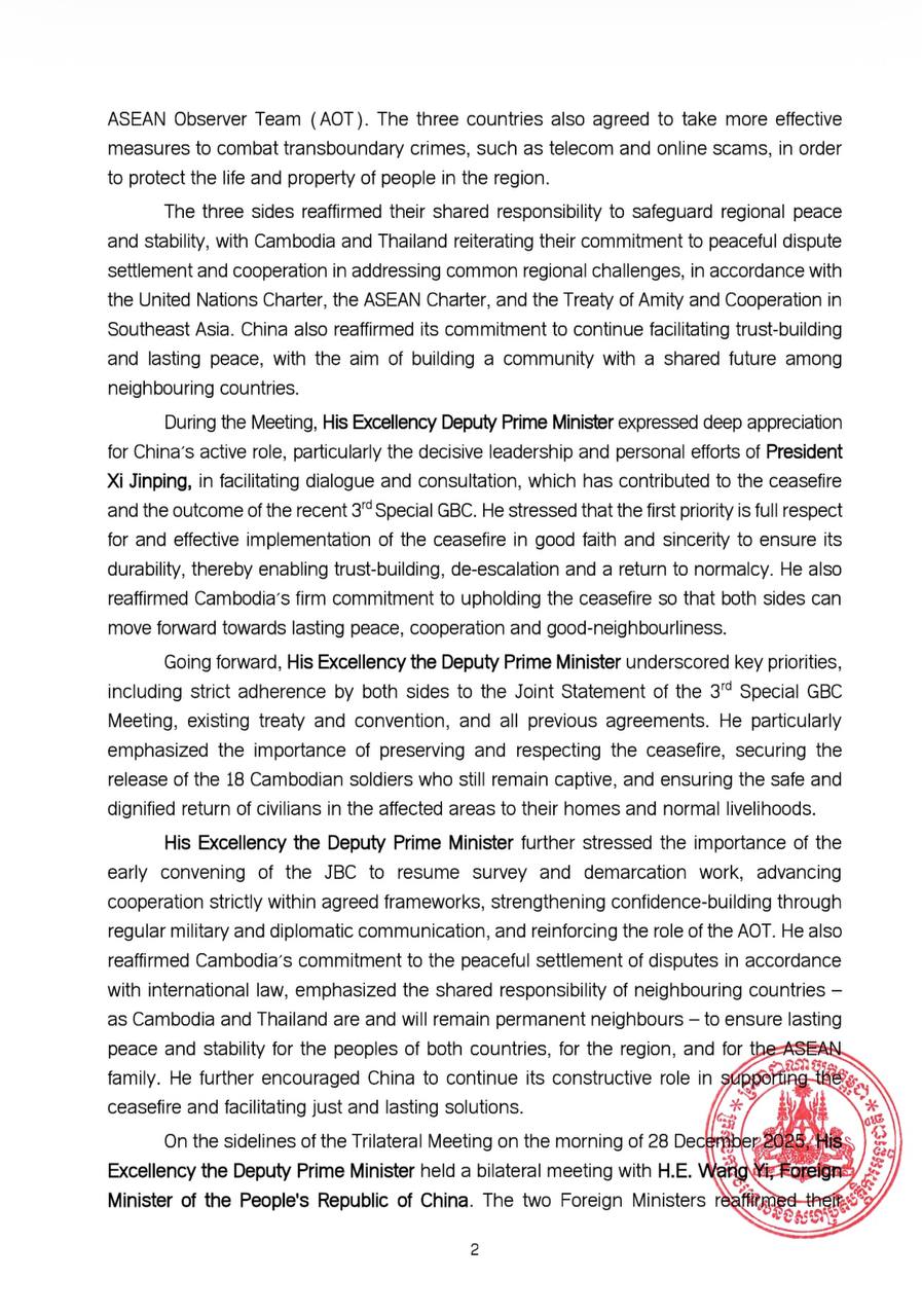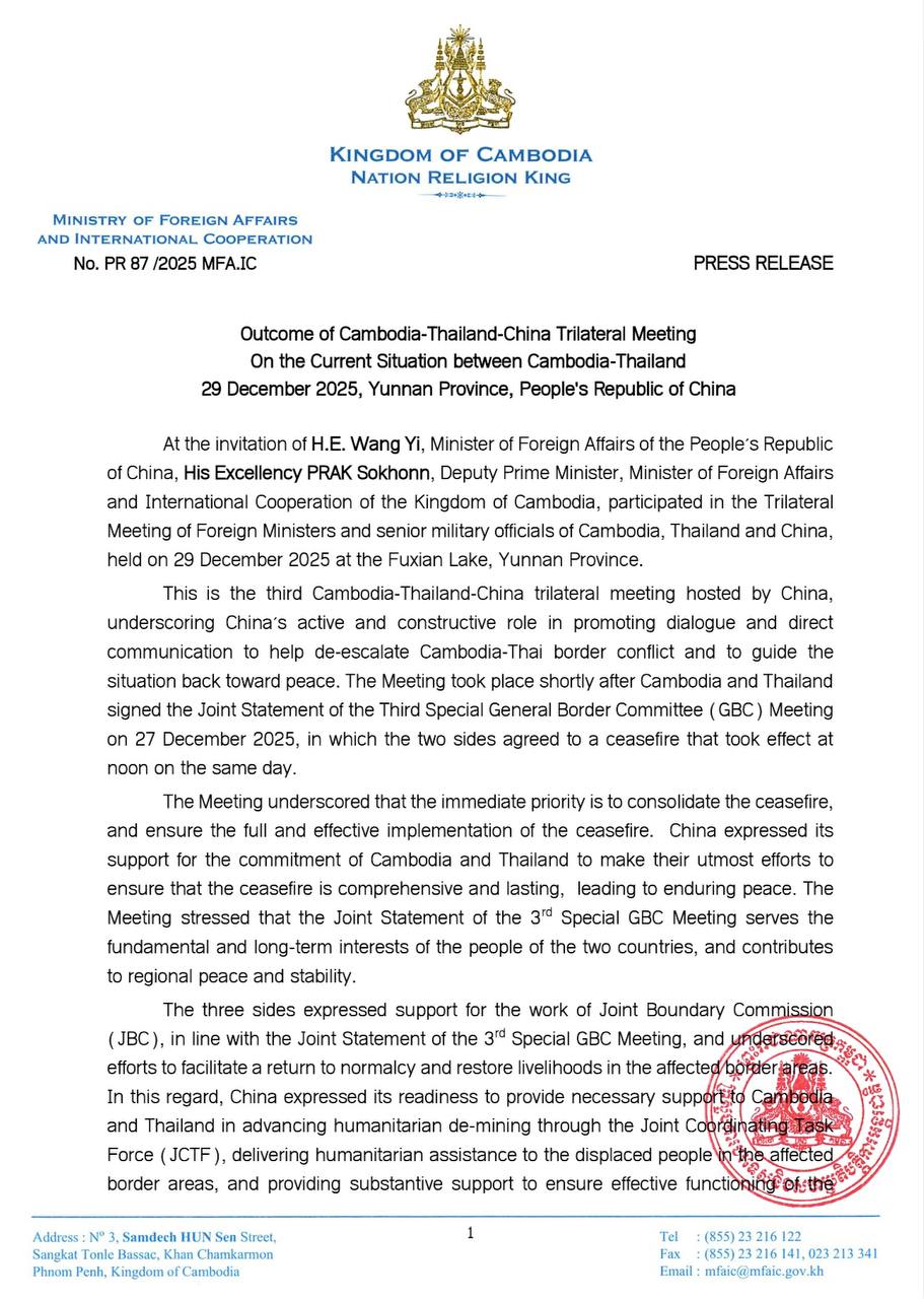 Outcome of Cambodia-Thailand-China Trilateral Meeting on the Current Situation between Cambodia-Thailand