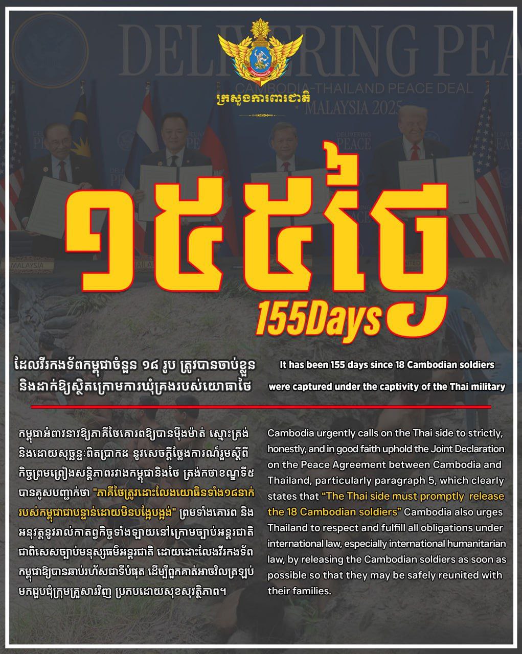 កម្ពុជាអំពាវនាវឱ្យភាគីថៃគោរពឱ្យបានម៉ឺងម៉ាត់ ស្មោះត្រង់ និងដោយសុច្ឆន្ទៈពិតប្រាកដ នូវសេចក្តីថ្លែងការណ៍រួមស្តីពីកិច្ចព្រមព្រៀងសន្តិភាពរវាងកម្ពុជានិងថៃ ត្រង់កថាខណ្ឌទី៥ បានគូសបញ្ជាក់ថា “ភាគីថៃត្រូវដោះលែងយោធិនទាំង១៨នាក់របស់កម្ពុជាជាបន្ទាន់ដោយមិនបង្អែបង្អង់” ព្រមទាំងគោរពនិងអនុវត្តនូវរាល់កាតព្វកិច្ចទាំងឡាយនៅក្រោមច្បាប់អន្តរជាតិ ជាពិសេសច្បាប់មនុស្សធម៌អន្តរជាតិ ដោយដោះលែងវីរកងទ័ពកម្ពុជាឱ្យបានឆាប់រហ័សជាទីបំផុត ដើម្បីពួកគាត់អាចវិលត្រឡប់មកជួបជុំក្រុមគ្រួសារវិញ ប្រកបដោយសុខសុវត្ថិភាព។