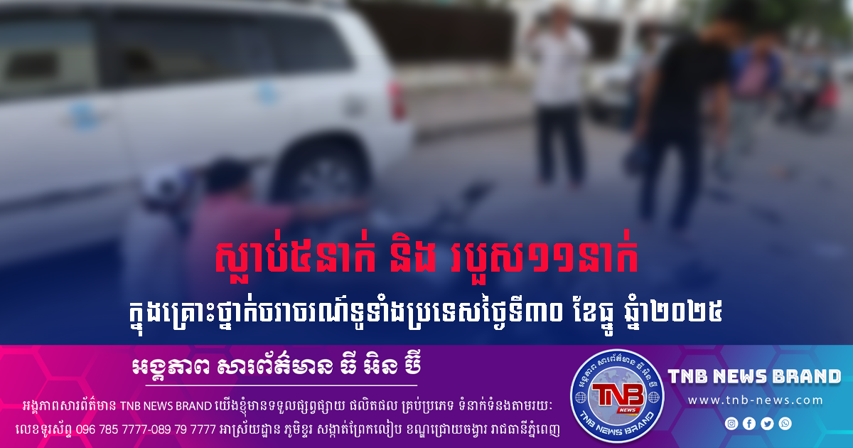 ស្លាប់៥នាក់ និងរបួស១១នាក់ ក្នុងគ្រោះថ្នាក់ចរាចរណ៍ទូទាំងប្រទេសថ្ងៃទី៣០ ខែធ្នូ ឆ្នំា២០២៥