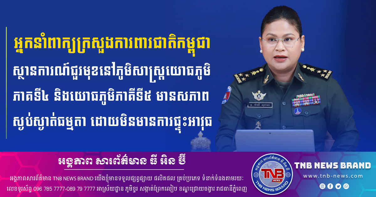 អ្នកនាំពាក្យក្រសួងការពារជាតិកម្ពុជា ស្ថានការណ៍ជួរមុខនៅភូមិសាស្រ្តយោធភូមិភាគទី៤ និងយោធភូមិភាគីទី៥ មានសភាពស្ងប់ស្ងាត់ធម្មតា ដោយមិនមានការផ្ទុះអាវុធ