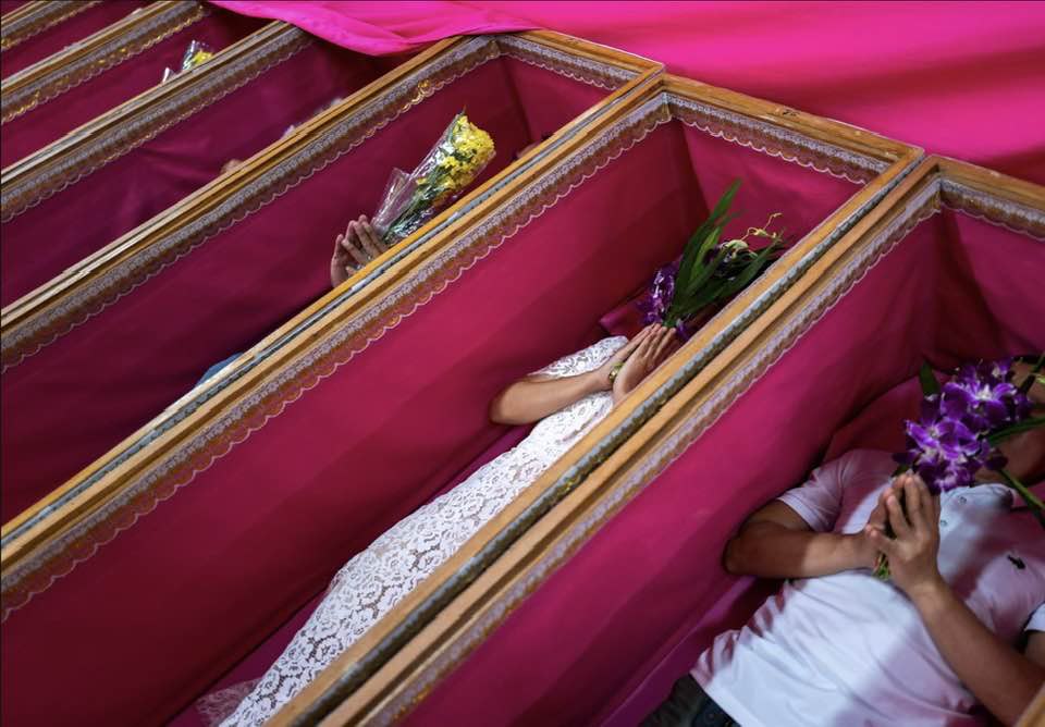 ខេត្ត Nonthaburi ប្រទេសសៀម : ជនជាតិសៀមមានជំនឿថា ចូលដេកក្នុងមឈូសពេលឆ្លងឆ្នាំធ្វើអោយជ្រះចង្រៃ – រូបថតកាសែត The Guardian ចេញផ្សាយថ្ងៃទី ១ មករា ២០២៦ ៕