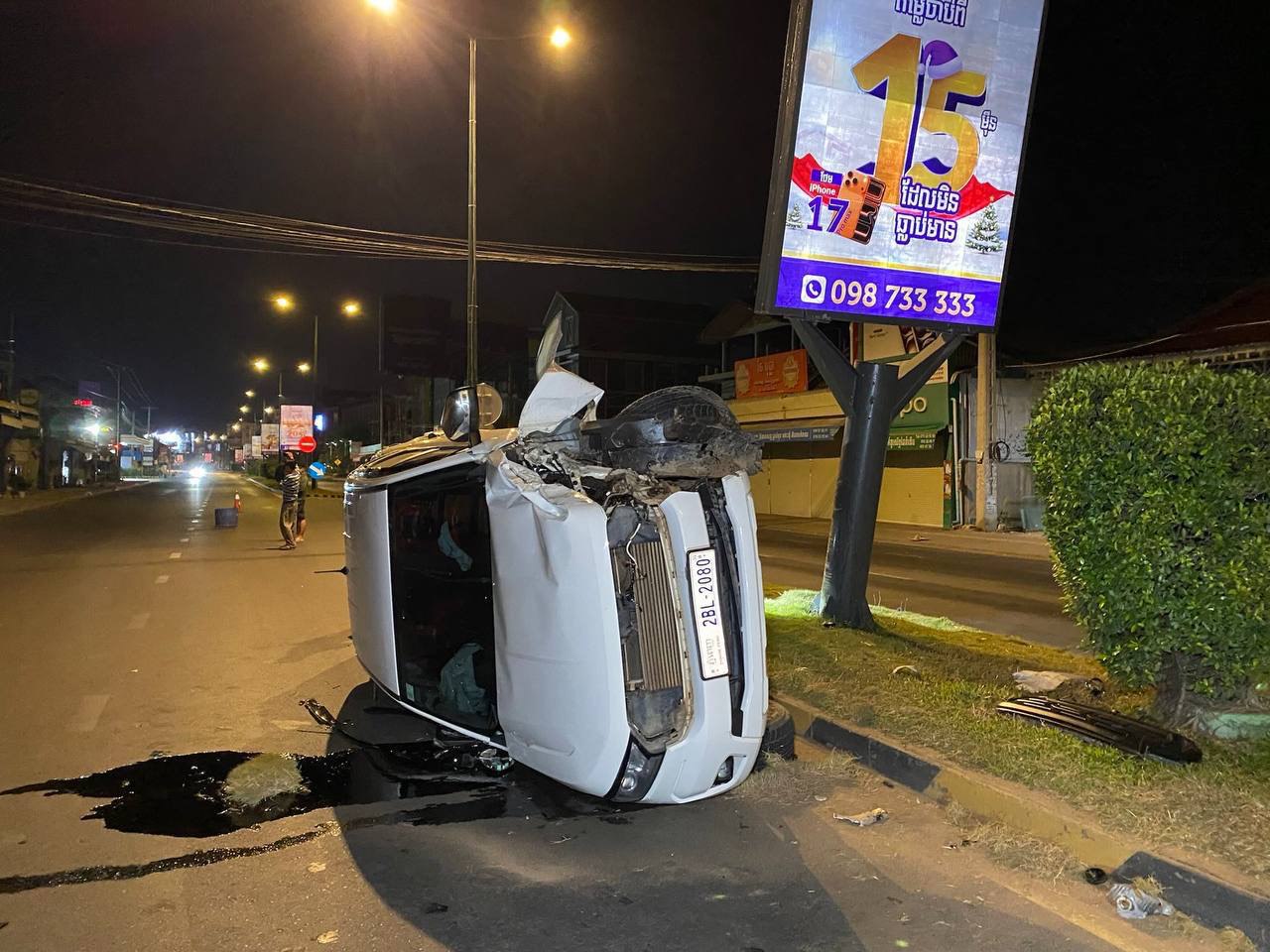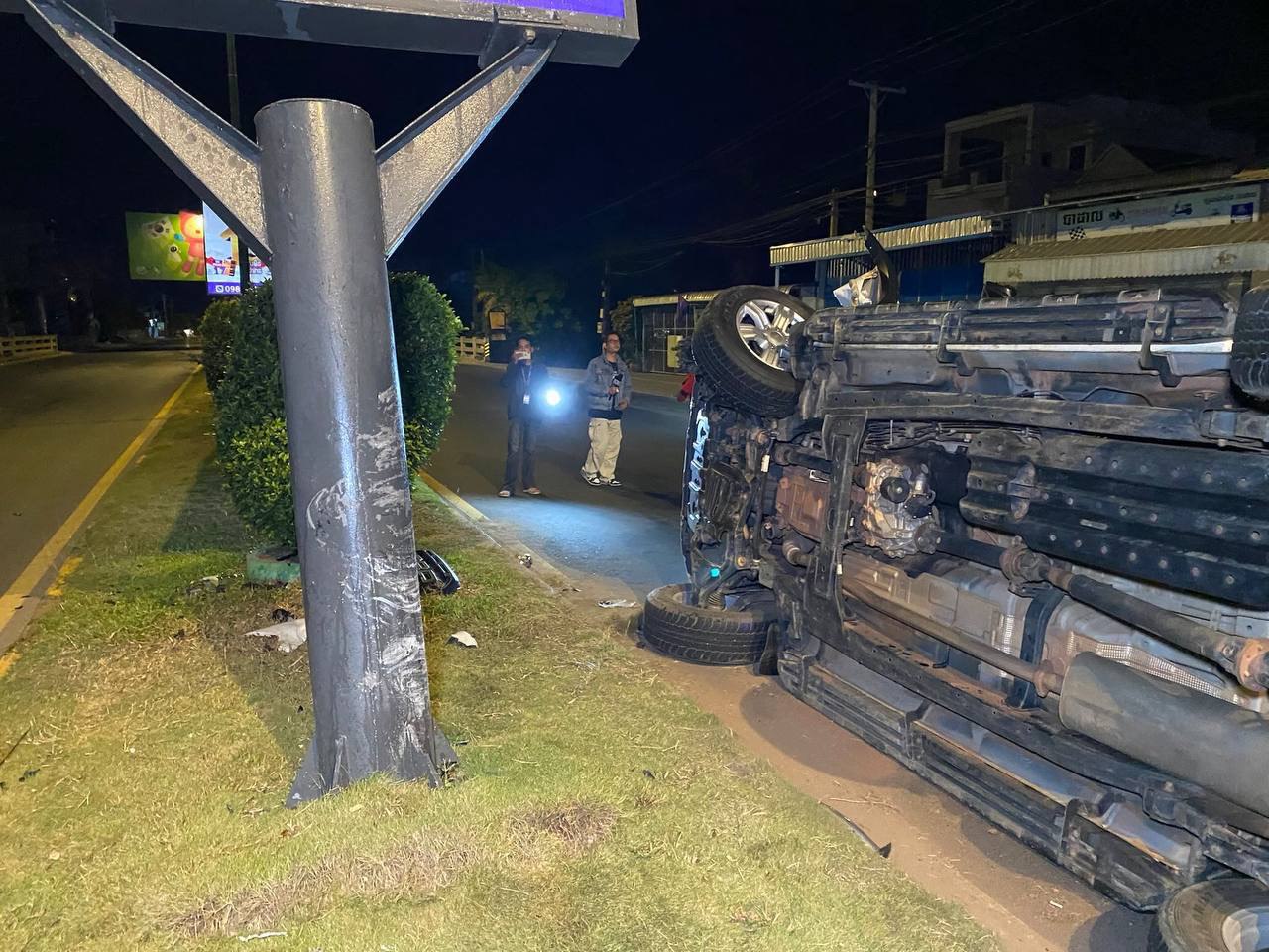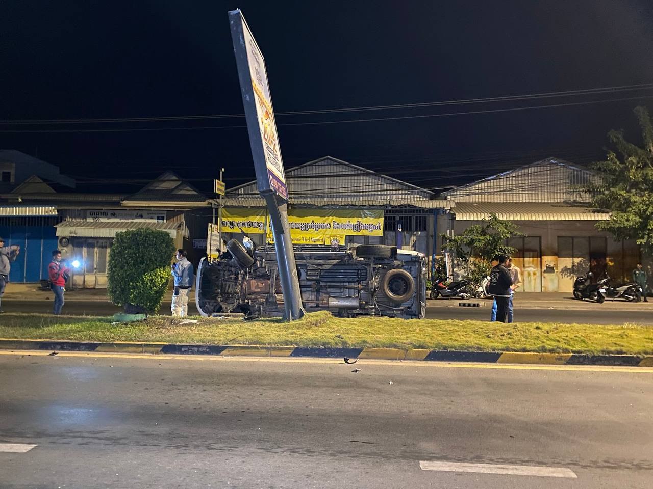 រថយន្តមួយគ្រឿង បេីកឡើងសួនផ្លូវទៅបុកបង្គោលស្លាកប៉ាណូ ក្រឡាប់ផ្ងារជើង