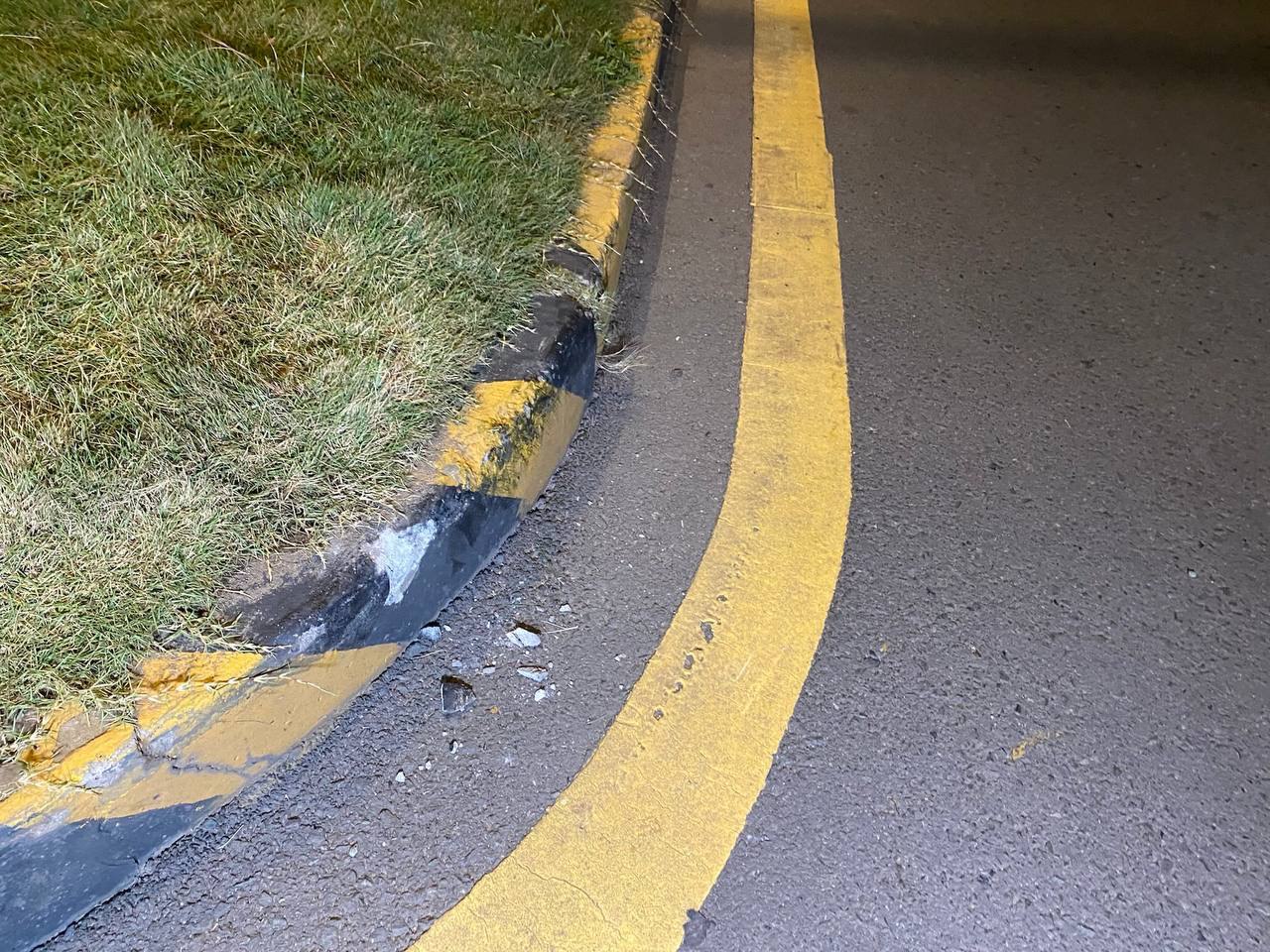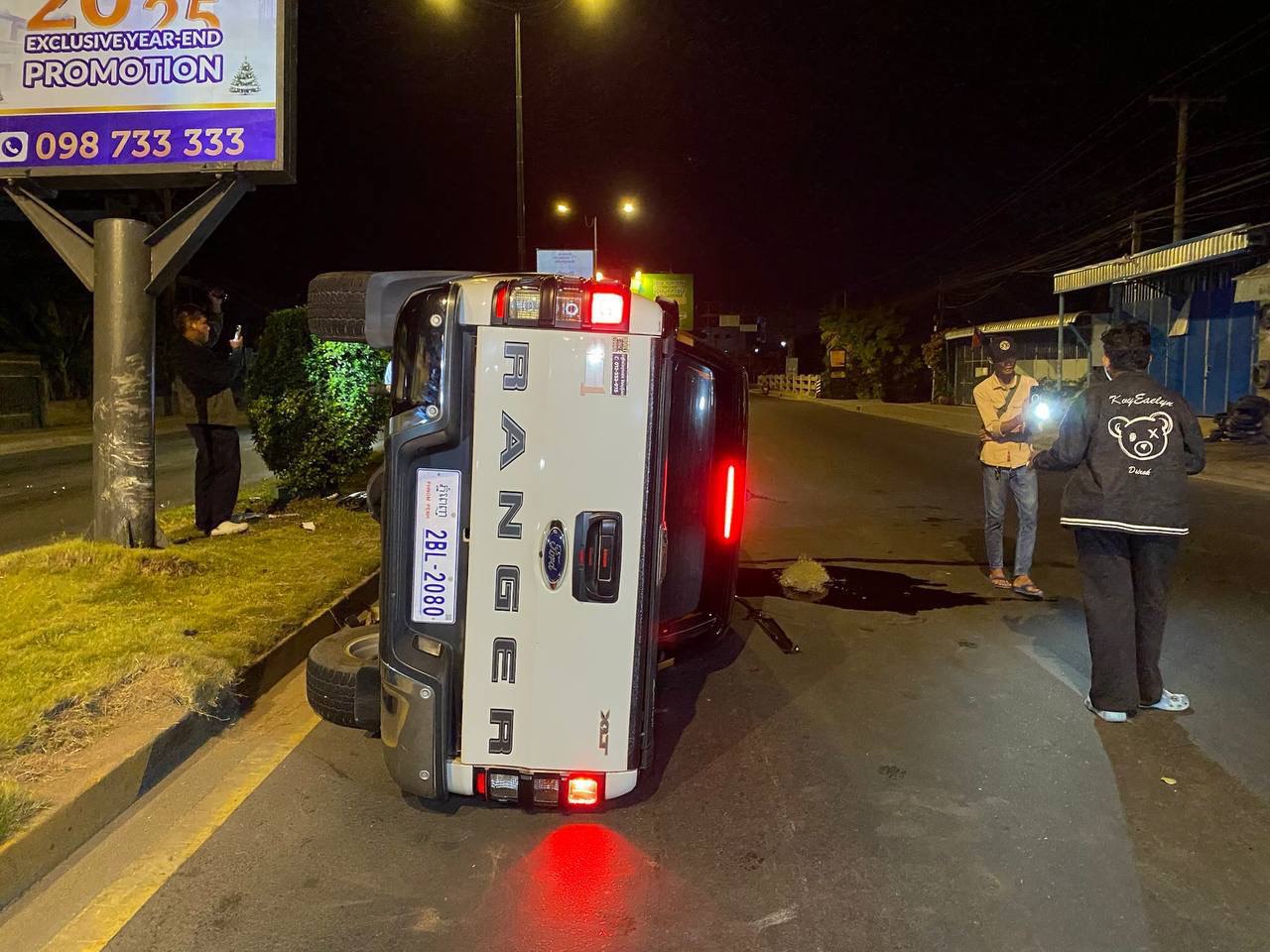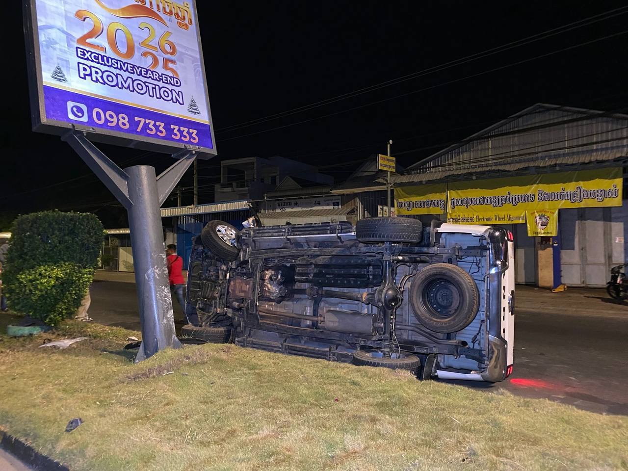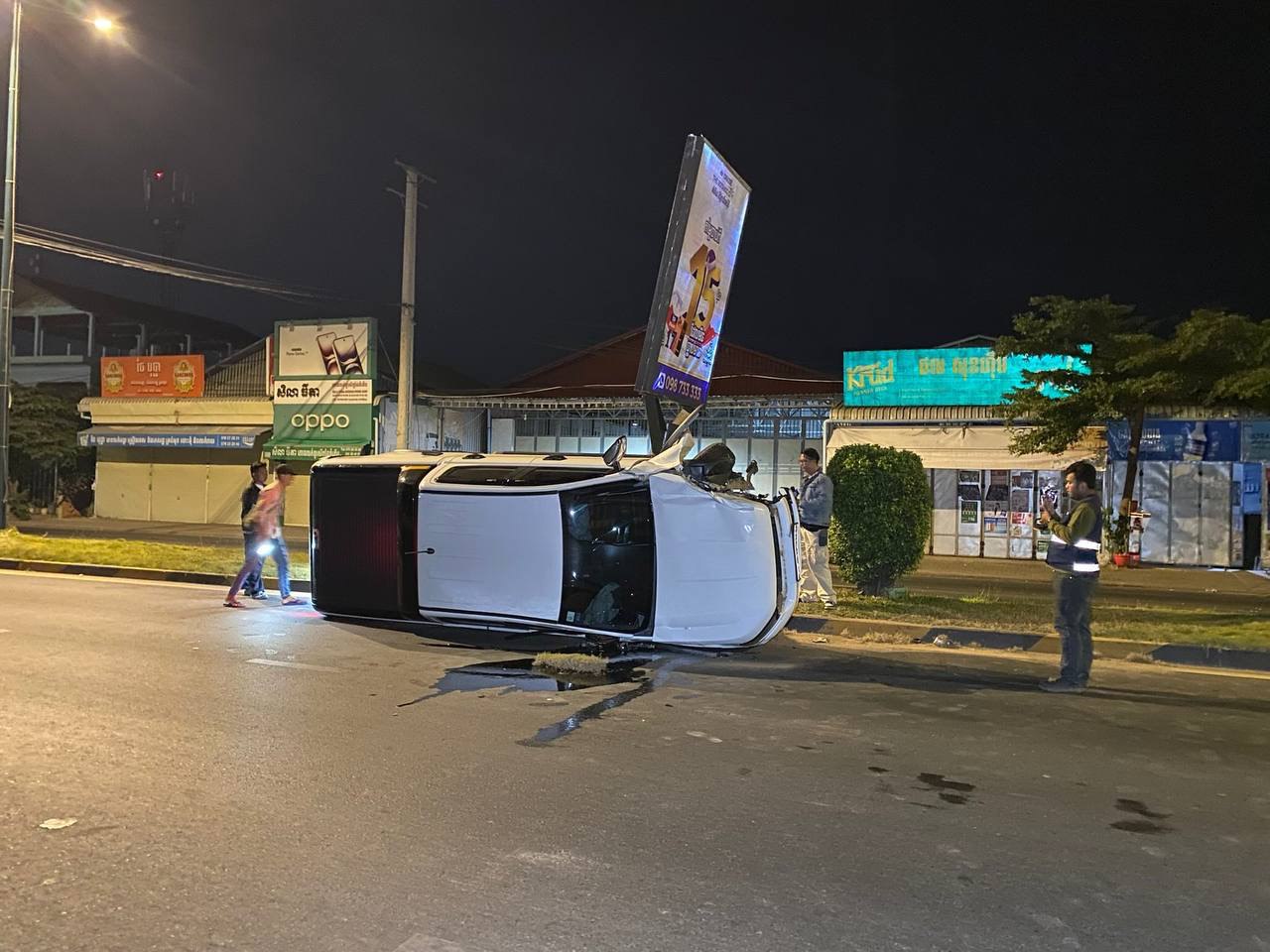 រថយន្តមួយគ្រឿង បេីកឡើងសួនផ្លូវទៅបុកបង្គោលស្លាកប៉ាណូ ក្រឡាប់ផ្ងារជើង
