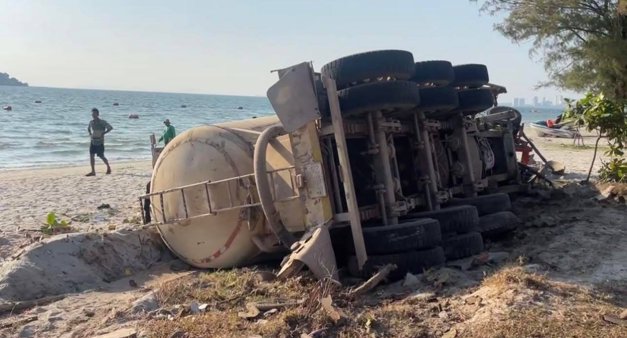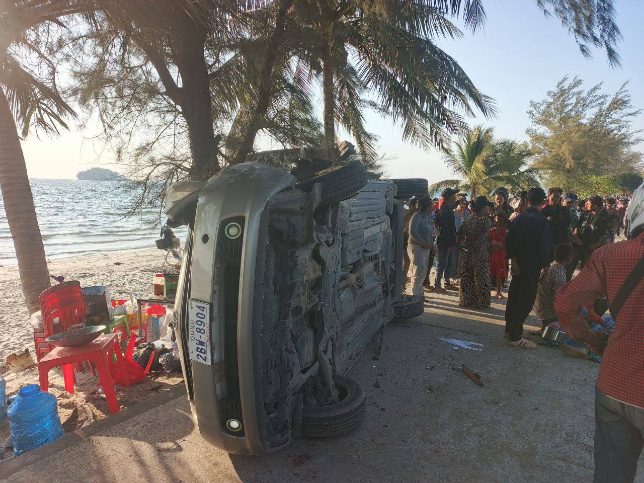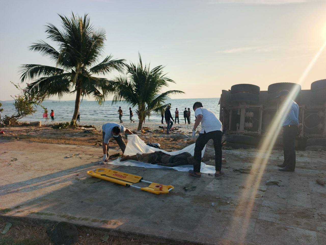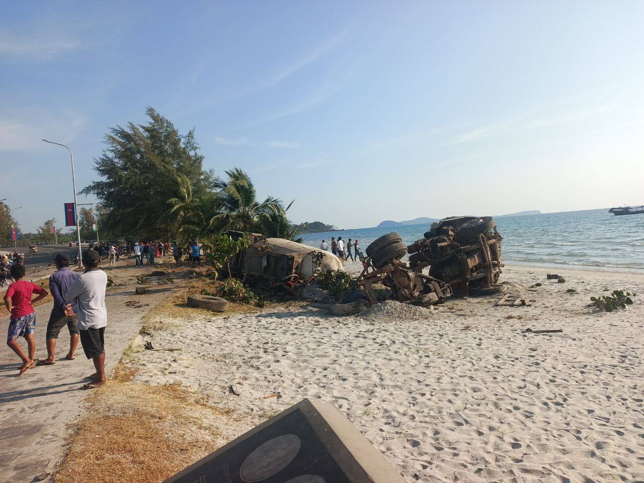 (ព្រះសីហនុ)៖ រថយន្តដឹកសុីម៉ង់ត៍មួយគ្រឿងបុករះ រួចក្រឡាប់ទៅលើដីឆ្នេរសមុទ្រ បណ្តាលឲ្យមានមនុស្សស្លាប់ និងរបួសព្រមទាំងខូចខាតយានយន្តច្រើនគ្រឿងទៀត ខណៈជនបង្កកំពុងឃាត់ខ្លួន នៅផ្លូវចុងឆ្នេរអូរត្រេះ ខេត្តព្រះសីហនុ។