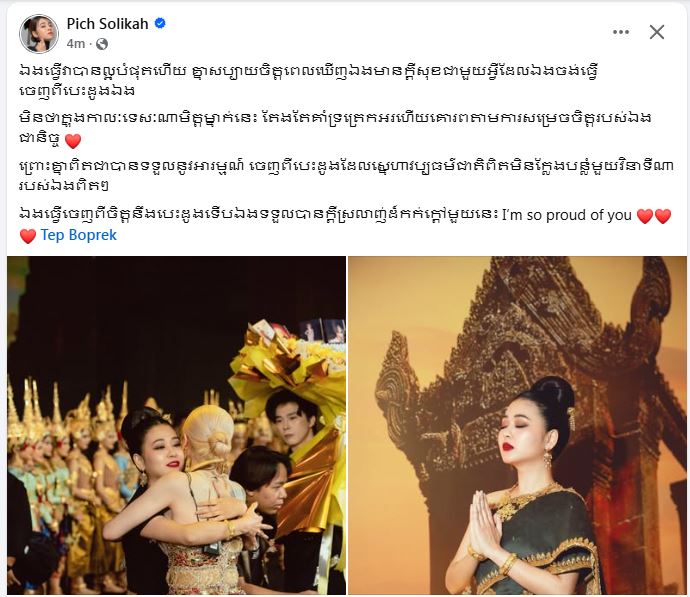 ពេជ្រ សូលីកា បានរៀបរាប់ថា «ឯងធ្វើវាបានល្អបំផុតហើយ គ្នាសប្បាយចិត្តពេលឃើញឯងមានក្ដីសុខជាមួយអ្វីដែលឯឯចង់ធ្វើចេញពីបេះដូងឯង មិនថាក្នុងកាលៈទេសៈណាមិត្តម្នាក់នេះ តែងតែគាំទ្រត្រេកអរ ហើយគោរពតាមការសម្រេចចិត្តរបស់ឯងជានិច្ច។ ព្រោះគ្នាពិតជាបានទទួលនូវអារម្មណ៍ ចេញពីបេះដូងដែលស្នេហាវប្បធម៌ជាតិពិតមិនក្លែងបន្លំមួយវិនាទីណារបស់ឯងពិតៗ។ ឯងធ្វើចេញពីចិត្ត និង បេះដូងទើបឯងទទួលបានក្ដីស្រលាញ់ដ៏កក់ក្ដៅមួយនេះ I’m so proud of you»៕
