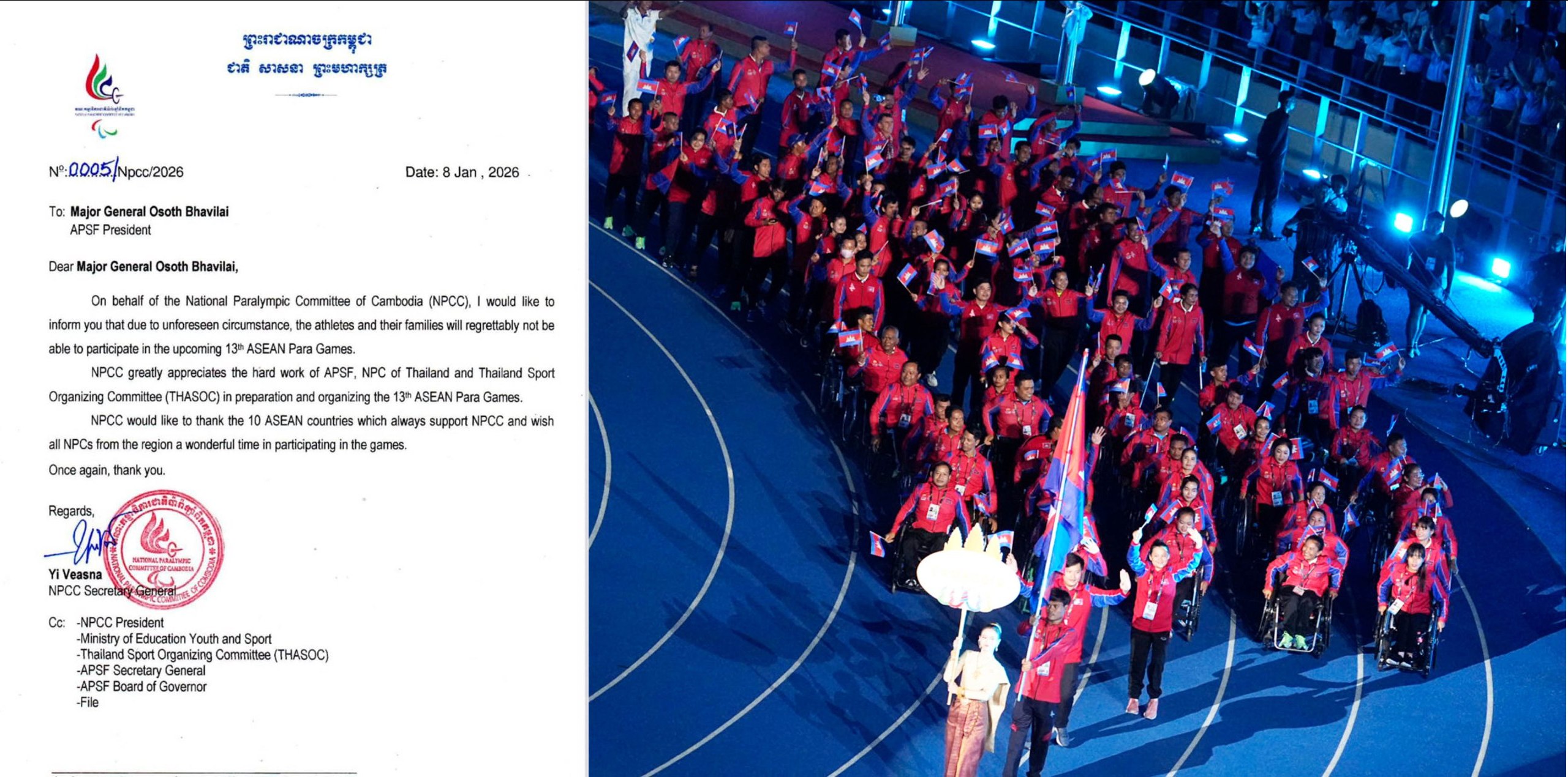 នៅក្នុងលិខិតផ្លូវការរបស់ឯកឧត្តម យី វាសនា អគ្គលេខាធិការ គណៈកម្មាធិការជាតិប៉ារ៉ាឡាំពិកកម្ពុជា (NPCC) ផ្ញើជូនលោក Osoth Bhavilai ប្រធានសហព័ន្ធកីឡាប៉ារ៉ាហ្គេមអាស៊ាន (APSF) កាលពីសប្តាហ៍មុននេះបានឱ្យដឹងថា «ក្នុងនាមគណៈកម្មាធិការជាតិប៉ារ៉ាឡាំពិកកម្ពុជា (NPCC) សូមជម្រាបជូនថា ដោយសារកាលៈទេសៈដែលមិនបានមើលឃើញទុកជាមុន អត្តពលិក និងក្រុមគ្រួសាររបស់អត្តពលិកនឹងមិនអាចចូលរួម ក្នុងការប្រកួតកីឡាអាស៊ីអាគ្នេយ៍ប៉ារ៉ាហ្គេម លើកទី១៣ ខាងមុខនេះបានទេ។ NPCC សូមកោតសរសើរយ៉ាងខ្លាំងចំពោះការខិតខំប្រឹងប្រែងរបស់ APSF, NPC នៃប្រទេសថៃ និងគណៈកម្មាធិការរៀបចំកីឡាថៃ (THASOC) ក្នុងការរៀបចំ និងរៀបចំការប្រកួតកីឡាអាស៊ីអាគ្នេយ៍ប៉ារ៉ាហ្គេមលើកទី១៣។ NPCC សូមថ្លែងអំណរគុណដល់ប្រទេសអាស៊ានទាំង១០ ដែលតែងតែគាំទ្រ NPCC និងសូមជូនពរឱ្យ NPC ទាំងអស់មកពីតំបន់នេះ ទទួលបានពេលវេលាដ៏អស្ចារ្យក្នុងការចូលរួមក្នុងការប្រកួត»។