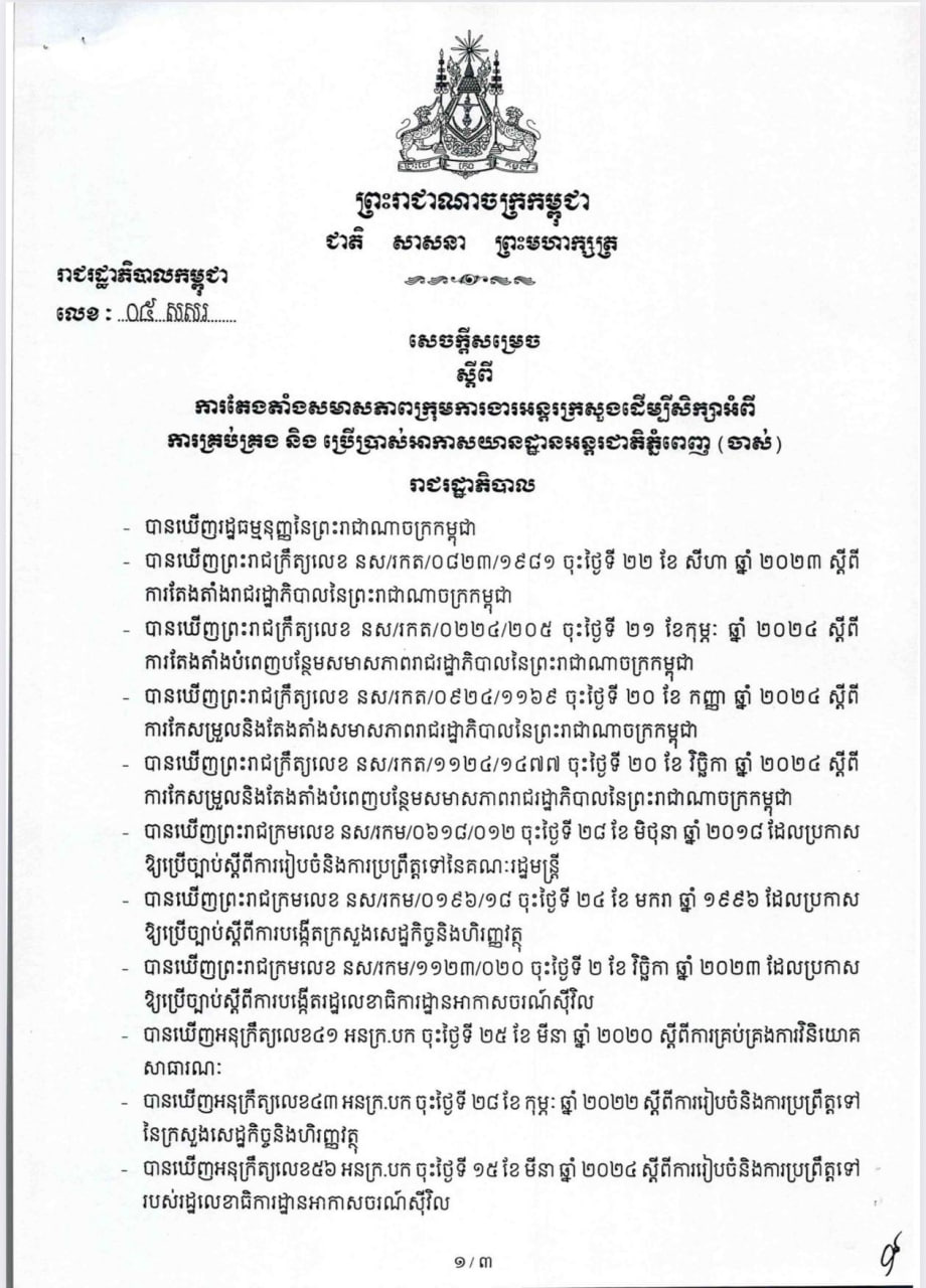 តាមសេចក្តីសម្រេចរបស់សម្តេចបវរធិបតី ហ៊ុន ម៉ាណែត បានបញ្ជាក់ថា ត្រូវបានតែងតាំងនូវសមាសភាពក្រុមការងារអន្តរក្រសួងដើម្បីសិក្សាអំពីការគ្រប់គ្រង និងប្រើប្រាស់ អាកាសយានដ្ឋានអន្តរជាតិភ្នំពេញ (ចាស់) ដែលហៅកាត់ថា “ក.ស.អ.” ដែលមានលោក ឈាង វណ្ណារិទ្ធ រដ្ឋលេខាធិការ នៃទីស្តីការគណៈរដ្ឋមន្ត្រី ជាប្រធាន អមដោយអនុប្រធាន និងសមាជិកជាច្រើនរូបទៀត៕