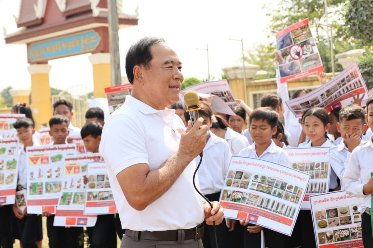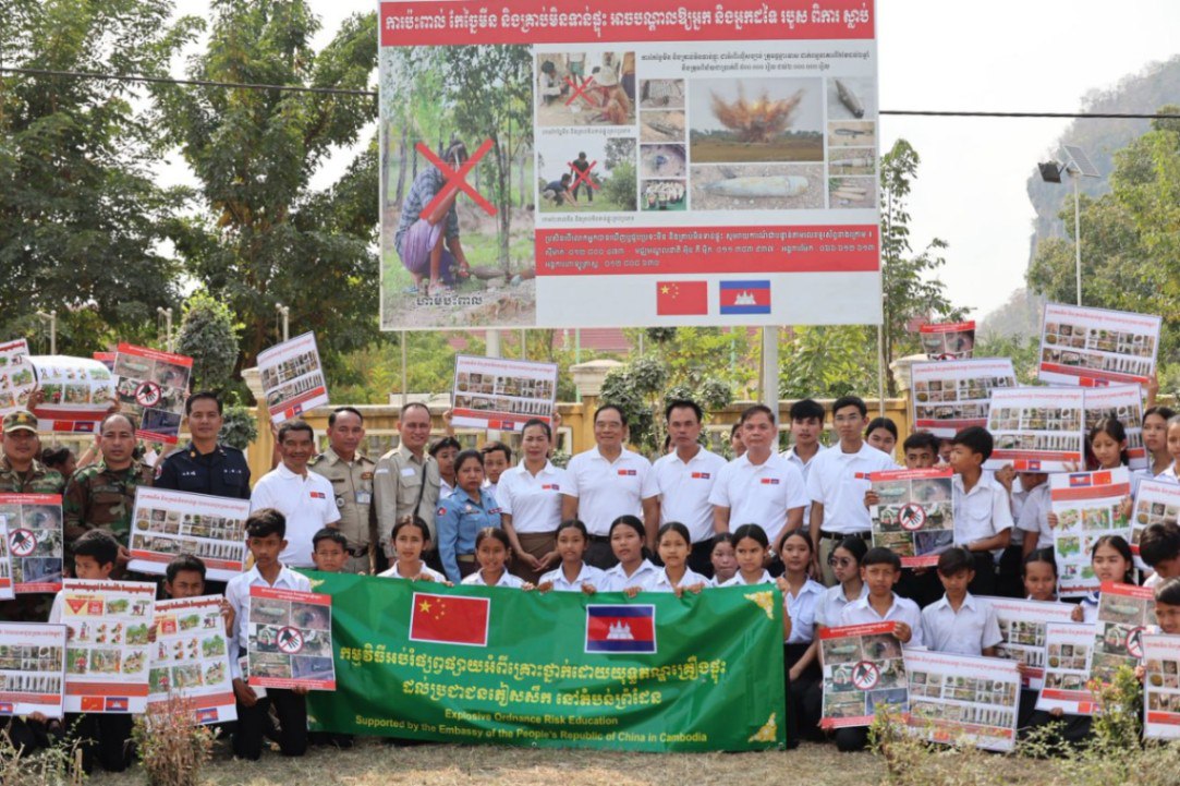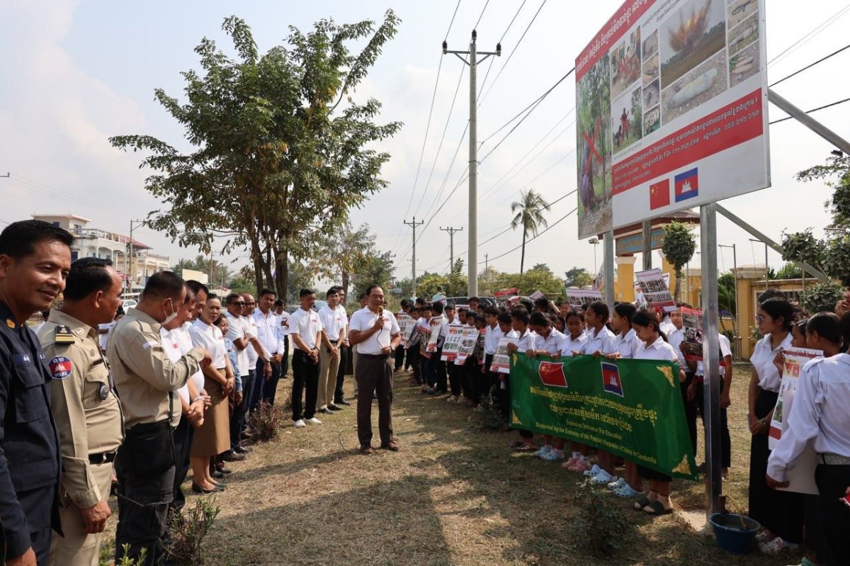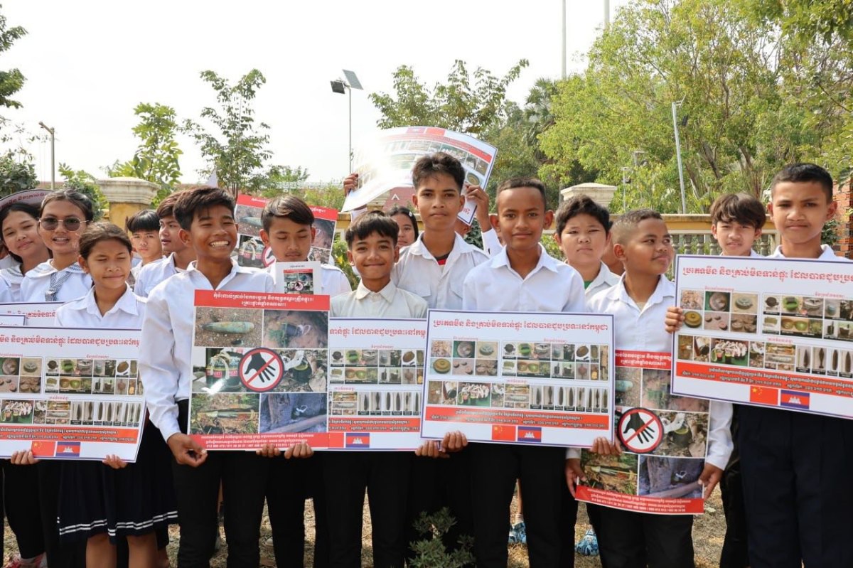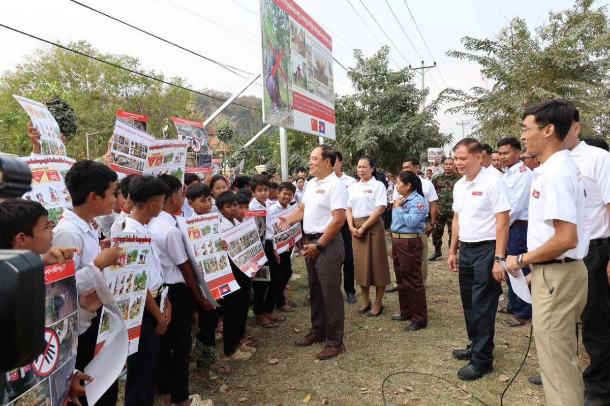 បាត់ដំបង៖ ថ្ងៃទី១៩ ខែមករា ឆ្នាំ២០២៦ ឯកឧត្ដមបណ្ឌិត លី ធុជ ទេសរដ្ឋមន្រ្តី អនុប្រធានទី១ អាជ្ញាធរមីន ជួបសំណេះសំណាលជាមួយអាជ្ញាធរដែនដី កងកម្លាំងប្រដាប់អាវុធ លោកគ្រូ-អ្នកគ្រូ និងសិស្សានុសិស្ស ក្នុងកម្មវិធីលើកផ្ទាំងប៉ាណូអប់រំអំពីគ្រោះថ្នាក់ដោយសារយុទ្ធភណ្ឌគ្រឿងផ្ទុះ នៅមុខអនុវិទ្យាល័យ សម្ដេចឪ សម្ដេចម៉ែ ភ្នំសំពៅ ស្រុកបាណន់ ខេត្តបាត់ដំបង ដែលជាតំបន់រងការទម្លាក់គ្រាប់បែកពីយោធាថៃ អំឡុងសង្រ្គាមលើកទី២រវាងកម្ពុជា-ថៃ។