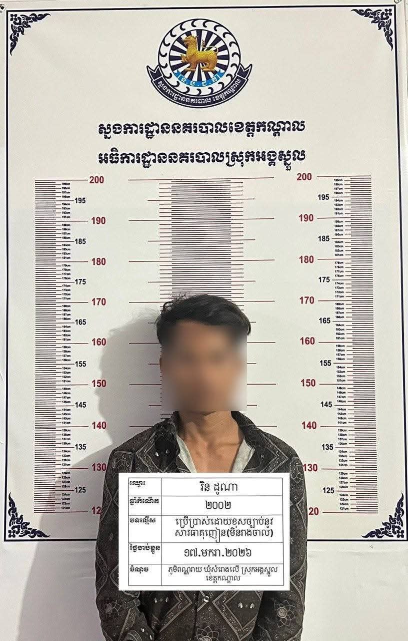 ខេត្តកណ្ដាល÷ មុខសញ្ញាប្រើប្រាស់ថ្នាំញៀនយ៉ាងសកម្មម្នាក់ ដែលសម្ងំលាក់ខ្លួនប្រើប្រាស់ក្នុងព្រៃ ត្រូវបានកម្លាំងសមត្ថកិច្ចចុះបង្ក្រាបនិងឃាត់ខ្លួនបានភ្លាមៗ ក្រោយពីទទួលបានសេចក្ដីរាយការណ៍ពីប្រជាពលរដ្ឋតាមរយៈកម្មវិធី «NoDrug» របស់អាជ្ញាធរជាតិប្រយុទ្ធប្រឆាំងគ្រឿងញៀន។ ប្រតិបត្តិការនេះធ្វើឡើងនៅវេលាម៉ោង ២១និង១៥នាទីយប់ ថ្ងៃទី១៧ មករា ២០២៦ នៅចំណុចព្រៃខាងកើតភូមិពណ្ណរាយ ឃុំសំរោងលើ ស្រុកអង្គស្នួល ខេត្តកណ្ដាល។