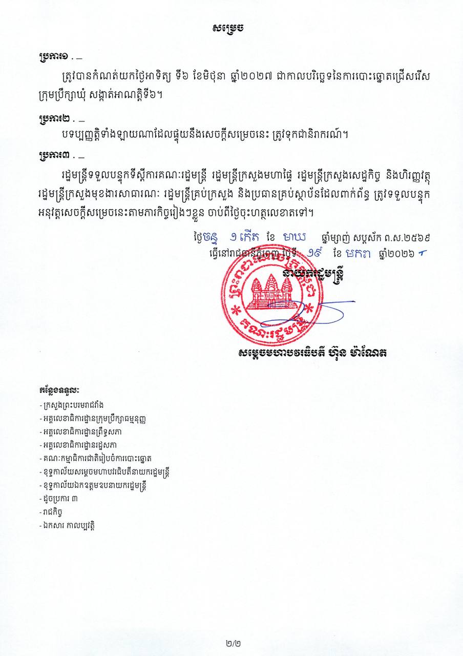 (ភ្នំពេញ)៖ សម្តេចបវរធិបតី ហ៊ុន ម៉ាណែត នាយករដ្ឋមន្ដ្រីនៃកម្ពុជា បានចេញសេចក្ដីសម្រេច ស្ដីពី ការប្រកាសកាលបរិច្ឆេទ នៃការបោះឆ្នោត ជ្រើសរើសក្រុមប្រឹក្សាឃុំ សង្កាត់អាណត្ដិទី៦ ដោយសម្រេចកំណត់យកថ្ងៃអាទិត្យ ទី០៦ ខែមិថុនា ឆ្នាំ២០២៧។ នេះបើតាមសេចក្ដីសម្រេច ដែលបណ្ដាញព័ត៌មាន ទទួលបាននៅថ្ងៃទី១៩ ខែមករា ឆ្នាំ២០២៦៕