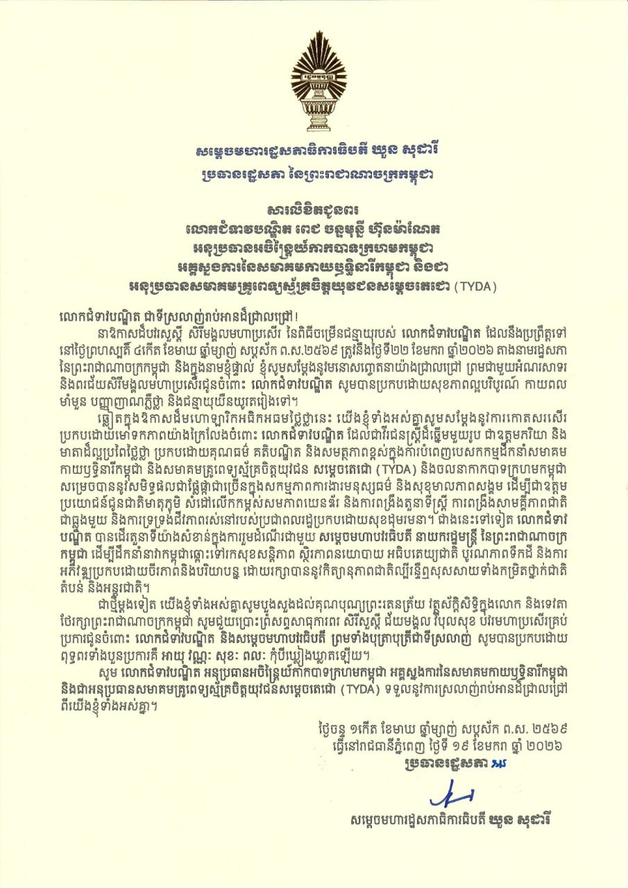 (ភ្នំពេញ)៖ សម្តេចមហារដ្ឋសភាធិការធិបតី ឃួន សុដារី ប្រធានរដ្ឋសភា នៃព្រះរាជាណាចក្រកម្ពុជា នៅថ្ងៃទី១៩ ខែមករា ឆ្នាំ២០២៦ បានសារលិខិតជូនពរ លោកជំទាវបណ្ឌិត ពេជ ចន្ទមុន្នី ហ៊ុនម៉ាណែត អនុប្រធានអចិន្ត្រៃយ៍កាកបាទក្រហមកម្ពុជា អគ្គស្នងការនៃសមាគមកាយឬទ្ធិនារីកម្ពុជា និងជា អនុប្រធានសមាគមគ្រូពេទ្យស្ម័គ្រចិត្តយុវជនសម្តេចតេជោ (TYDA) នាឱកាសដ៏បវរសួស្តី សិរីមង្គលមហាប្រសើរ នៃពិធីចម្រើនជន្មាយុរបស់លោកជំទាវបណ្ឌិត ដែលនឹងប្រព្រឹត្តទៅ នៅថ្ងៃព្រហស្បតិ៍ ៤កើត ខែមាឃ ឆ្នាំម្សាញ់ សប្តស័ក ព.ស.២៥៦៩ ១៥៦៩ ត្រូវនឹងថ្ងៃទី២២ ខែមករា ឆ្នាំ២០២៦។