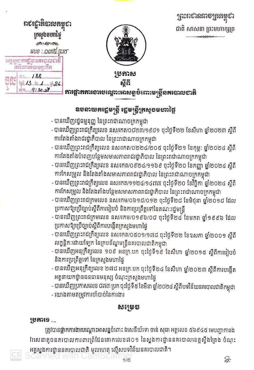 ត្រូវបានផ្អាកការងារបណ្តោះអាសន្នចំពោះ វរសេនីយ៍ទោ ចាន់ សុធា អត្តលេខ ៥៦៩៤៥ មេបញ្ជាការរង វរសេនាតូចនគរបាលការពារព្រំដែនគោកលេខ៧០១ នៃស្នងការដ្ឋាននគរបាលខេត្តស្ទឹងត្រែង ចំណុះអគ្គស្នងការដ្ឋាននគរបាលជាតិ មូលហេតុ ល្មើសបទវិន័យនគរបាលជាតិ។