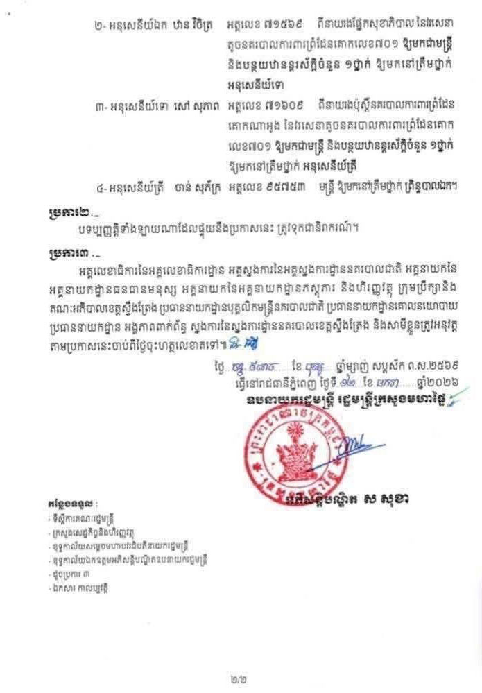 ២៖ វរសេនីយ៍ទោ ចាន់ សុធា អត្តលេខ៥៦៩៤៥ មេបញ្ជាការរង វរសេនាតូចនគរបាលការពារព្រំដែនគោកលេខ៧៩១ នៃស្នងការដ្ឋាននគរបាលខេត្តស្ទឹងត្រែង ត្រូវបានផ្អាកការងារបណ្តោះអាសន្ន។