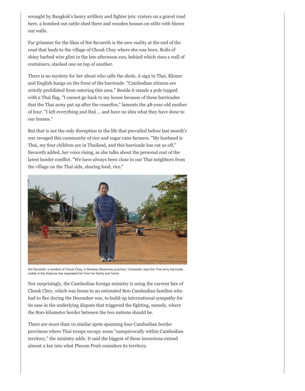 លោកស្រី Savareth បានឱ្យដឹងថាប្ដីរបស់លោកស្រីជាជនជាតិថៃ ហើយកូនទាំង៤របស់លោកស្រីកំពុងរស់នៅក្នុងប្រទេសថៃ។ ដូច្នេះរនាំងដែលកងទ័ពថៃបានដំឡើងបានរារាំងមិន ឱ្យលោកស្រីជួបជុំគ្រួសារវិញ។ នៅក្នុងបទសម្ភាសន៍ជាមួយសារព័ត៌មាន Nikkei ក្នុងទីក្រុងភ្នំពេញ រដ្ឋមន្ត្រីការបរទេសកម្ពុជា លោក ប្រាក់ សុខុន បានកត់សម្គាល់ថាការកាន់កាប់ គឺហួសពីខ្សែបន្ទាត់ព្រំដែនដែលត្រូវបានអះអាងដោយថៃ។ «នេះជាការកាន់កាប់ដោយខុសច្បាប់ និងបានកើតឡើងយ៉ាងជ្រៅនៅក្នុងទឹកដីកម្ពុជា»។ នេះជាការគូសបញ្ជាក់របស់ ប្រមុខការទូតកម្ពុជា ដោយបន្ថែមថា «វាជារឿងមិនអាចទទួលយកបានឡើយសម្រាប់ប្រជាជនកម្ពុជា។ នេះបង្ហាញពីហានិភ័យនៃការដួលរលំបទឈប់បាញ់ ហើយភាពផុយស្រួយ នៃបទឈប់បាញ់បានឆ្លុះបញ្ចាំងថាការកាន់កាប់ដោយខុសច្បាប់អាចនឹងនាំទៅរកការច្បាមយកទឹកដី (របស់កម្ពុជា)»។