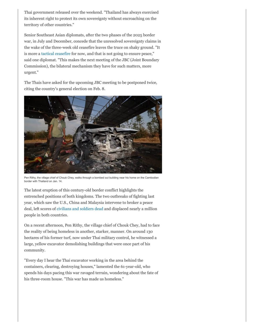 (តូក្យូ)៖ សារព័ត៌មានជប៉ុន Nikkei នៅថ្ងៃអង្គារ ទី២០ ខែមករា បានចេញផ្សាយអត្ថបទមួយដែលបានរៀបរាប់ពីទុក្ខលំបាករបស់ប្រជាជនកម្ពុជា ដែលមិនអាចត្រឡប់ទៅកាន់ ផ្ទះសម្បែងរបស់ពួកគេវិញ ទោះបីជាមានបទឈប់បាញ់រវាងកម្ពុជា និងថៃក៏ដោយ។