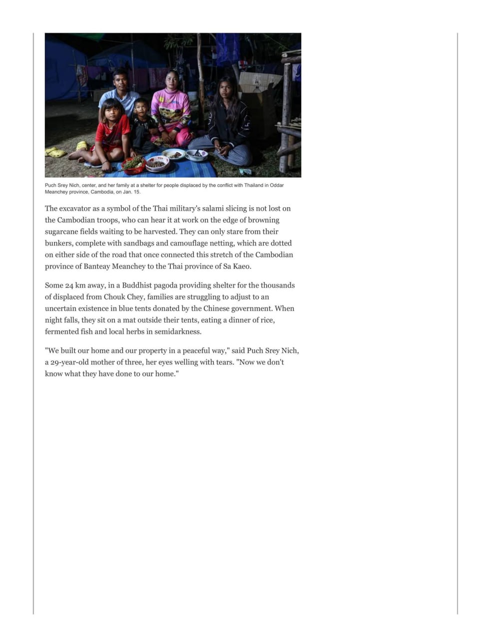 លោកស្រីបន្តថា «ខ្ញុំបានទុកចោលអ្វីៗគ្រប់យ៉ាង និងបានរត់ភៀសខ្លួន…ហើយខ្ញុំពិតជាហួសចិត្តខ្លាំងណាស់ចំពោះអ្វីដែល ពួកគេ (ទាហានថៃ) បានធ្វើមកលើផ្ទះរបស់ខ្ញុំ»។ ថៃបានដំឡើងរនាំងដែលមានសរសេរជាភាសាខ្មែរ ថៃ និងអង់គ្លេសនៅលើនោះថា «ពលរដ្ឋកម្ពុជាមិនត្រូវបានអនុញ្ញាតឱ្យចូលក្នុងតំបន់នេះដាច់ខាត»។