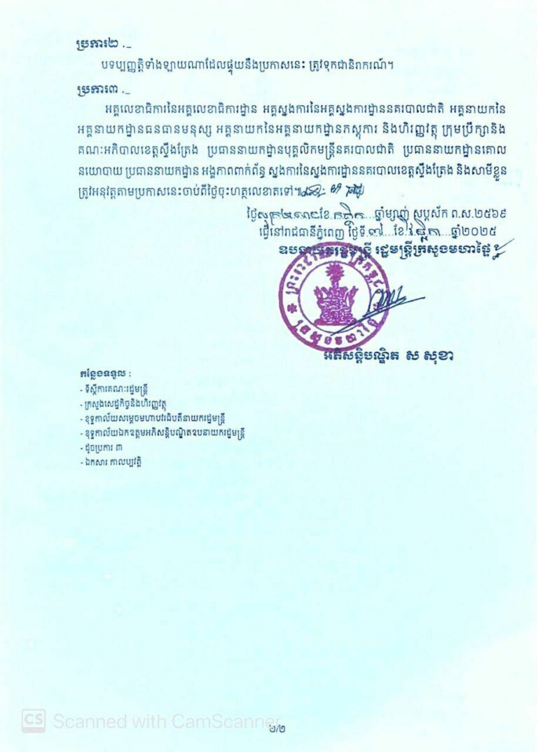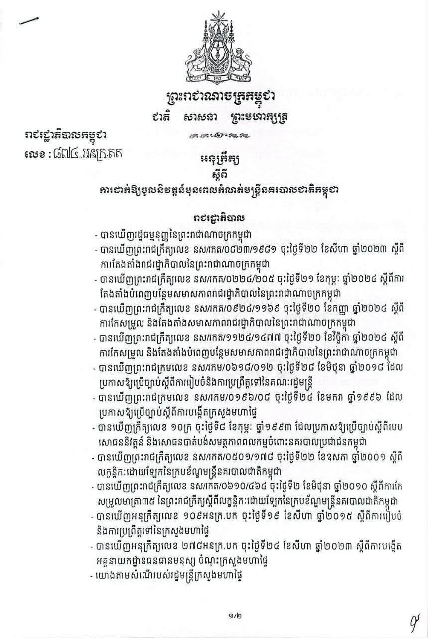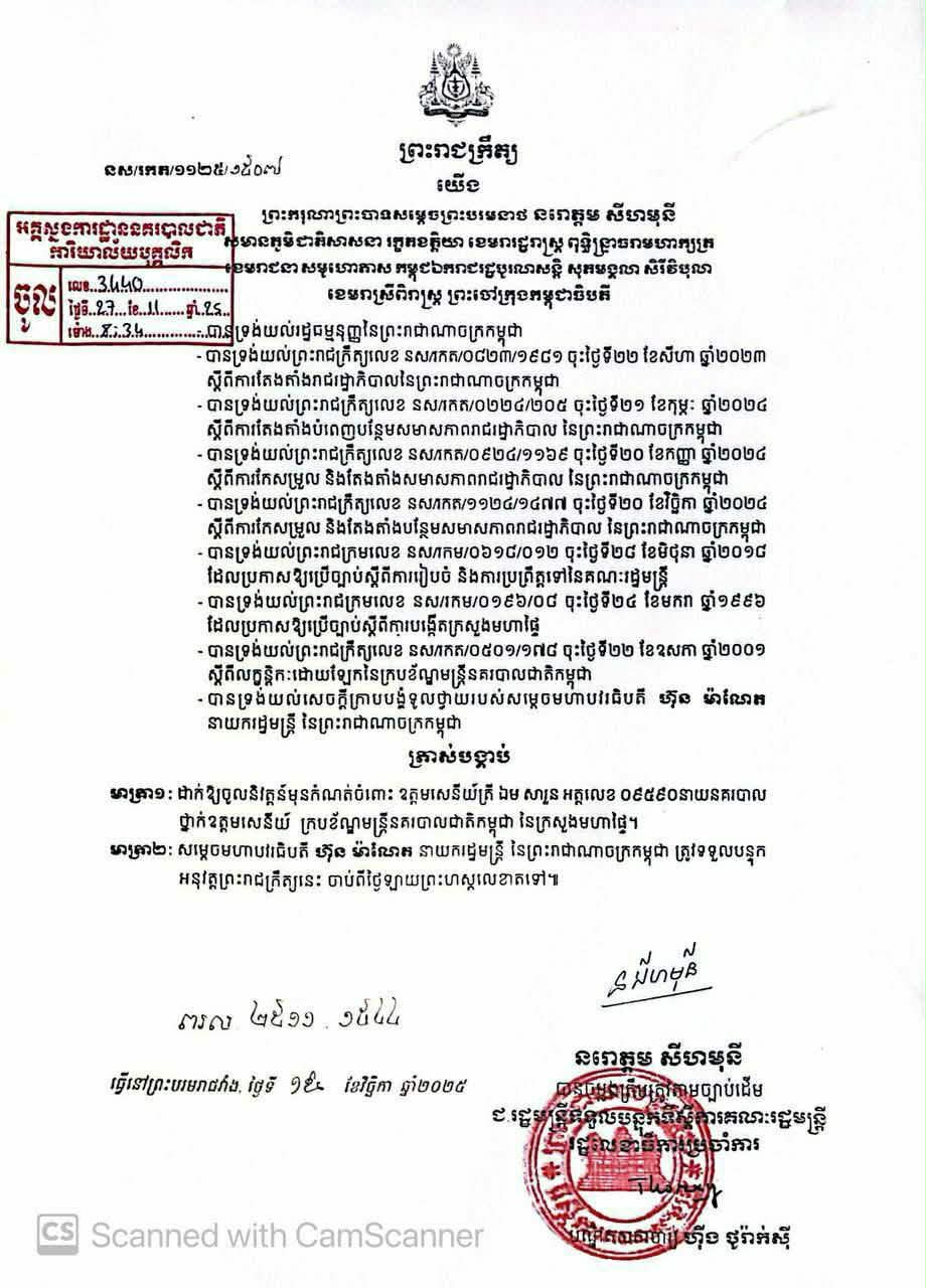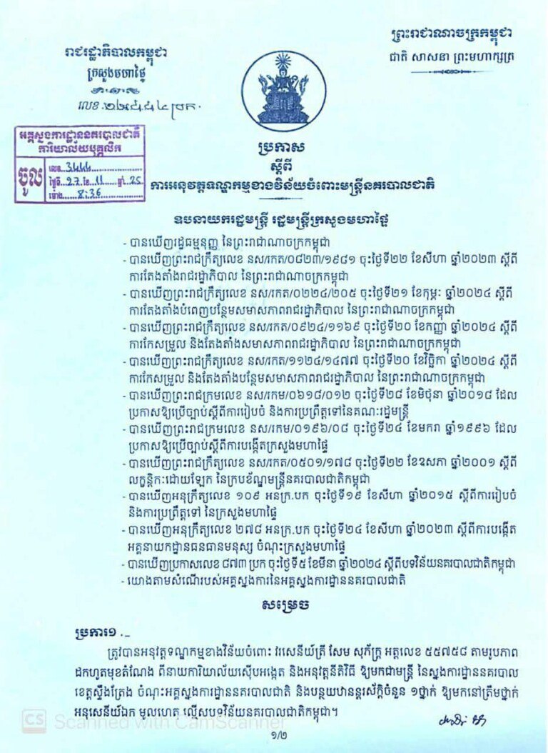 ព្រះរាជក្រឹត្យ អនុក្រឹត្យ និងប្រកាសរបស់ក្រសួងមហាផ្ទៃ មន្ត្រីនគរបាលជាន់ខ្ពស់ និងមន្ត្រីស៊ើបអង្កេតនៃស្នងការដ្ឋាននគរបាលខេត្តស្ទឹងត្រែងចំនួន ៣រូប ត្រូវបានសម្រេចដាក់ឱ្យចូលនិវត្តន៍មុនកំណត់ និងទទួលទណ្ឌកម្មខាងវិន័យ