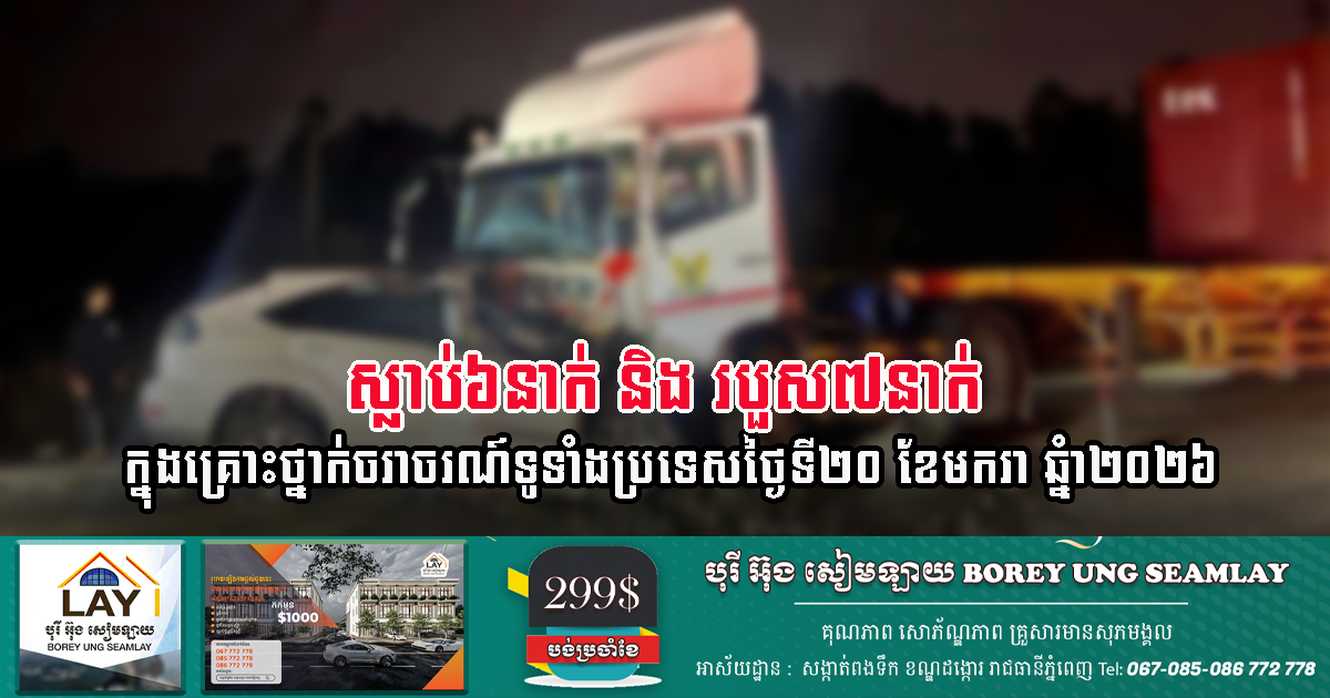 ស្លាប់៦នាក់ និងរបួស៧នាក់ ក្នុងគ្រោះថ្នាក់ចរាចរណ៍ទូទាំងប្រទេសថ្ងៃទី២០ ខែមករា ឆ្នំា២០២៦