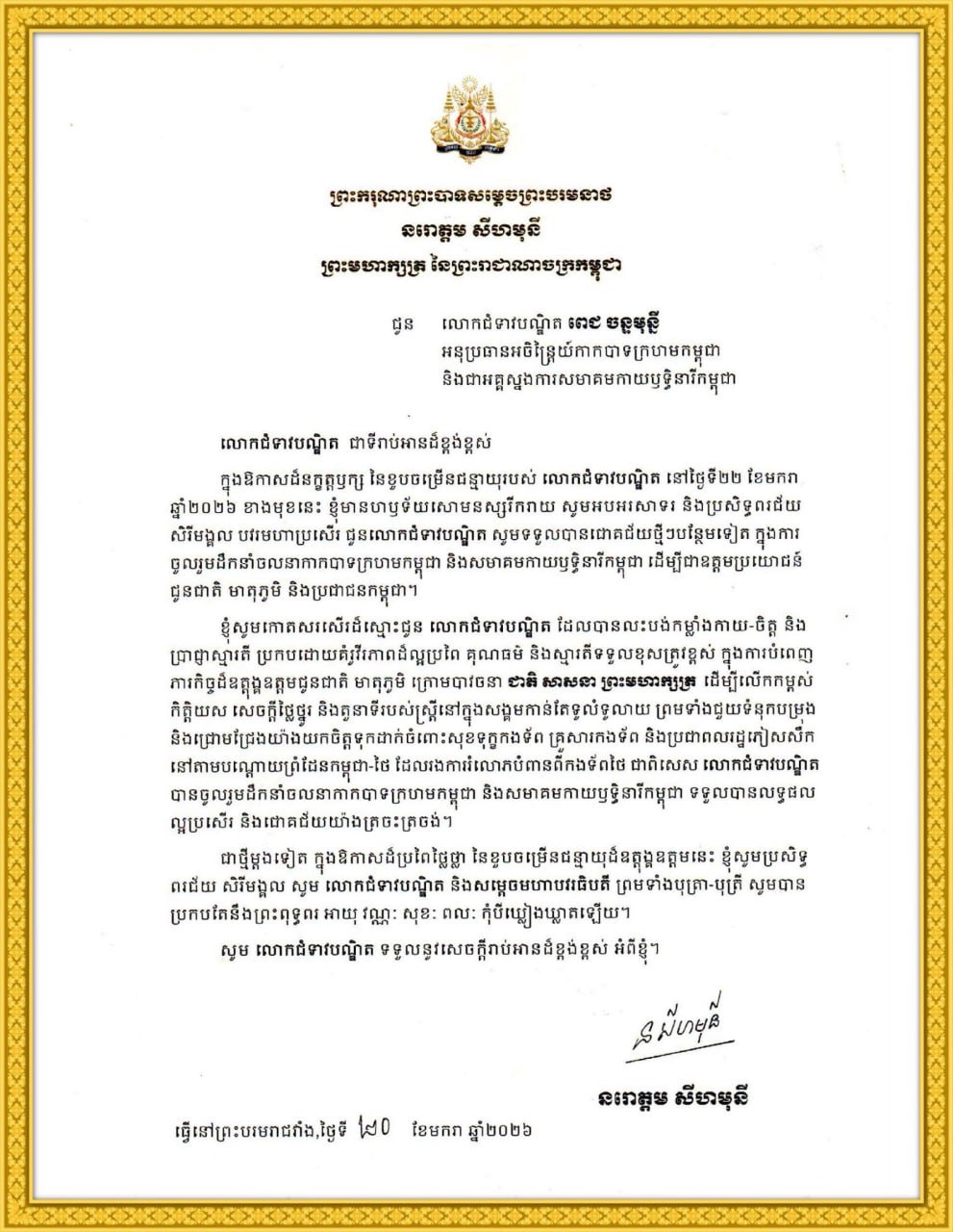 ក្នុងសារលិខិតរបស់ព្រះមហាក្សត្រ បានសរសេរថា «ក្នុងឱកាសជំនក្ខត្តឫក្ស នៃខួបចម្រើនជន្មាយុរបស់ លោកជំទាវបណ្ឌិត នៅថ្ងៃទី២២ ខែមករា ឆ្នាំ២០២៦ ខាងមុខនេះ ខ្ញុំមានហឫទ័យសោមនស្សរីករាយ សូមអបអរសាទរ និងប្រសិទ្ធពរជ័យ សិរីមង្គល បវរមហាប្រសើរ ជូនលោកជំទាវបណ្ឌិត សូមទទួលបានជោគជ័យថ្មីៗបន្ថែមទៀត ក្នុងការ ចូលរួមដឹកនាំចលនាកាកបាទក្រហមកម្ពុជា និងសមាគមកាយឫទ្ធិនារីកម្ពុជា ដើម្បីជាឧត្តមប្រយោជន៍ ជូនជាតិ មាតុភូមិ និងប្រជាជនកម្ពុជា។