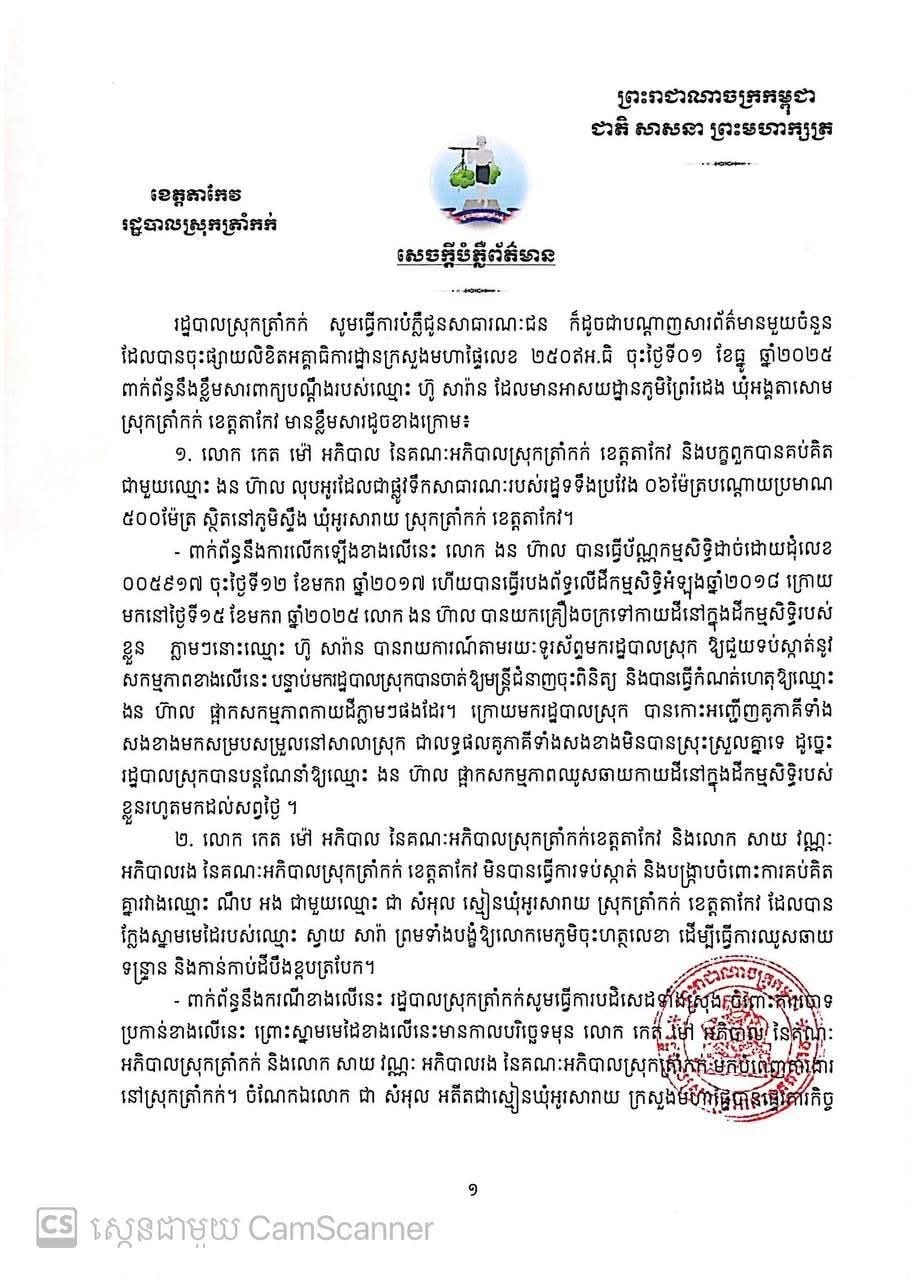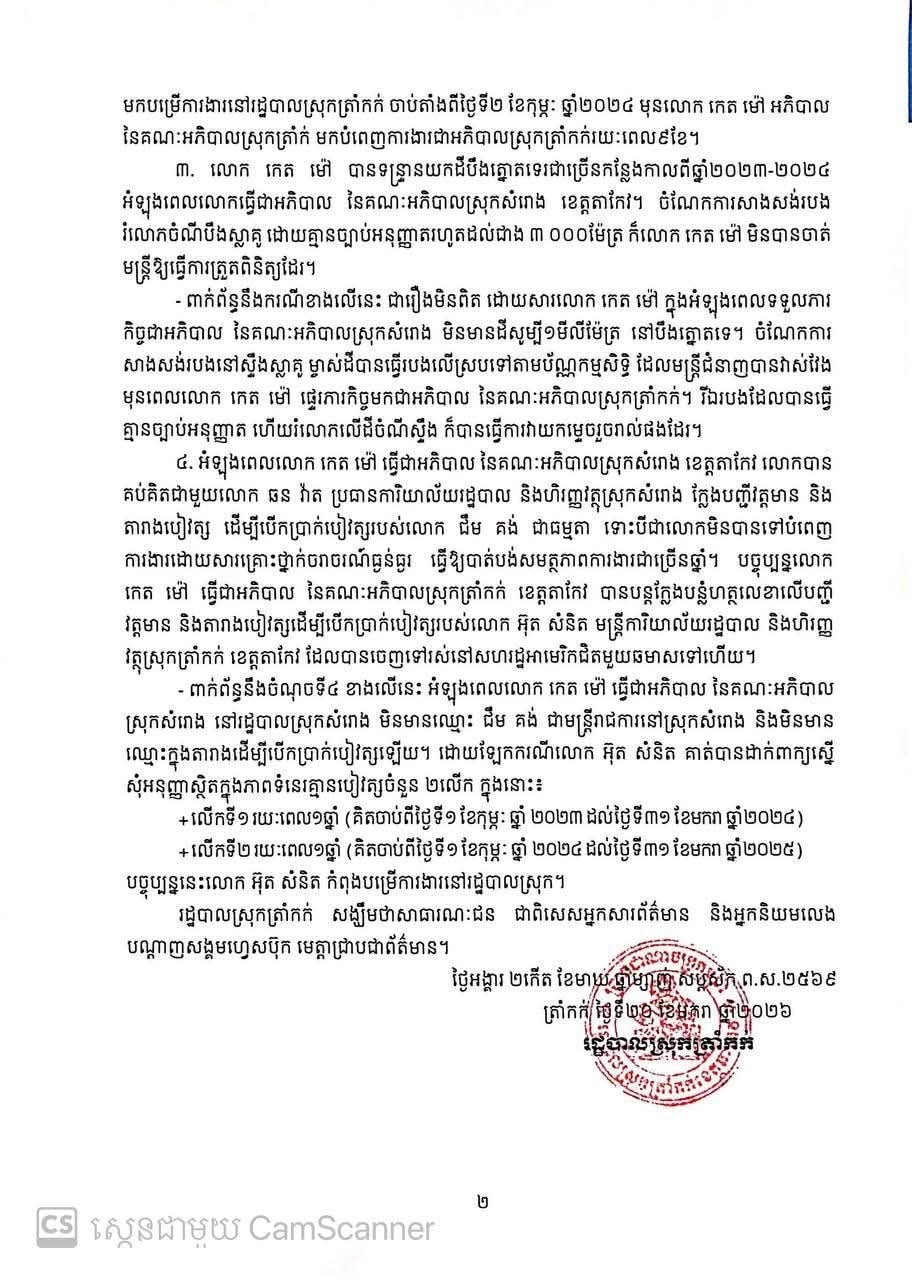 ក្រោយមានពាក្យបណ្តឹងនេះ រដ្ឋបាលស្រុកត្រាំកក់បានចេញសេចក្តីបំភ្លឺភ្លាមៗដោយច្រានចោលទាំងស្រុងរាល់ការចោទប្រកាន់ ថែមទាំងបានពោលថា មានអ្នកនៅពីក្រោយខ្នងទៀតផង ដែលចងឈ្នានីសគាត់៕