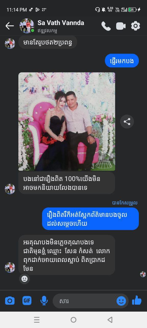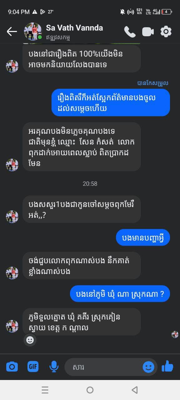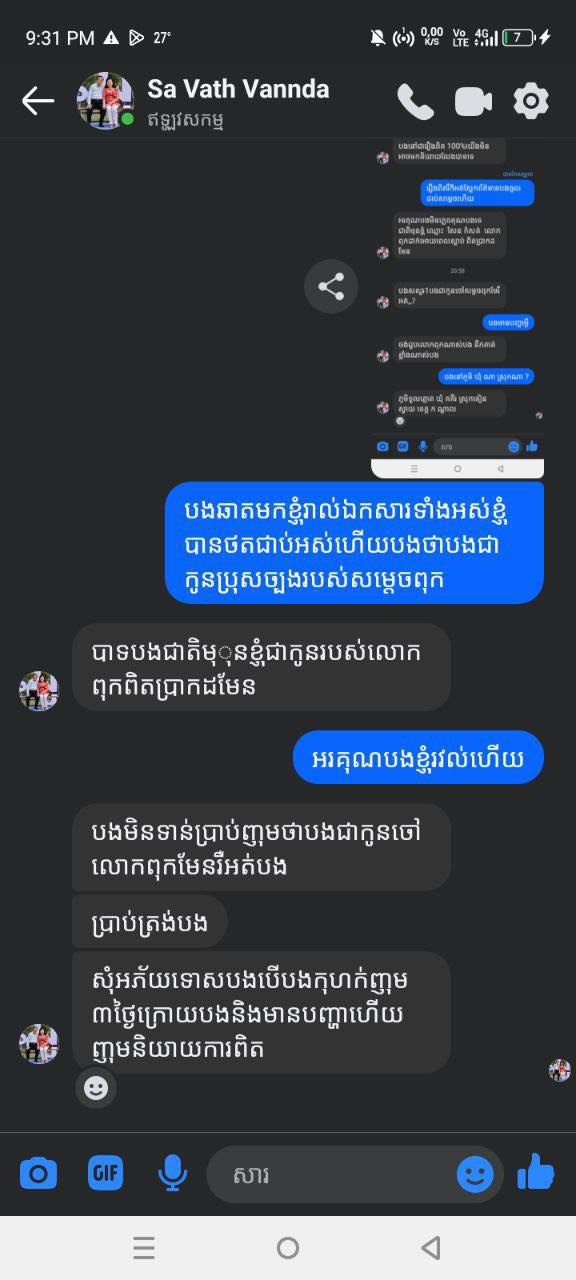ករណីចុងក្រោយហាក់ដូចធ្ងន់បន្តិចមានទាំងអត្ថបទមានទាំងសារឆ្លើយឆ្លងជាមួយមនុស្សដែលស្គាល់telegram របស់ខ្ញុំ។ ខ្ញុំសូមអំពាវនាវដល់អ្នកភូតកុហកឈប់ប្រើការឈឺចាប់របស់ខ្ញុំ ដើម្បីផលប្រយោជន៍ផ្ទាល់ខ្លួនតទៅទៀតទៅ៕