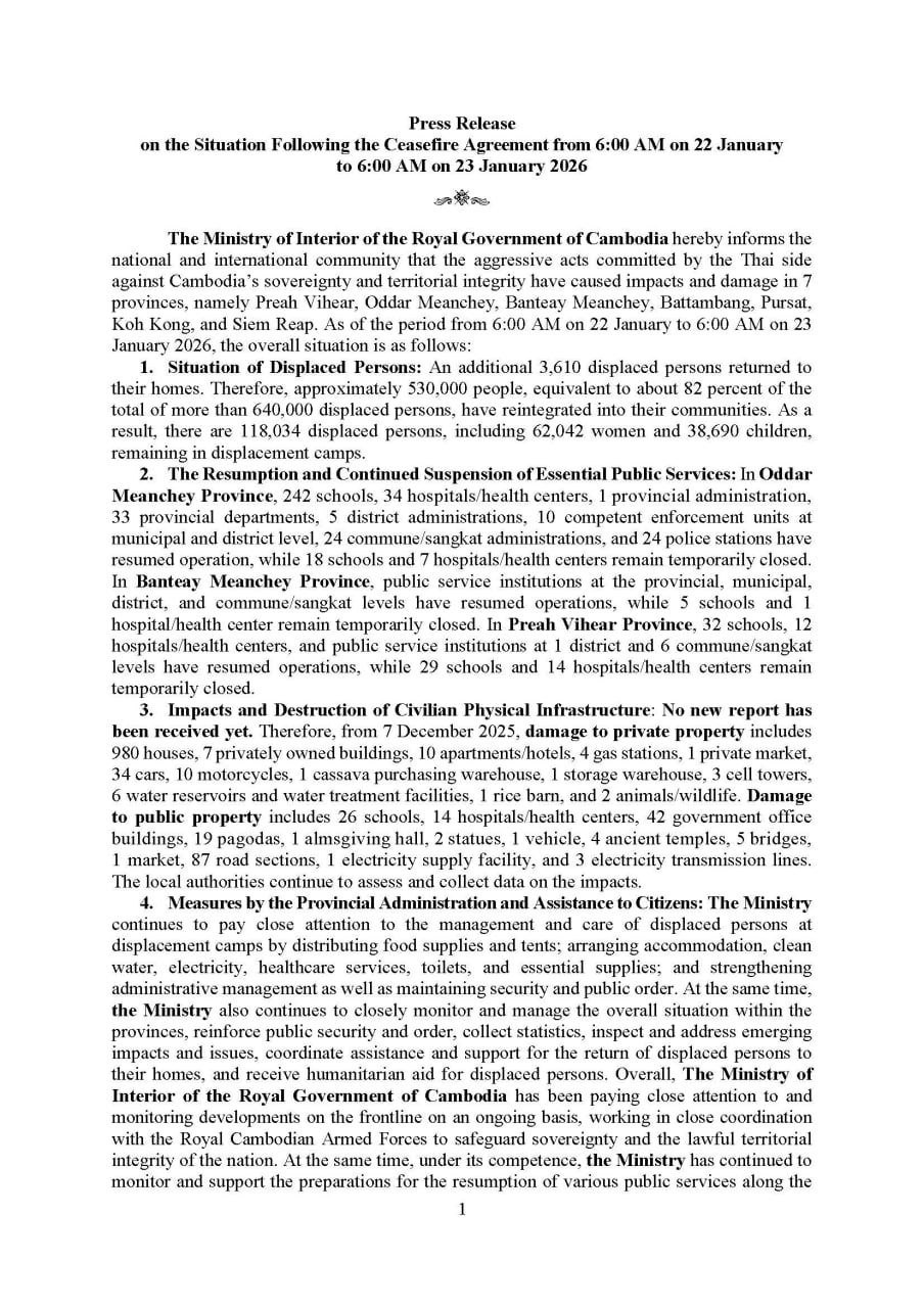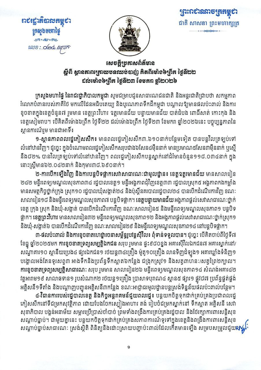 (ភ្នំពេញ)៖ ក្រសួងមហាផ្ទៃ បានឲ្យដឹងថា គិតចាប់ពីម៉ោង ៦ព្រឹក ថ្ងៃទី២២ ខែមករា ដល់ម៉ោង ៦ព្រឹក ថ្ងៃទី២៣ ខែមករា ឆ្នាំ២០២៦នេះ មានពលរដ្ឋភៀសសឹក ៣ ៦១០នាក់បន្ថែមទៀត បានបន្តវិលត្រឡប់ទៅលំនៅឋានវិញ ដូច្នេះក្នុងចំណោមពលរដ្ឋភៀសសឹកសរុបជាង ៦សែន ៤ម៉ឺននាក់ មានប្រមាណជាង ៥៣ម៉ឺននាក់ បានវិលត្រឡប់ទៅលំនៅឋានវិញ។