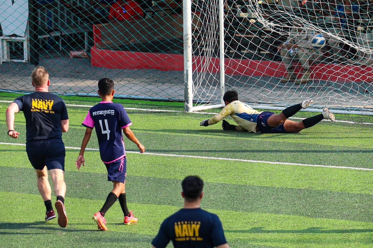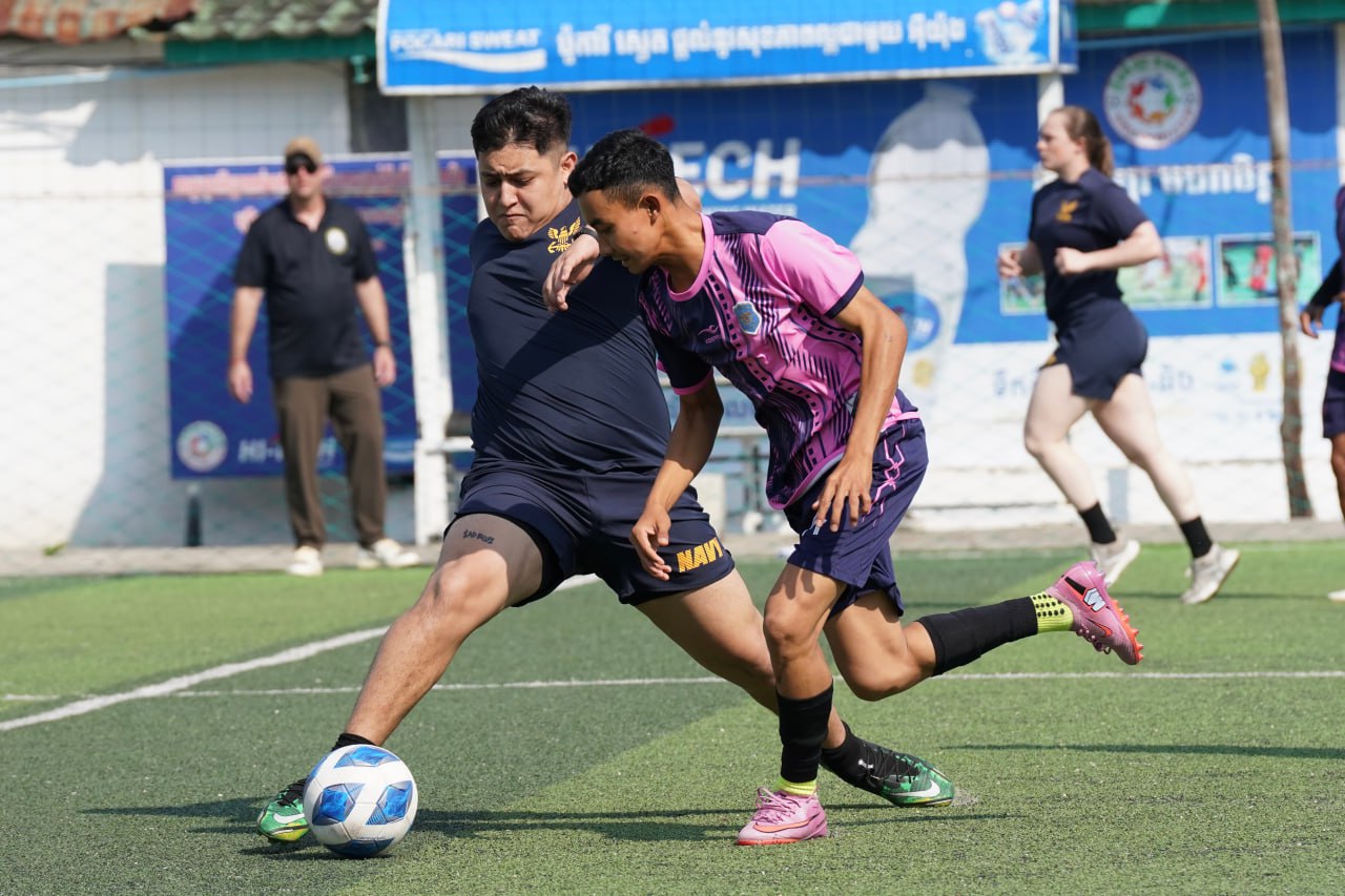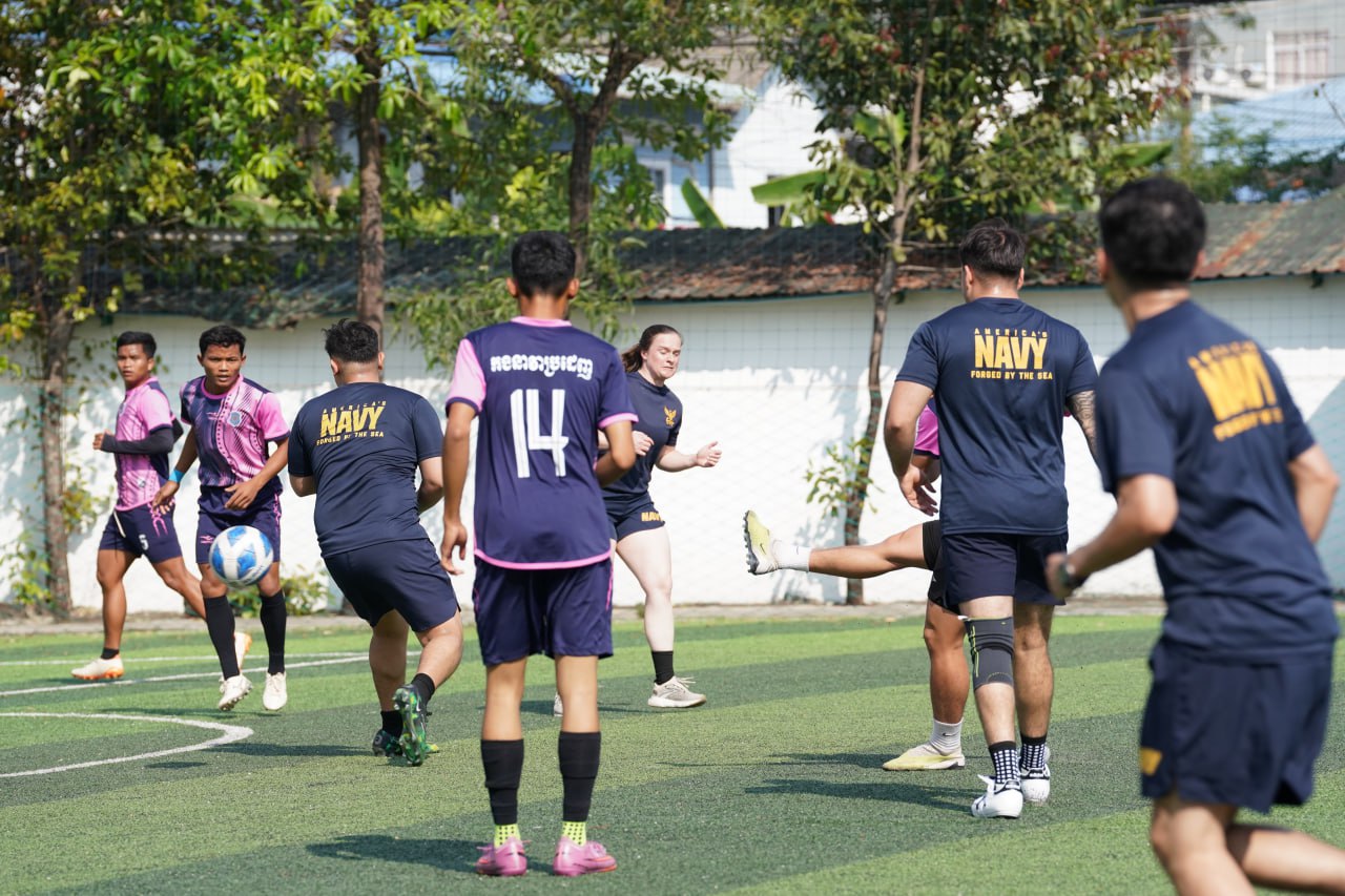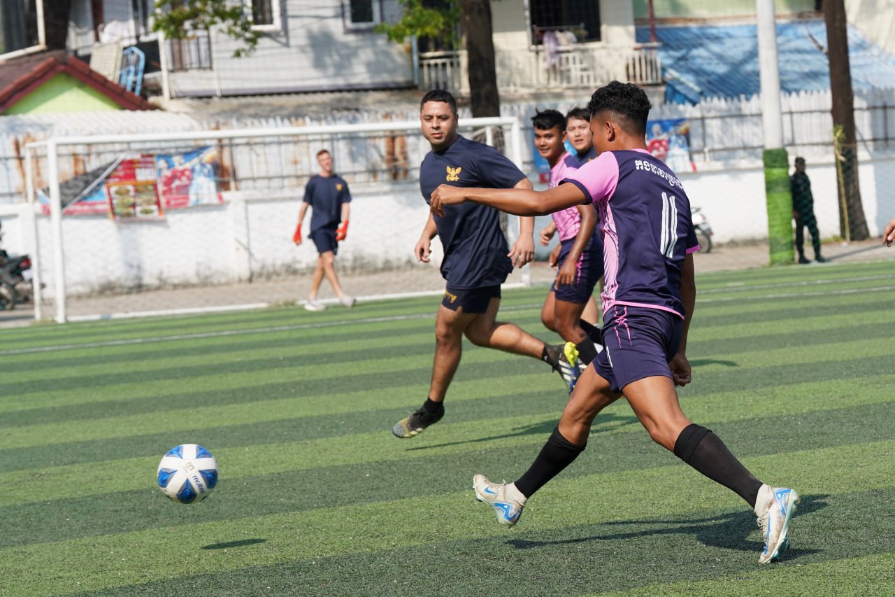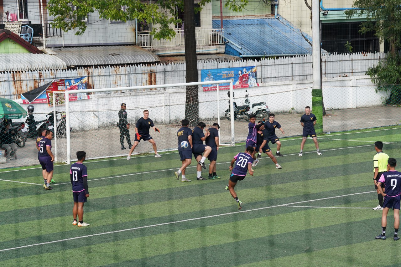 (ព្រះសីហនុ)៖ ក្រោយពេលចូលសំចតនៅមូលដ្ឋានសមុទ្ររាមក្រៅពីការធ្វើលំហាត់ហ្វឹកហ្វឺនរួមគ្នាហើយនោះ នៅរសៀលថ្ងៃអាទិត្យ ទី២៥ ខែមករា ឆ្នាំ២០២៦នេះ កងទ័ពជើងទឹករបស់កម្ពុជា និងអាមេរិក បានបើកការប្រកួតបាល់ទាត់ជាលក្ខណៈមិត្តភាពផងដែរ។