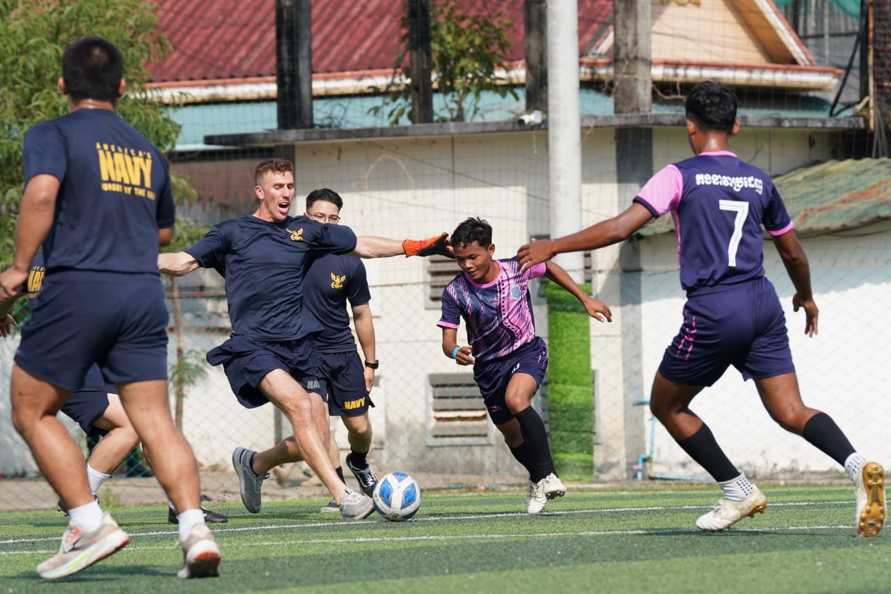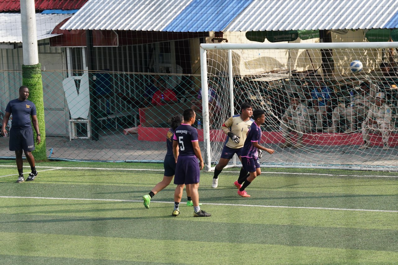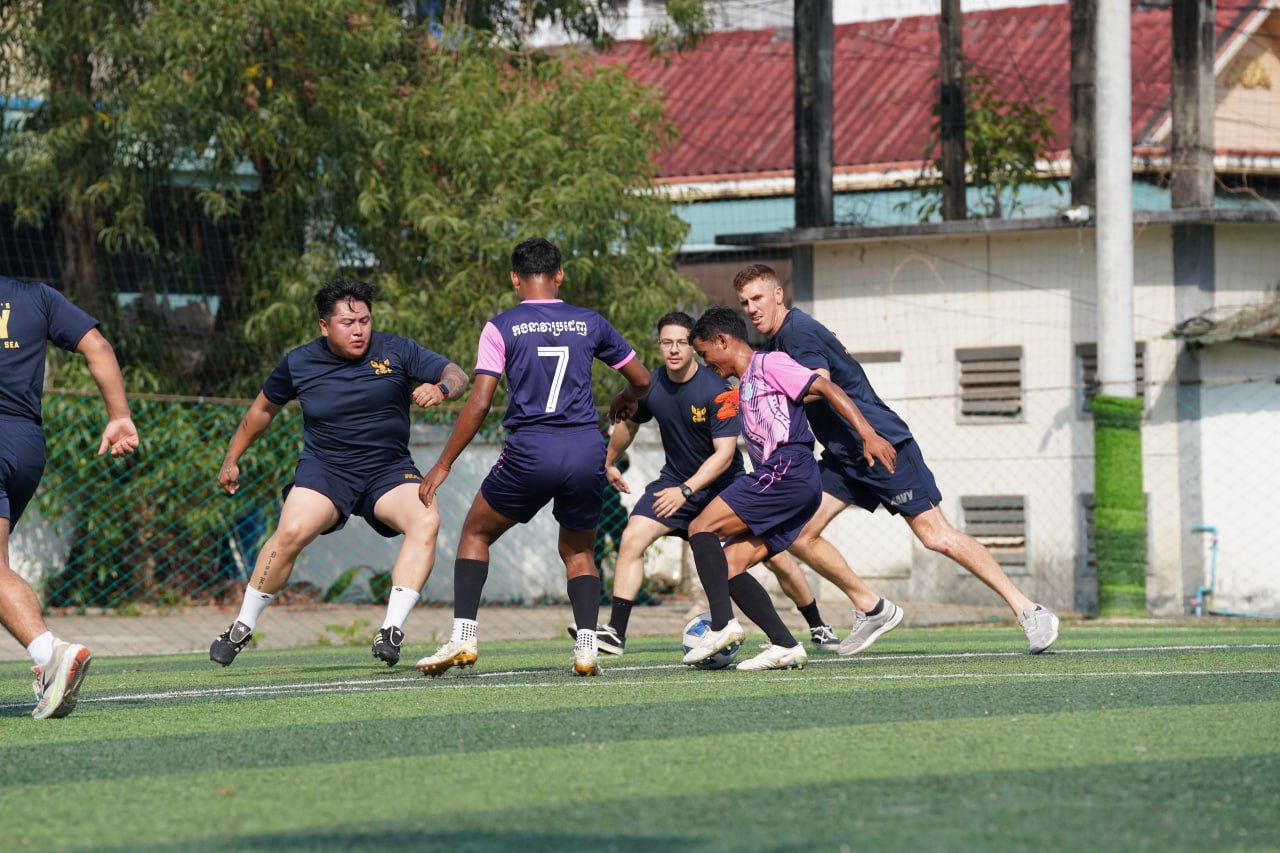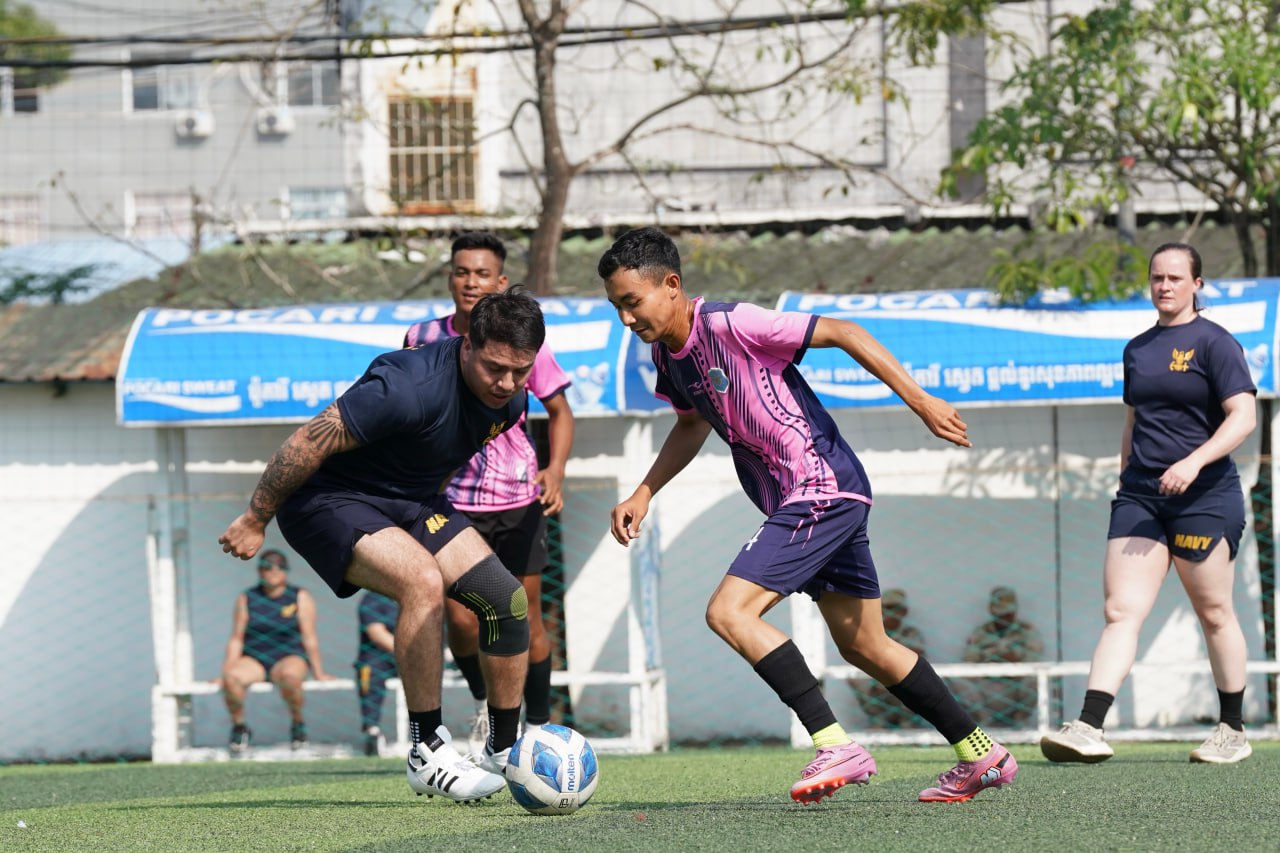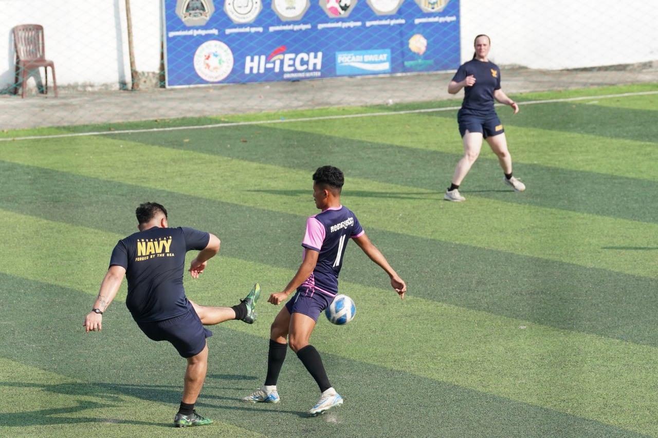 (ព្រះសីហនុ)៖ ក្រោយពេលចូលសំចតនៅមូលដ្ឋានសមុទ្ររាមក្រៅពីការធ្វើលំហាត់ហ្វឹកហ្វឺនរួមគ្នាហើយនោះ នៅរសៀលថ្ងៃអាទិត្យ ទី២៥ ខែមករា ឆ្នាំ២០២៦នេះ កងទ័ពជើងទឹករបស់កម្ពុជា និងអាមេរិក បានបើកការប្រកួតបាល់ទាត់ជាលក្ខណៈមិត្តភាពផងដែរ។
