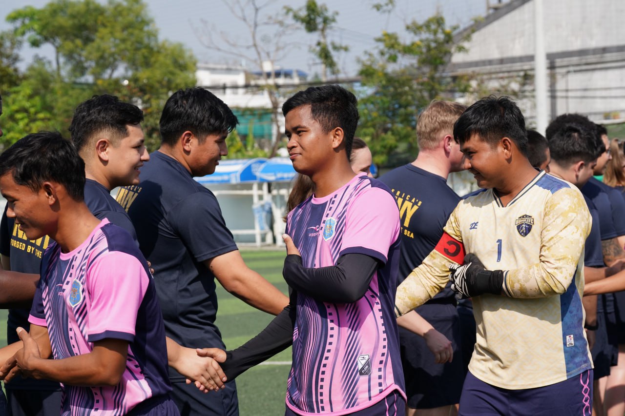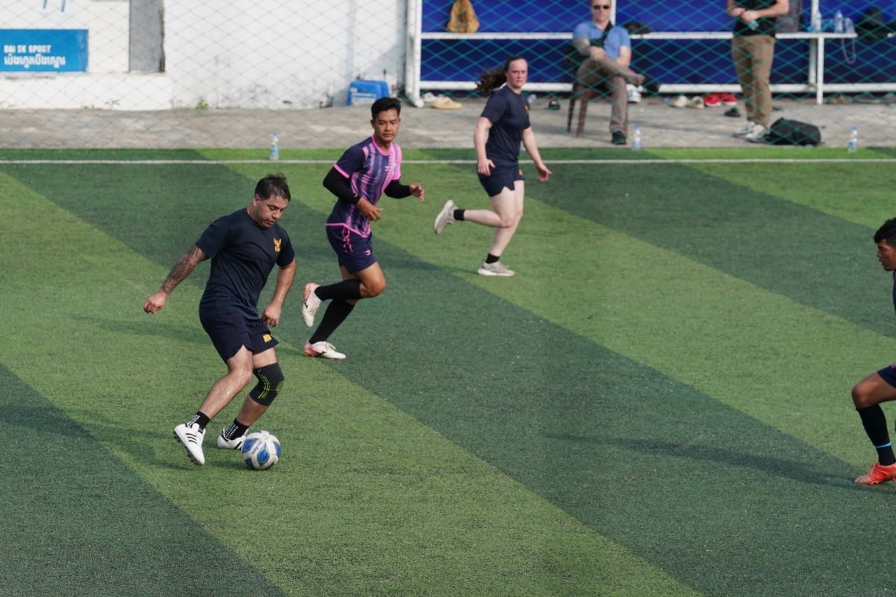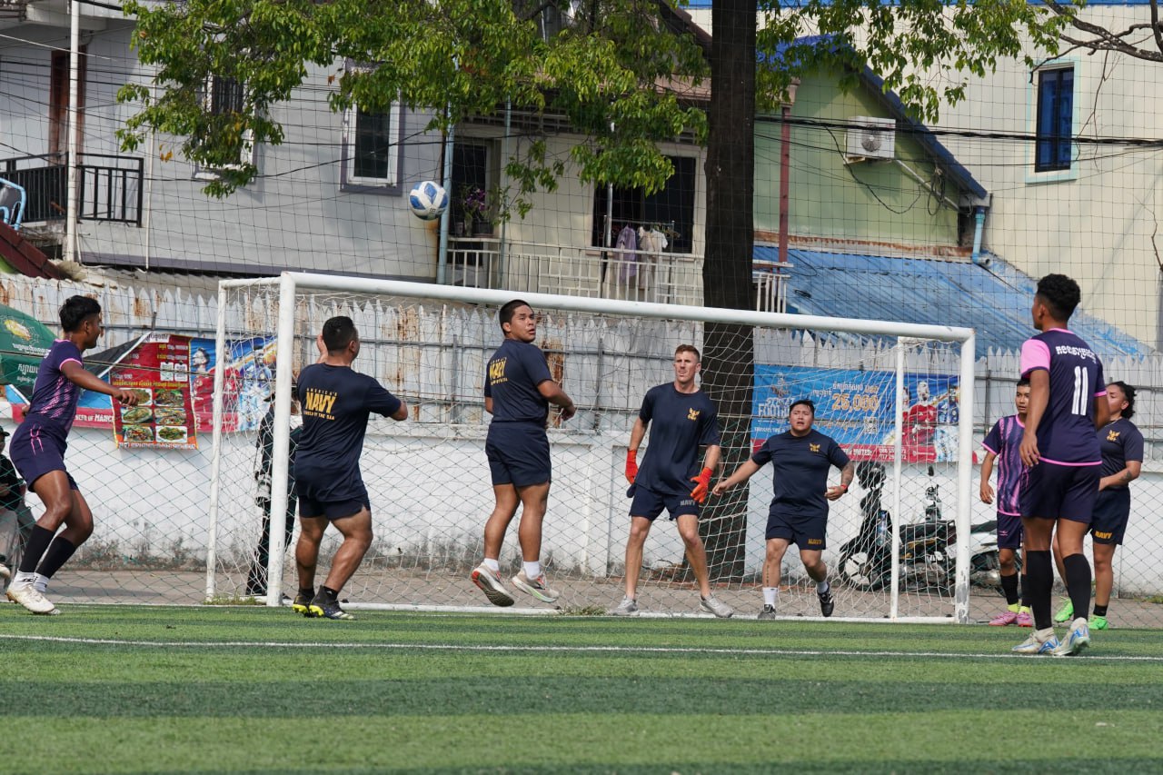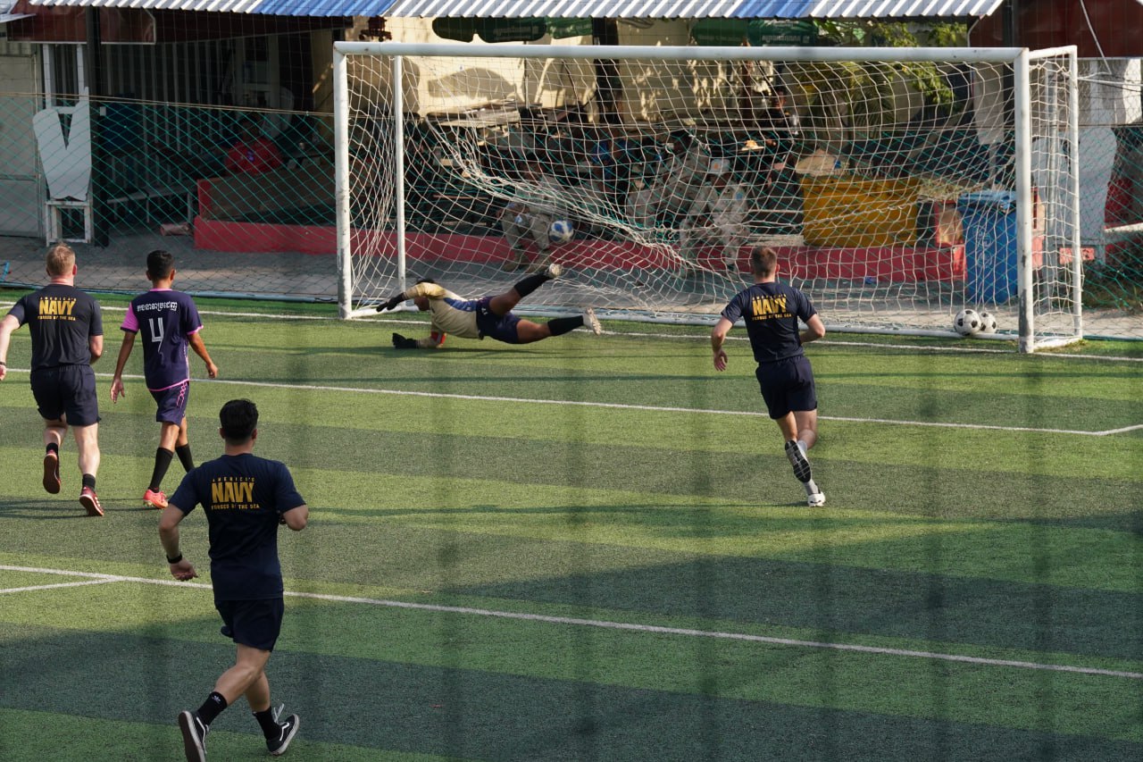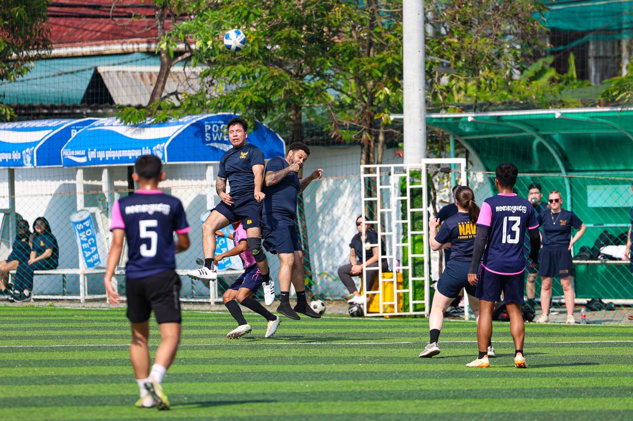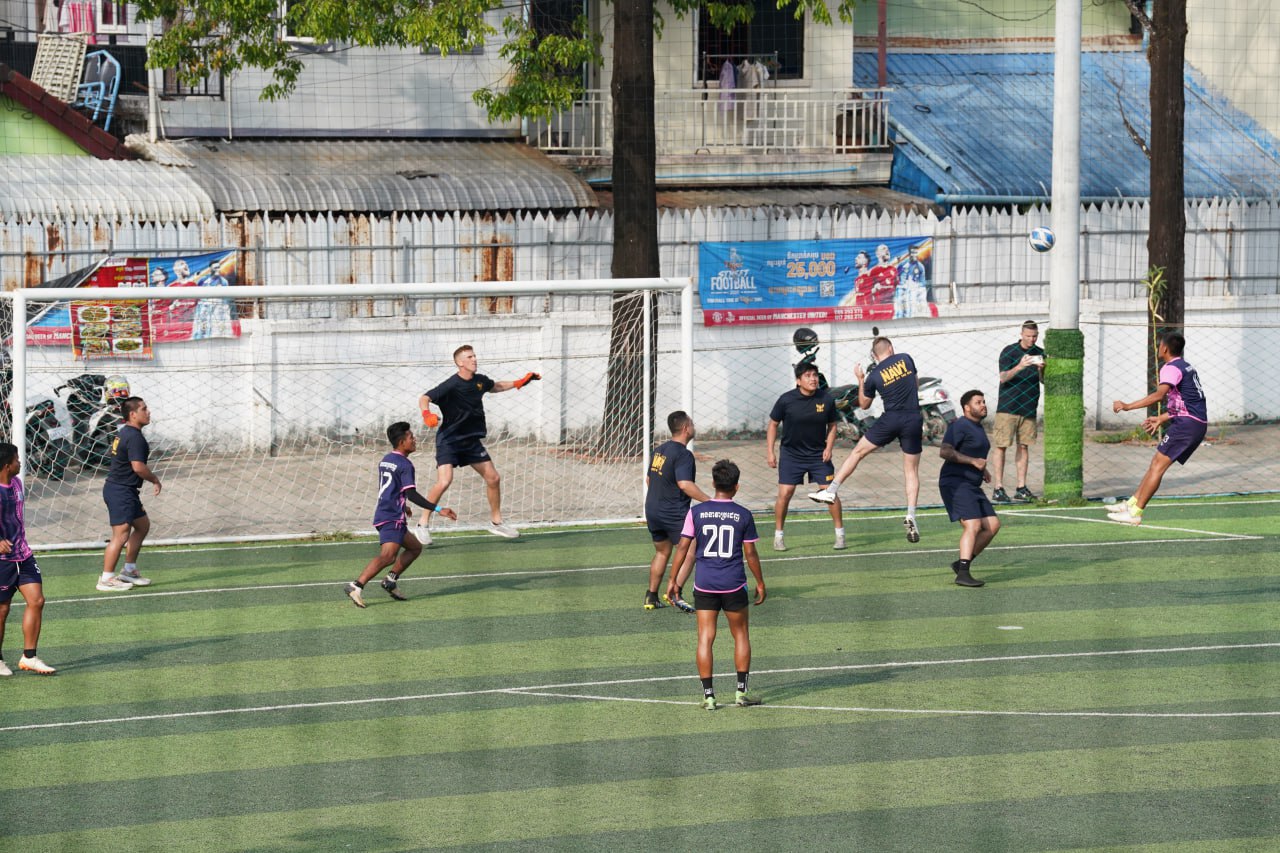 (ព្រះសីហនុ)៖ ក្រោយពេលចូលសំចតនៅមូលដ្ឋានសមុទ្ររាមក្រៅពីការធ្វើលំហាត់ហ្វឹកហ្វឺនរួមគ្នាហើយនោះ នៅរសៀលថ្ងៃអាទិត្យ ទី២៥ ខែមករា ឆ្នាំ២០២៦នេះ កងទ័ពជើងទឹករបស់កម្ពុជា និងអាមេរិក បានបើកការប្រកួតបាល់ទាត់ជាលក្ខណៈមិត្តភាពផងដែរ។