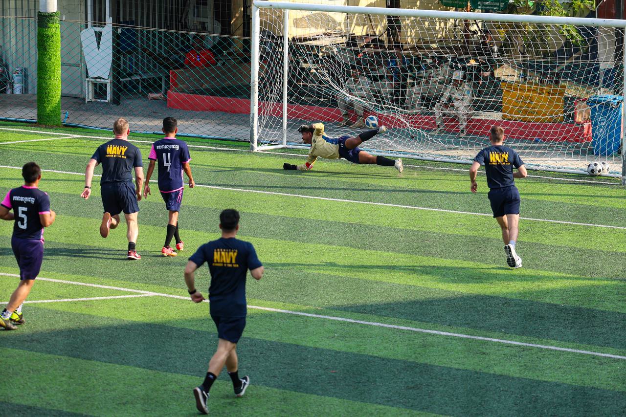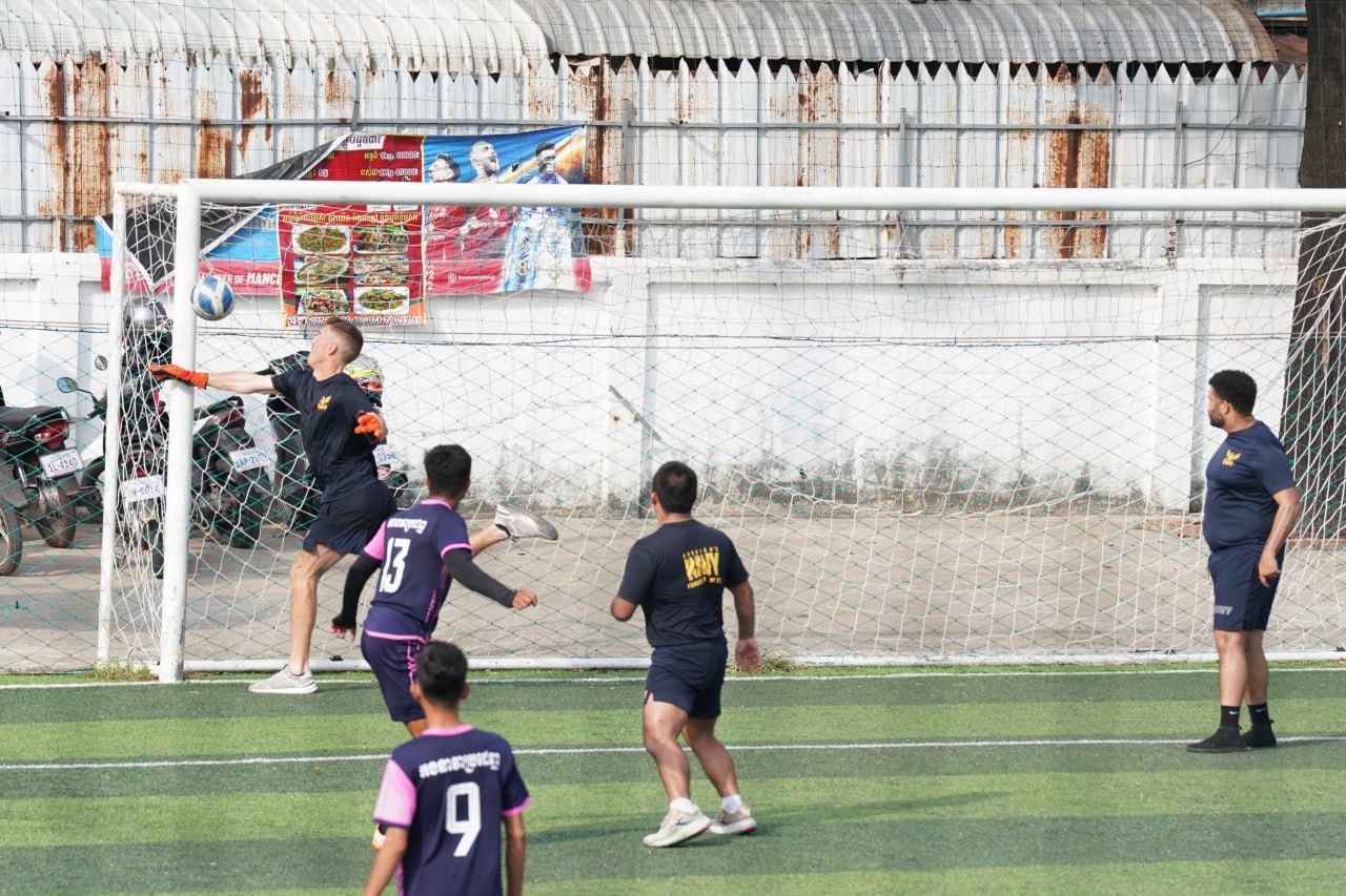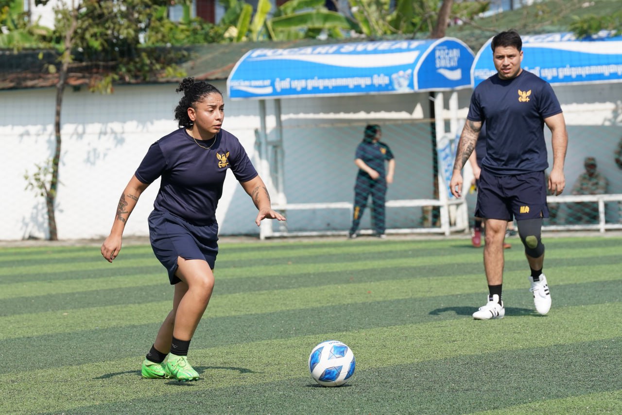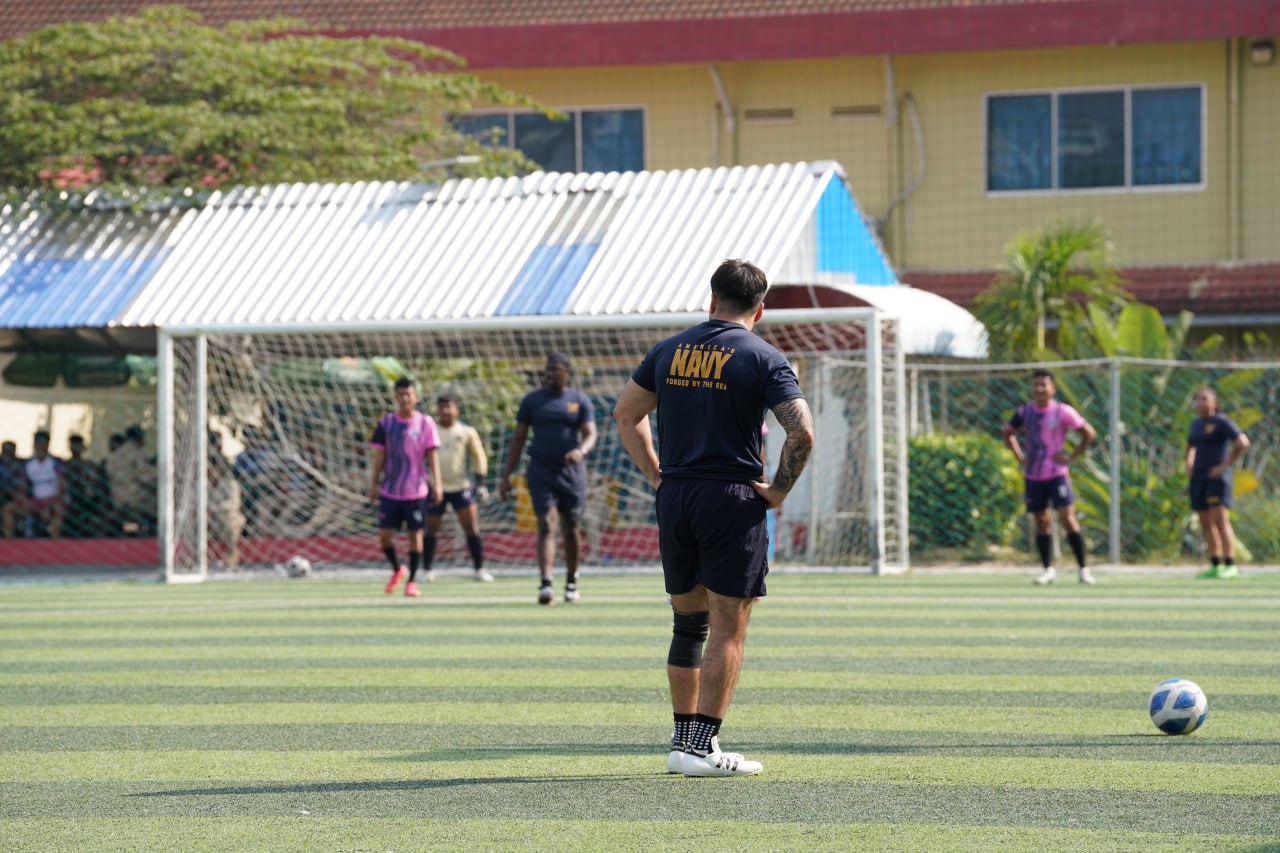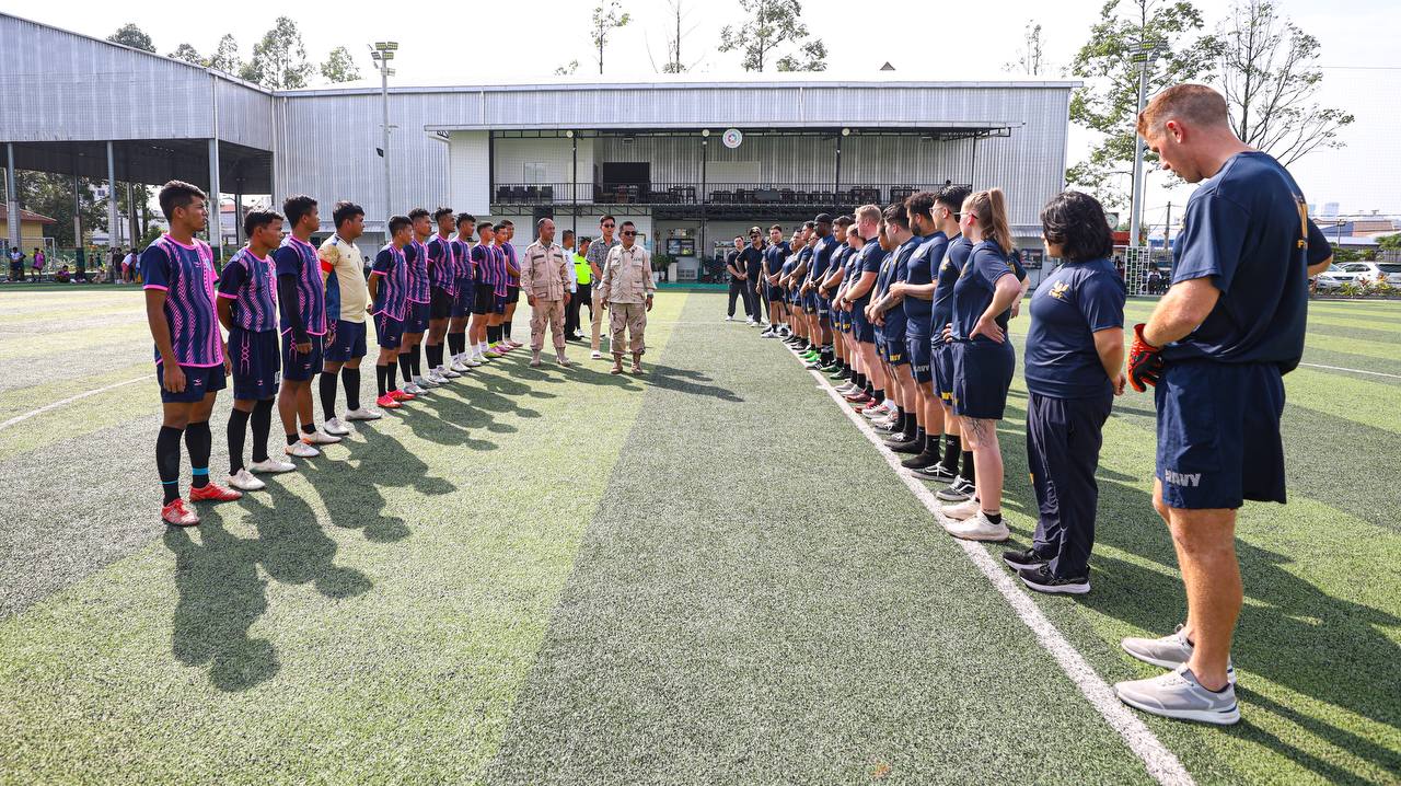 (ព្រះសីហនុ)៖ ក្រោយពេលចូលសំចតនៅមូលដ្ឋានសមុទ្ររាមក្រៅពីការធ្វើលំហាត់ហ្វឹកហ្វឺនរួមគ្នាហើយនោះ នៅរសៀលថ្ងៃអាទិត្យ ទី២៥ ខែមករា ឆ្នាំ២០២៦នេះ កងទ័ពជើងទឹករបស់កម្ពុជា និងអាមេរិក បានបើកការប្រកួតបាល់ទាត់ជាលក្ខណៈមិត្តភាពផងដែរ។
