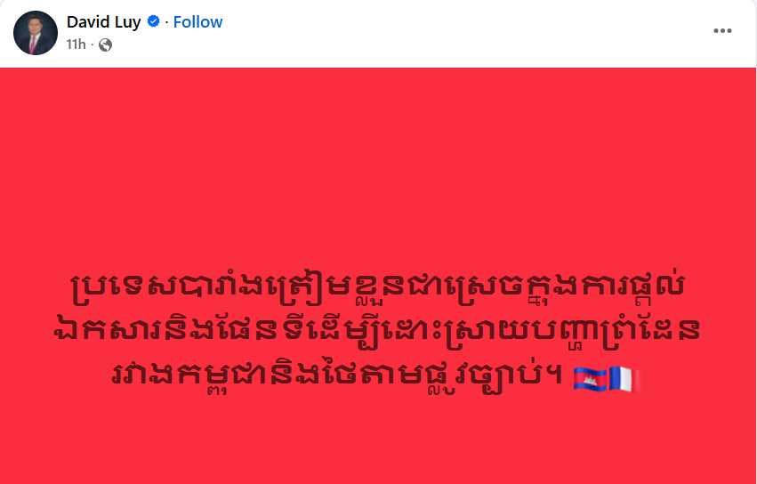 «ប្រទេសបារាំងត្រៀមខ្លួនជាស្រេចក្នុងការផ្ដល់ឯកសារ និងផែនទី ដើម្បីដោះស្រាយបញ្ហាព្រំដែនរវាងកម្ពុជា និងថៃ នៅតុលាការយុត្តិធម៌អន្តរជាតិ (ICJ)»។