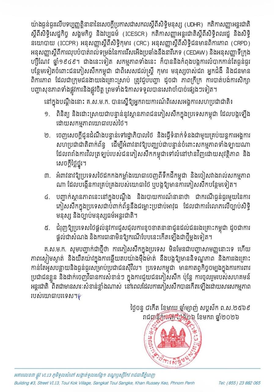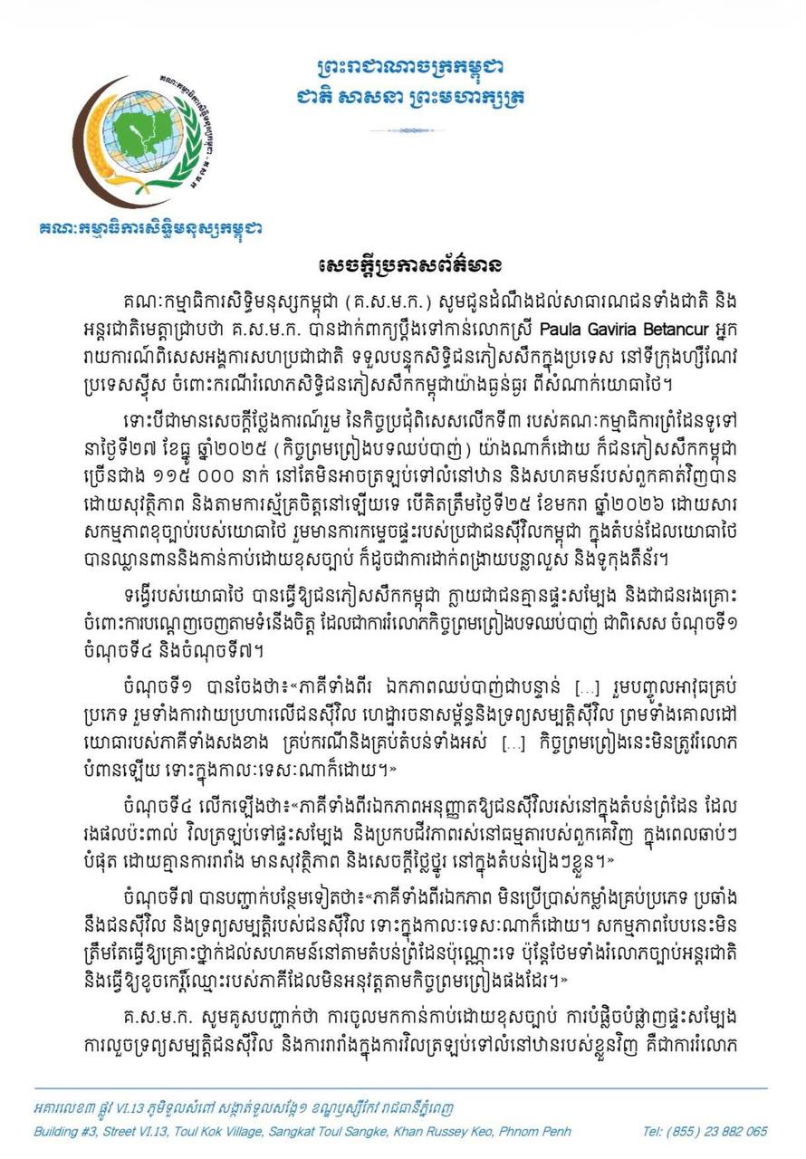 គណៈកម្មាធិការសិទ្ធិមនុស្សកម្ពុជា (គ.ស.ម.ក.) បានដាក់ពាក្យបណ្តឹង ទៅកាន់ លោកស្រី Paula Gaviria Betancur អ្នករាយការណ៍ពិសេសអង្គការសហប្រជាជាតិទទួលបន្ទុកសិទ្ធិជនភៀសសឹកក្នុងប្រទេស ដោយទាមទារឱ្យមានចំណាត់ការជាបន្ទាន់ និងយ៉ាងម៉ឺងម៉ាត់ ចំពោះសកម្មភាពខុច្បាប់របស់យោធាថៃ