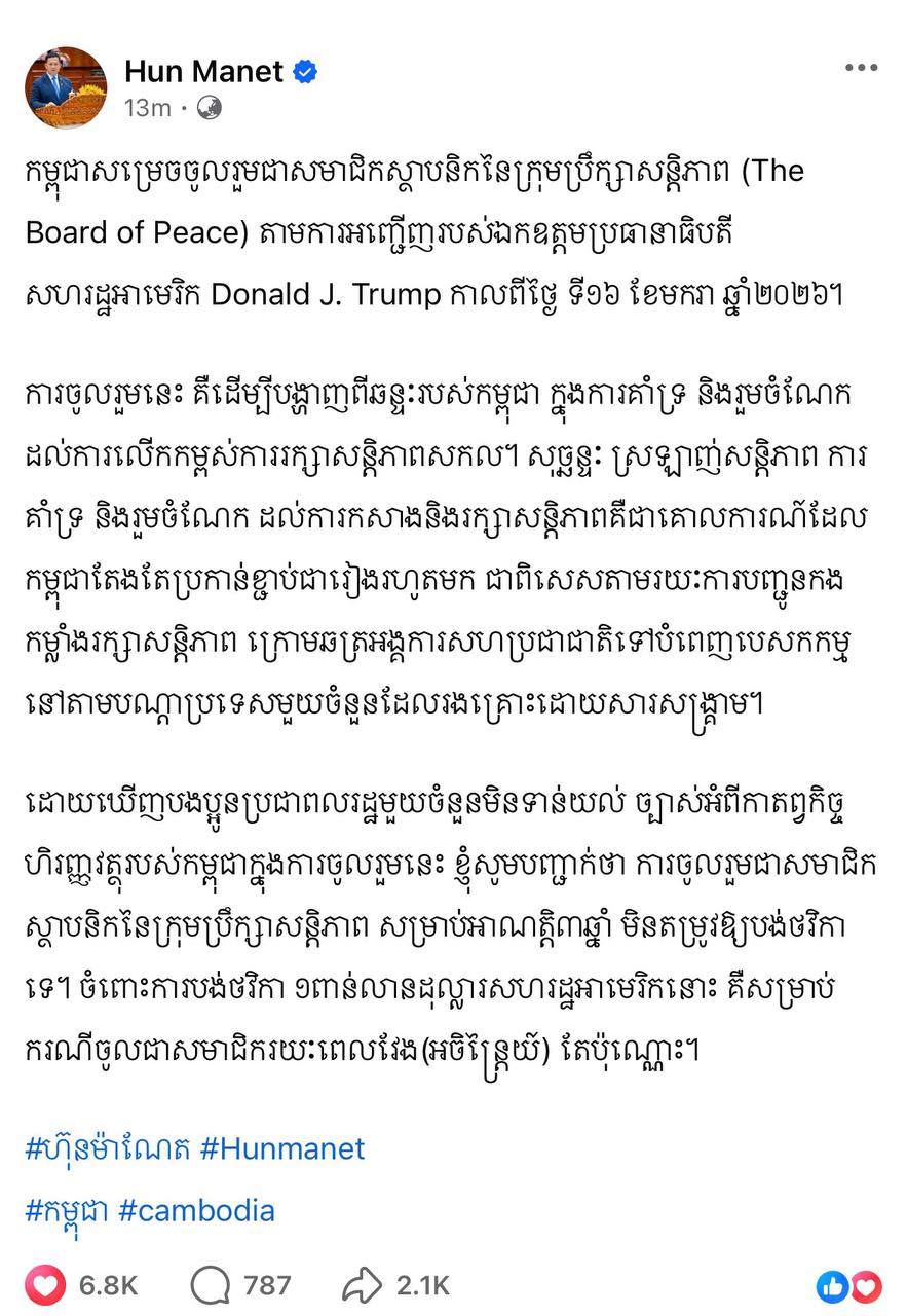 សម្តេចមហាបវរធិបតី ហ៊ុន ម៉ាណែត ៖ «កម្ពុជាសម្រេចចូលរួមជាសមាជិកស្ថាបនិកនៃក្រុមប្រឹក្សាសន្តិភាព (The Board of Peace) តាមការអញ្ជើញរបស់ឯកឧត្តមប្រធានាធិបតីសហរដ្ឋអាមេរិក Donald J. Trump កាលពីថ្ងៃទី១៦ ខែមករា ឆ្នាំ២០២៦។