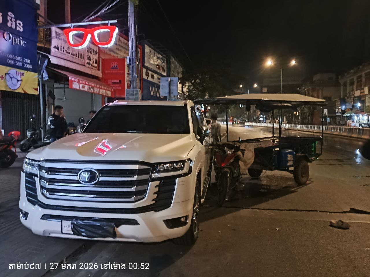 មនុស្សប្រុសស្រី៣នាក់ បានរងរបួស ខណះអ្នកបើកបររ៉ឺម៉កម៉ូតូងោកមួយភាំង ជ្រុលចង្កូតទៅបុករថយន្តស៊េរីទំនើបម៉ាកឡង់គ្រឺស័រមួយគ្រឿង កំពុងចតស្ងៀម