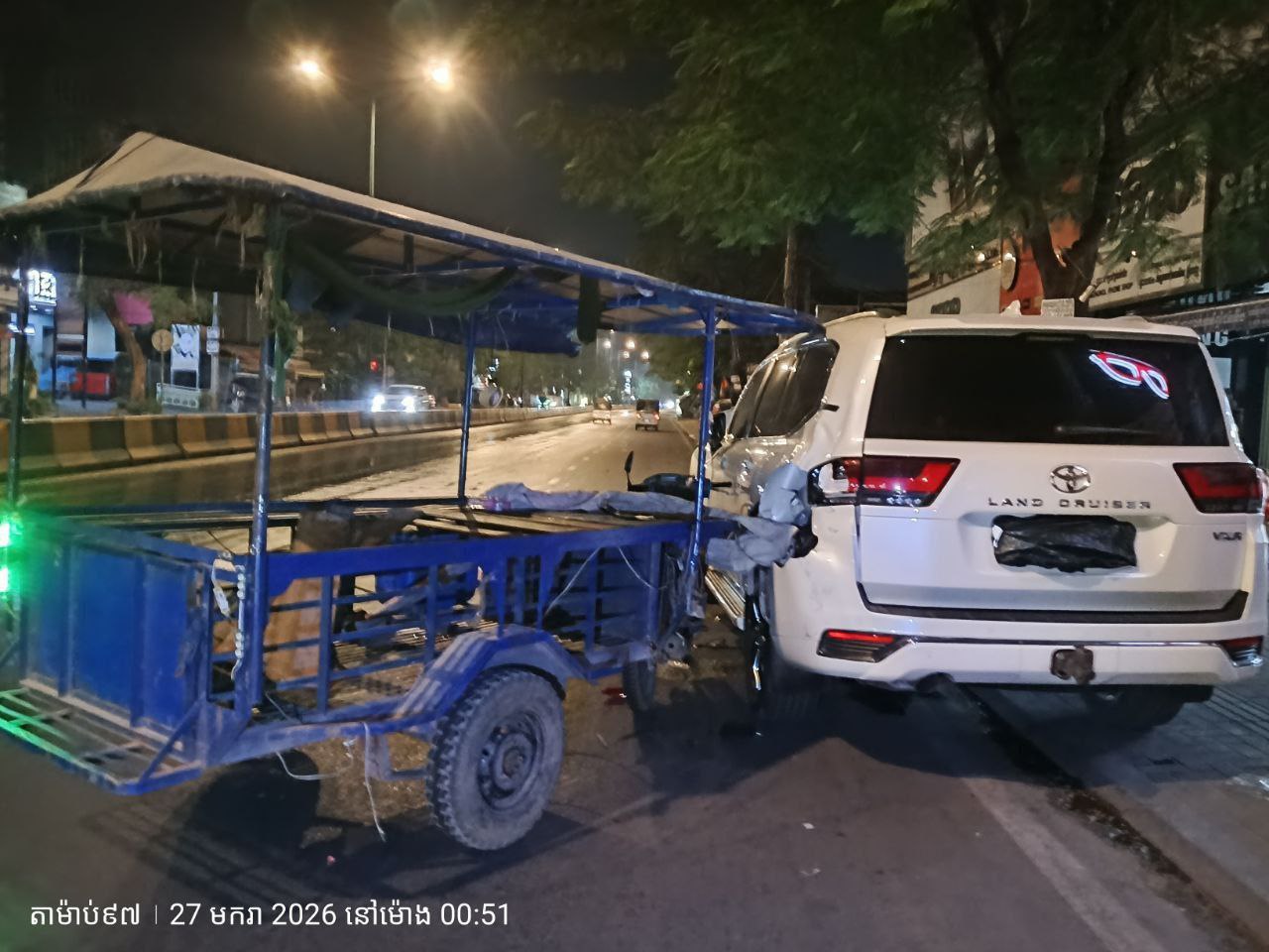 ប្រភពព័ត៌មានបានបញ្ជាក់ថា មនុស្សប្រុសស្រី៣នាក់បានរងរបួសខណះបុរសម្នាក់បើកម៉ូតូរឺម៉កមួយគ្រឿងមានអ្នករួមដំណើរ២នាក់ទៀត ហើយអ្នកបើកបរទំនងងងុយដេកក៏ងោកមួយភាំងជ្រុលចង្កូតទៅបុករថយន្តស៊េរីទំនើបម៉ាកឡង់គ្រឺស័រមួយគ្រឿងពាក់លេខភ្នំពេញ2BX-5353កំពុងចតស្ងៀមពីក្រោយខាងឆ្វេងរងការខូចខាតយ៉ាងដំណំ ។