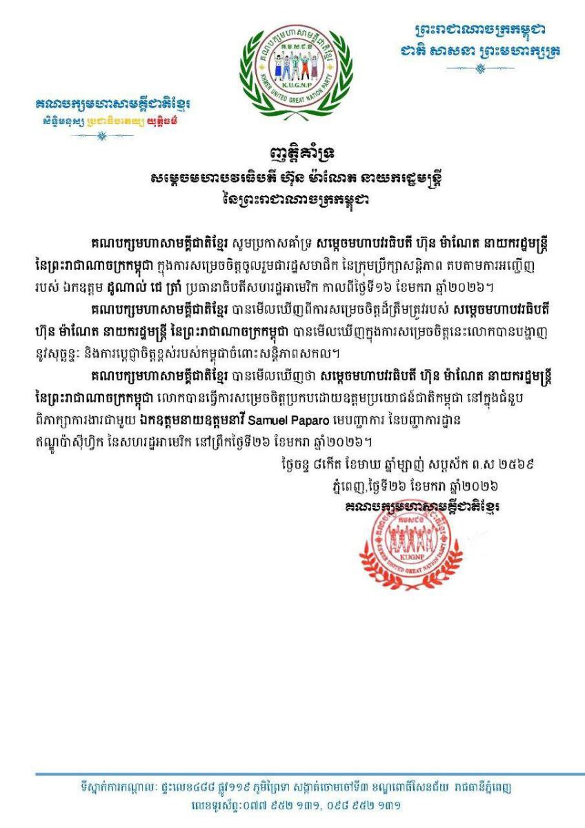 យោងតាមសេចក្តីប្រកាសគាំទ្ររបស់គណបក្សនយោបាយនានា និងអង្គការសង្គមស៊ីវិលដែលបានចេញដាច់ដោយឡែកពីគ្នាជាបន្តបន្ទាប់នាថ្ងៃទី២៧ ខែមករា ឆ្នាំ២០២៦នេះ បានលើកឡើងដោយស្រដៀងគ្នាថា ការសម្រេចចិត្តរបស់រាជរដ្ឋាភិបាលក្នុងការចូលរួមជាស្ថាបនិកនៃ«ក្រុមប្រឹក្សាសន្តិភាព»នេះ បានបង្ហាញយ៉ាងច្បាស់ ក្រឡែតនូវសុឆន្ទៈ ស្រឡាញ់សន្តិភាព រក្សាសន្តិភាព ការគាំទ្រ រួមចំណែកដល់ការកសាង និងការប្តេជ្ញាចិត្ត ដ៏ខ្ពង់ខ្ពស់ចំពោះសន្តិភាព ទាំងក្នុងតំបន់ និងសកល។
