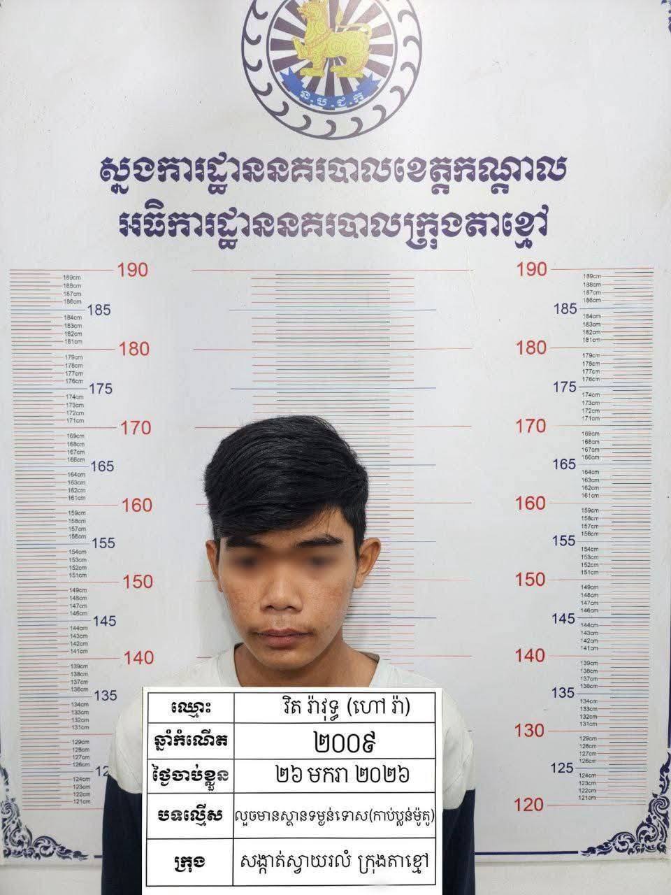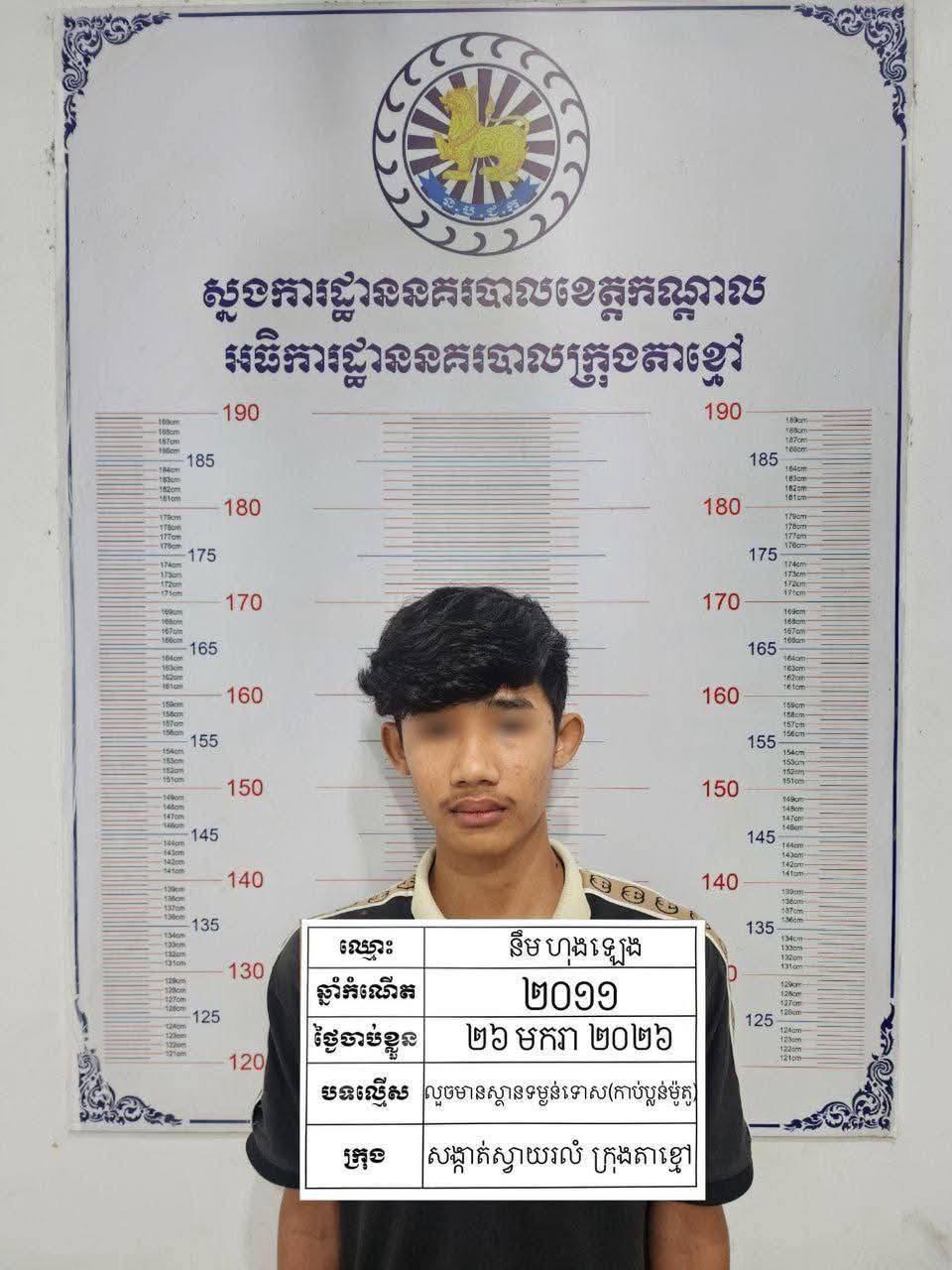 កណ្តាល ៖ ដោយអនុវត្តតាមបទបញ្ជារបស់ លោកឧត្តមសេនីយ៍ទោ ឈឿន សុចិត្ត ស្នងការ នៃស្នងការដ្ឋាននគរបាលខេត្តកណ្តាល នៅថ្ងៃទី២៦ ខែមករា ឆ្នាំ២០២៦ កម្លាំងនគរបាលព្រហ្មទណ្ឌ និង ប៉ុស្តិ៍នគរបាលរដ្ឋបាលស្វាយរលំ ដឹកនាំបញ្ជាដោយលោកវរសេនីយ៍ឯក យី វណ្ណដា អធិការនគរបាលក្រុងតាខ្មៅ ស្រាវជ្រាវឈានដល់ការបង្ក្រាបចំណុចលើផ្លូវ២១ ភូមិលេខ១ក សង្កាត់ស្វាយរលំ ក្រុងតាខ្មៅ ខេត្តកណ្តាល ឃាត់ខ្លួនជនសង្ស័យចំនួន២នាក់ ១-ឈ្មោះ វិត រ៉ាវុទ្ធ ភេទប្រុស អាយុ១៧ឆ្នាំ ជនជាតិខ្មែរ រស់នៅភូមិសាមគ្គី សង្កាត់ឬស្សី ខណ្ឌឬស្សីកែវ ភ្នំពេញ មុខរបរ សិស្ស ២-ឈ្មោះ នឹម ហុងឡេង ភេទប្រុស អាយុ១៥ឆ្នាំ ជនជាតិខ្មែរ មុខរបរសិស្ស ទីលំនៅភូមិព្រៃស្វាយ ឃុំព្រៃស្វាយ ស្រុកបឹងខ្នារ ខេត្តពោធិ៍សាត់ ។