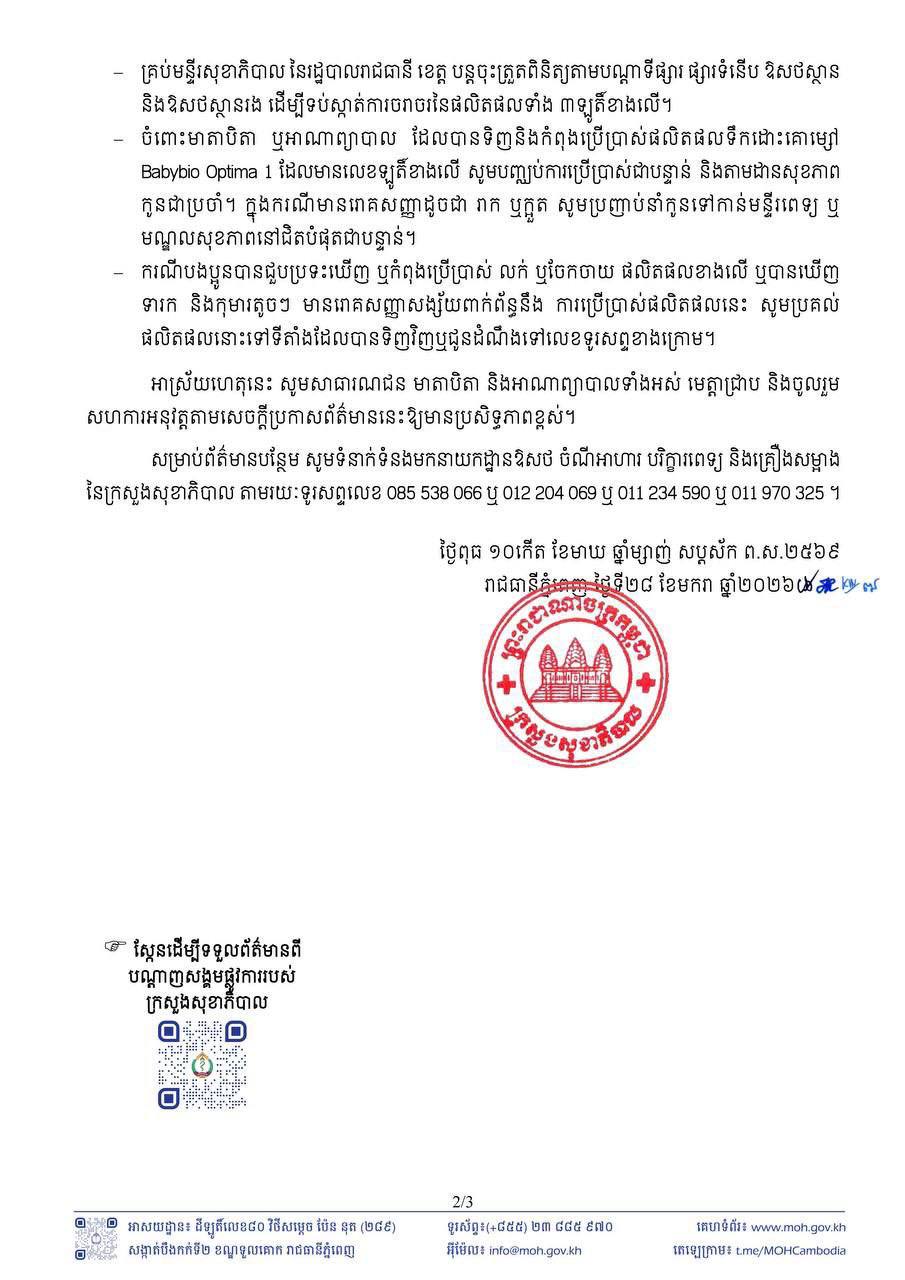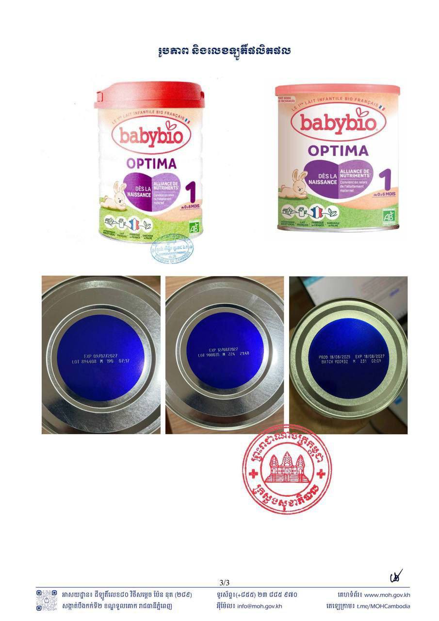ក្រសួងសុខាភិបាល | សេចក្តីប្រកាសព័ត៌មាន ស្តីពីការប្រមូលត្រឡប់ពីទីផ្សារ នូវផលិតផលទឹកដោះគោម្សៅ Babybio Optima 1 ដែលបង្កហានិភ័យដល់ទារក កុមារ និងអ្នកប្រើប្រាស់ទូទៅ