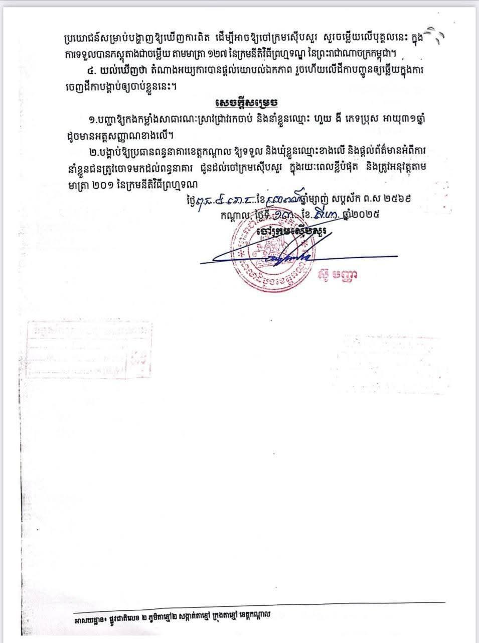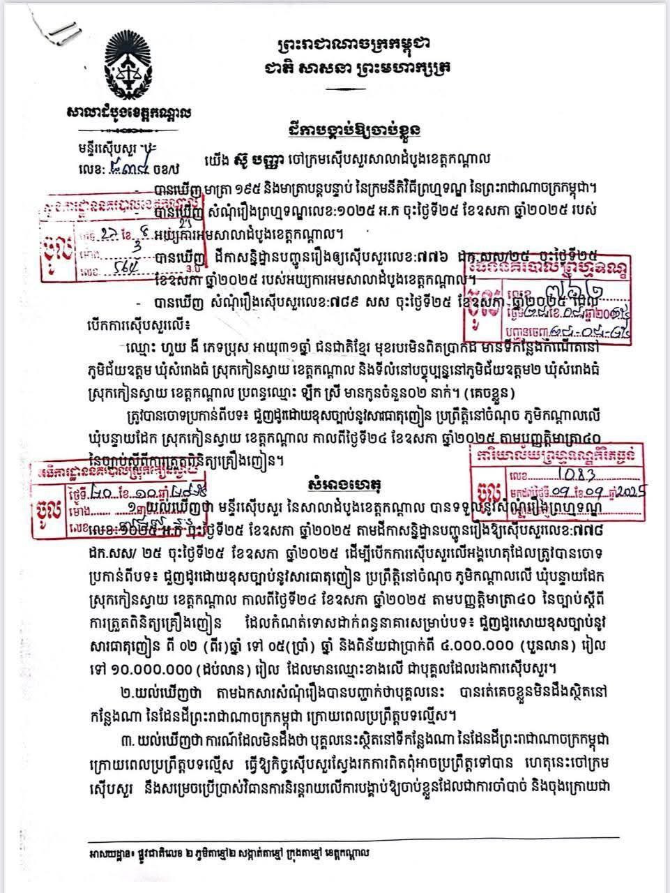 ជនសង្ស័យដែលត្រូវបានឃាត់ខ្លួនឈ្មោះ អូន បូរ៉ាន់ ហៅរ៉ាន់ ភេទ ប្រុស អាយុ ៣៨ឆ្នាំ មុខរបរមិនពិតប្រាកដ រស់នៅភូមិបែកគោ សង្កាត់បឹងទំពន់ ខណ្ឌមានជ័យ រាជធានីភ្នំពេញ (មានសារធាតុញៀនក្នុងទឹកនោម)។ ចំណែកឯជនរងគ្រោះជាម្ចាស់ម៉ូតូមានឈ្មោះ ហ៊ុំ រុន ភេទស្រី អាយុ ៤១ឆ្នាំ មុខរបរកសិករ រស់នៅភូមិឃុំកើតហេតុ។ វត្ថុតាងដែលដកហូតបានរួមមាន ទូរស័ព្ទដៃម៉ាក SAMSUNG ១ គ្រឿង។ រីឯម៉ូតូរបស់ជនរងគ្រោះម៉ាក Honda Dream C125 ឆ្នាំ២០១៩ ពណ៌ខ្មៅ ពាក់ផ្លាកលេខ បន្ទាយមានជ័យ 1S-4523 ត្រូវបានប្រគល់ជូនម្ចាស់ដើមវិញ។