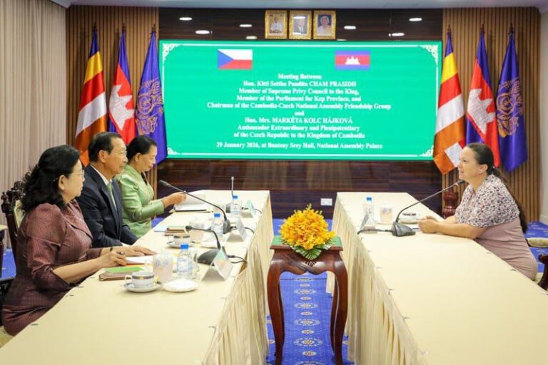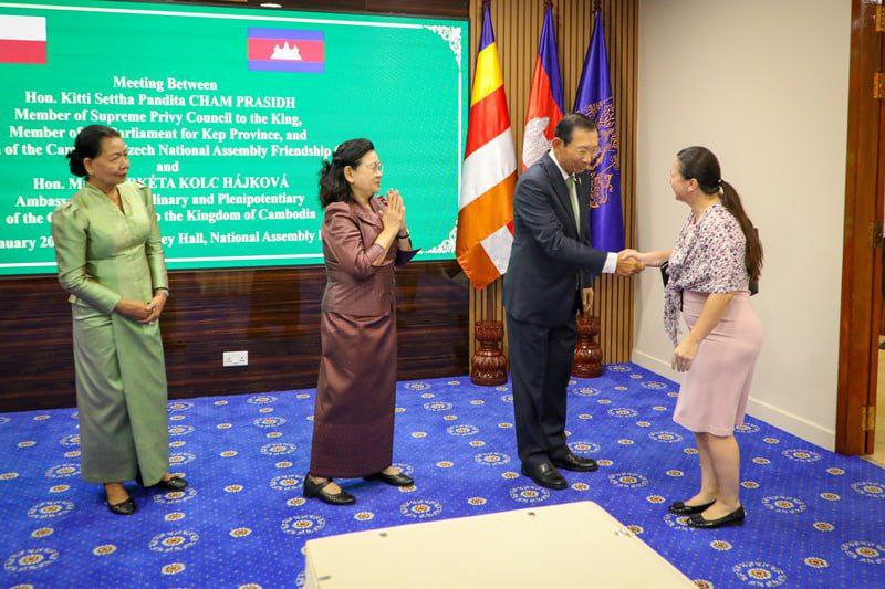 ភ្នំពេញ៖ នៅថ្ងៃទី២៩ ខែមករា ឆ្នាំ២០២៦ ឯកឧត្តមកិត្តិសេដ្ឋាបណ្ឌិត ចម ប្រសិទ្ធ ឧត្តមទីប្រឹក្សាផ្ទាល់ព្រះមហាក្សត្រ នៃព្រះរាជាណាចក្រកម្ពុជា និងជាប្រធានក្រុមមិត្តភាពរដ្ឋសភាកម្ពុជា- ឆែក បានជួបពិភាក្សាការងារជាមួយលោកជំទាវ ម៉ាកេតា កូល ហៃកូវ៉ា (Markéta Kolc Hájková) ឯកអគ្គរដ្ឋទូតឆែកនៅវិមានរដ្ឋសភា។
