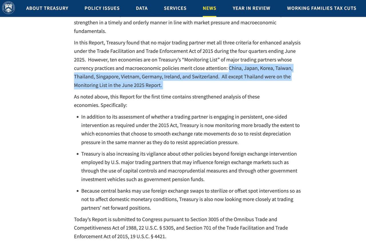 ប្រទេសក្នុងបញ្ជីតាមដានចំនួន ១០ រួមទាំងប្រទេសចិន ជប៉ុន និងកូរ៉េ ដោយថៃ ចូលក្នុងបញ្ជីនេះជាលើកដំបូង។ អាមេរិកនឹងត្រួតពិនិត្យយ៉ាងដិតដល់លើអន្តរាគមន៍ទីផ្សារូបិយប័ណ្ណ ឬគោលនយោបាយដែលមានឥទ្ធិពលលើអត្រាប្តូរប្រាក់ដោយមិនត្រឹមត្រូវ៕