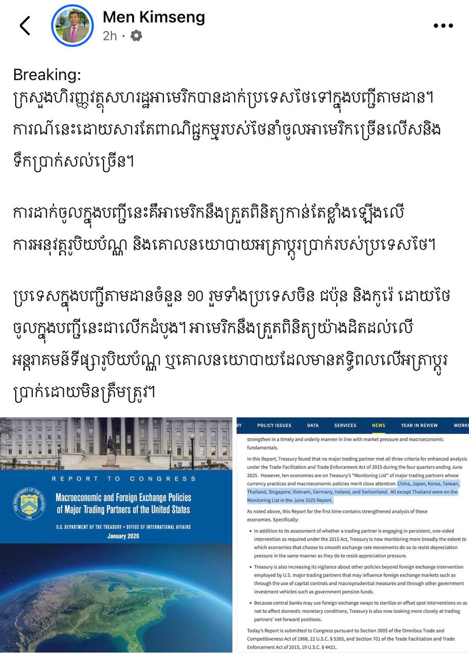 នៅថ្ងៃទី៣០ ខែមករា ឆ្នាំ២០២៦ យោងតាមការបង្ហោះផ្សាយនៅលើបណ្តាញសង្គមរបស់ Men Kimseng អ្នករាយការណ៍ព័ត៌មាន VOA ប្រចាំរដ្ឋធានីវ៉ាស៊ីនតោន សហរដ្ឋអាមេរិក មានខ្លឹមសារដូចតទៅ ៖