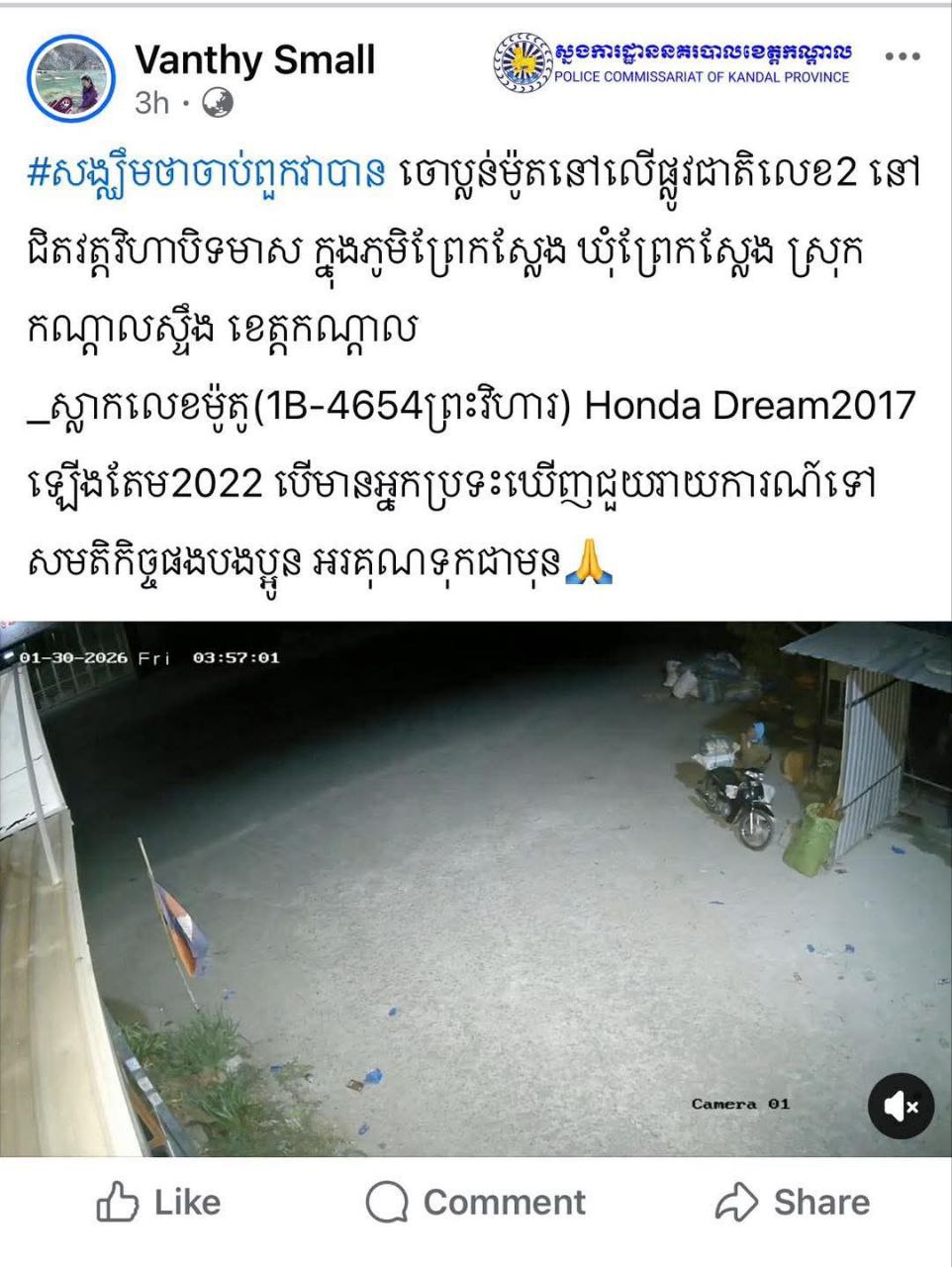 ខេត្តកណ្ដាល៖ ក្រុមការងារព័ត៌មាន និងប្រតិកម្មរហ័ស នៃស្នងការដ្ឋាននគរបាលខេត្តកណ្តាល មានកិត្តិយសសូមបំភ្លឺជូនសាធារណជនពាក់ព័ន្ធគណនីហ្វេសប៊ុកឈ្មោះ Vanthy Smallនិងបណ្តាញសង្គមបានបង្ហោះ ផ្សព្វផ្សាយវីដេអូពីកាមេរ៉ាសុវត្ថិភាព ជាបន្តបន្ទាប់ អមដោយខ្លឹមសារថា៖ សង្ឃឹមចាប់ពួកវាបាន ចោរប្លន់ម៉ូតូនៅលើផ្លូវជាតិលេខ២ នៅជិតវត្តវិហារបិទមាស ក្នុងភូមិព្រែកស្លែង ឃុំព្រែកស្លែង ស្រុកកណ្ដាលស្ទឹង ខេត្តកណ្ដាល។